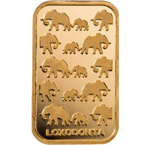 On the reverse side of 1 oz Rand Refinery Gold Bars is a depiction of the largest resident of the African continent: the bush elephant. A small herd of bush elephants is depicted in a marching row on the reverse and it repeats down the face of the bar. Each row shows the animals marching in the opposite direction from the previous row, alternating in left-to-right and right-to-left poses.