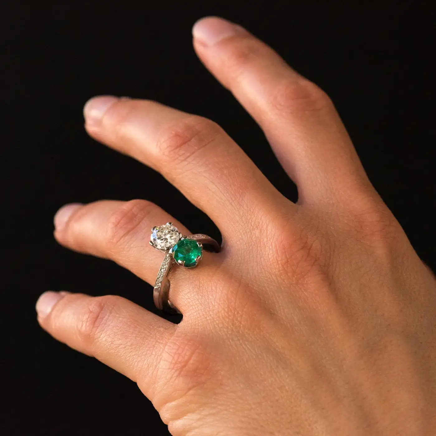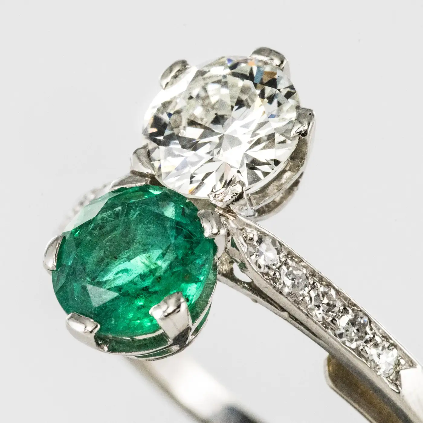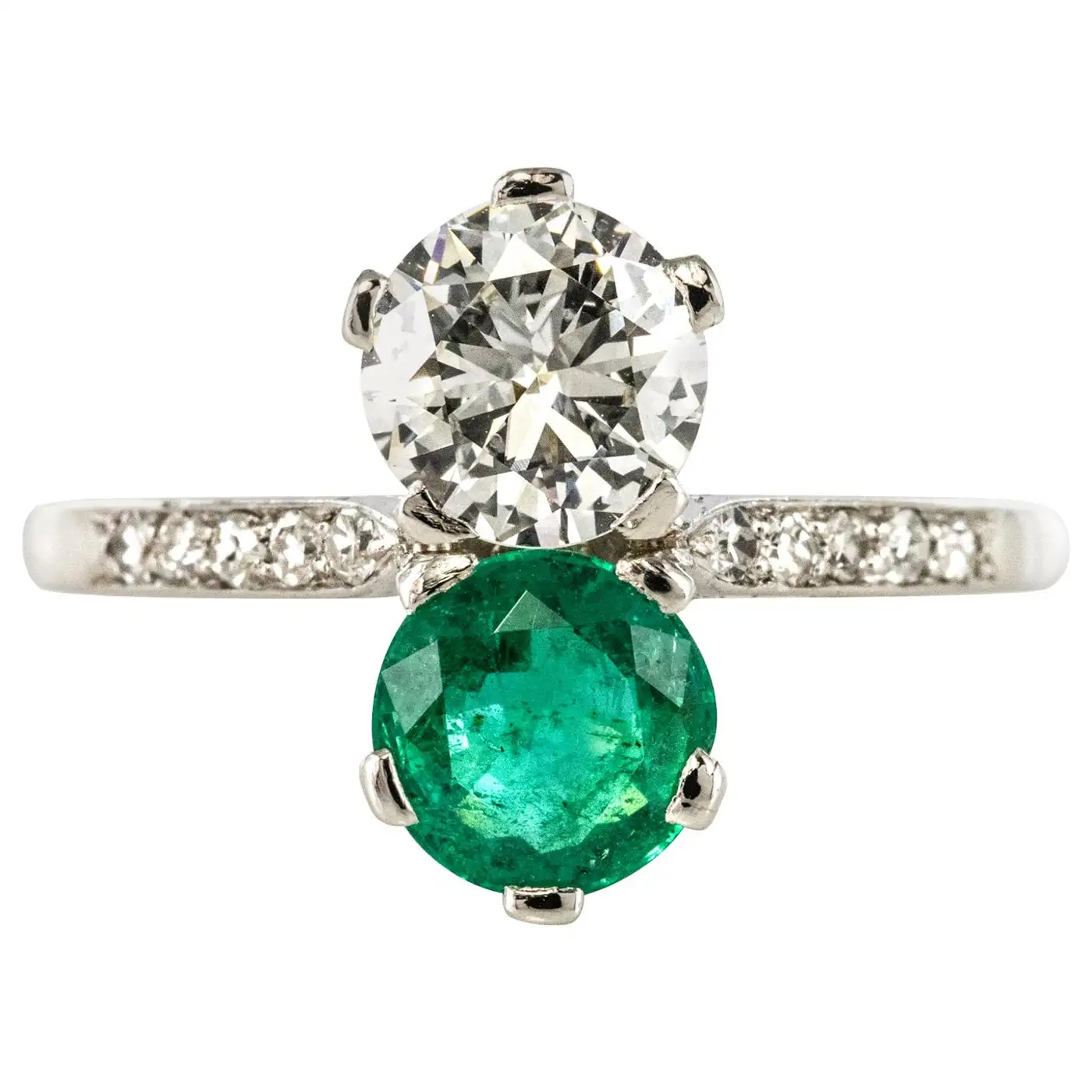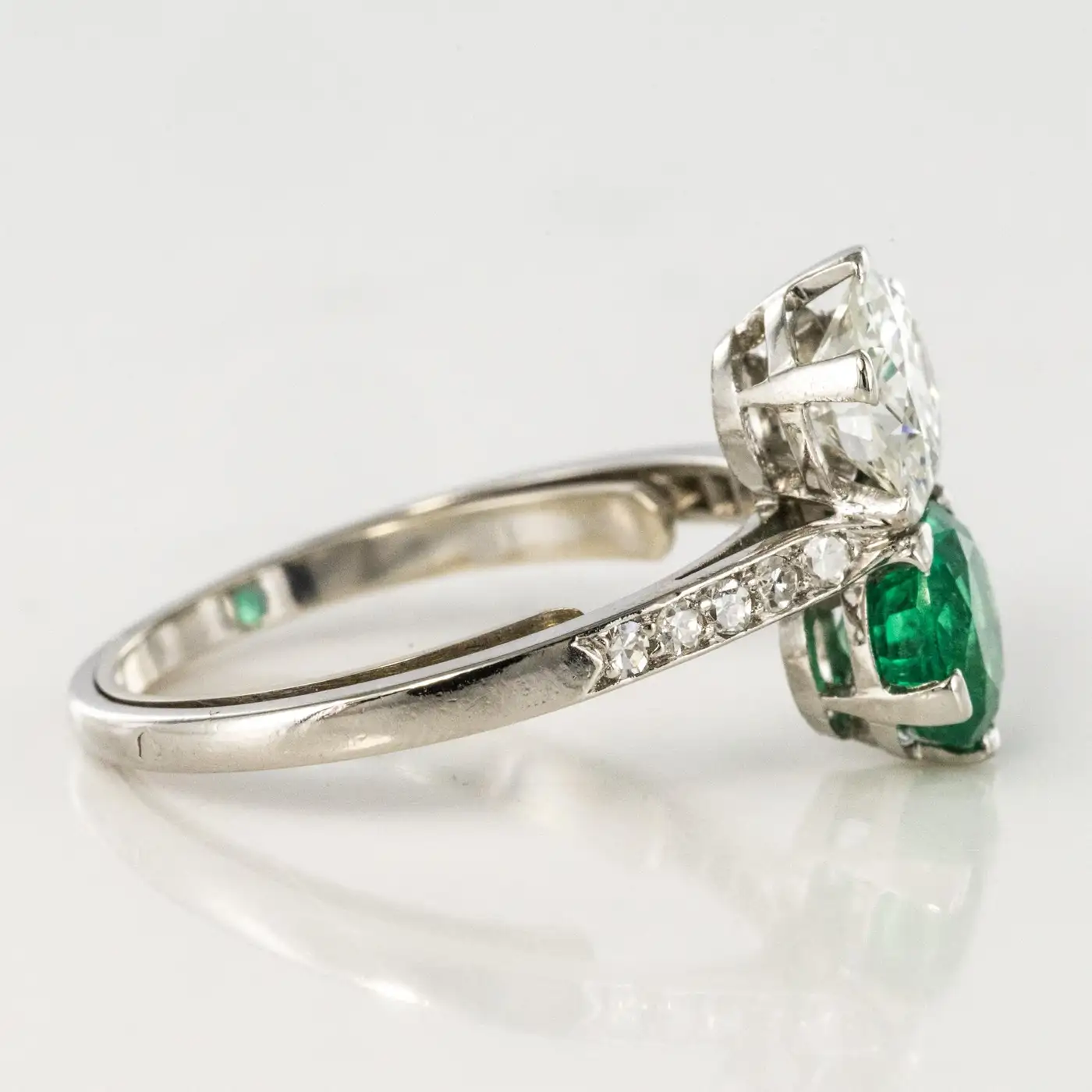1930s French Platinum Art Deco Emerald Diamond “You and Me” Ring