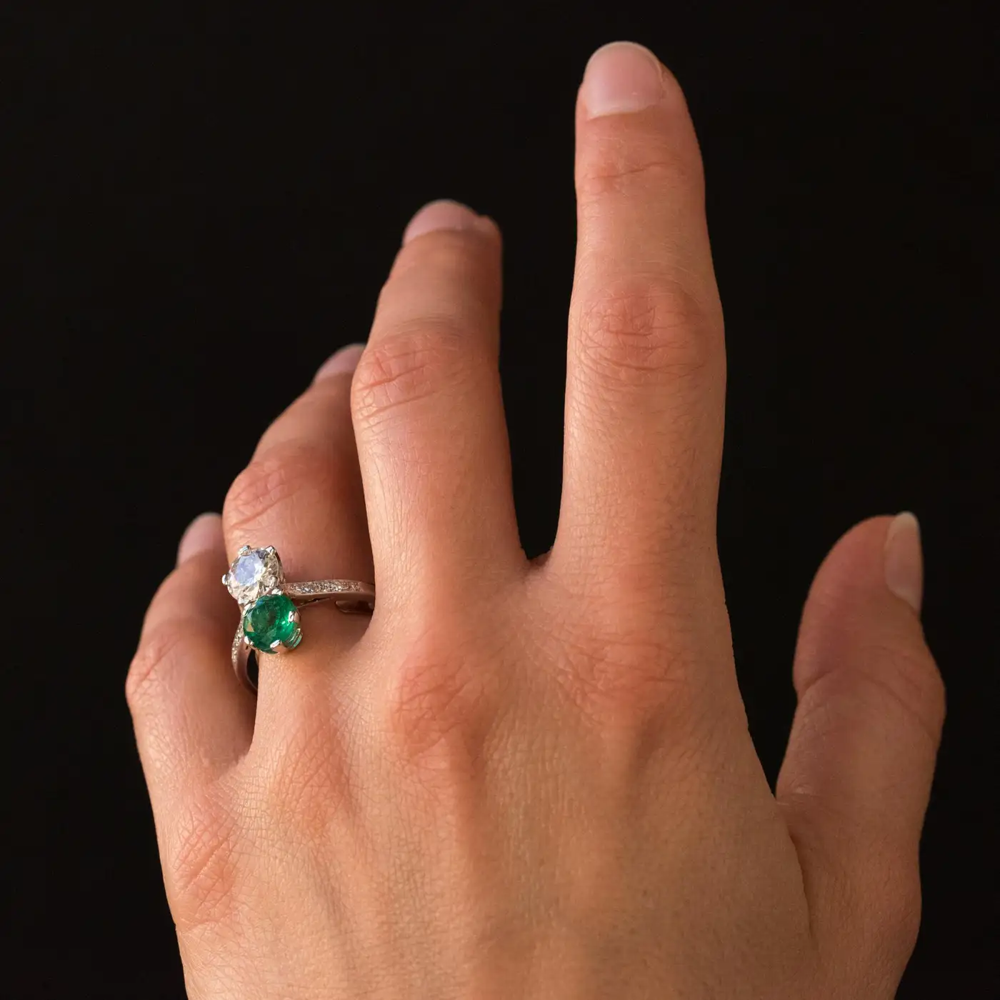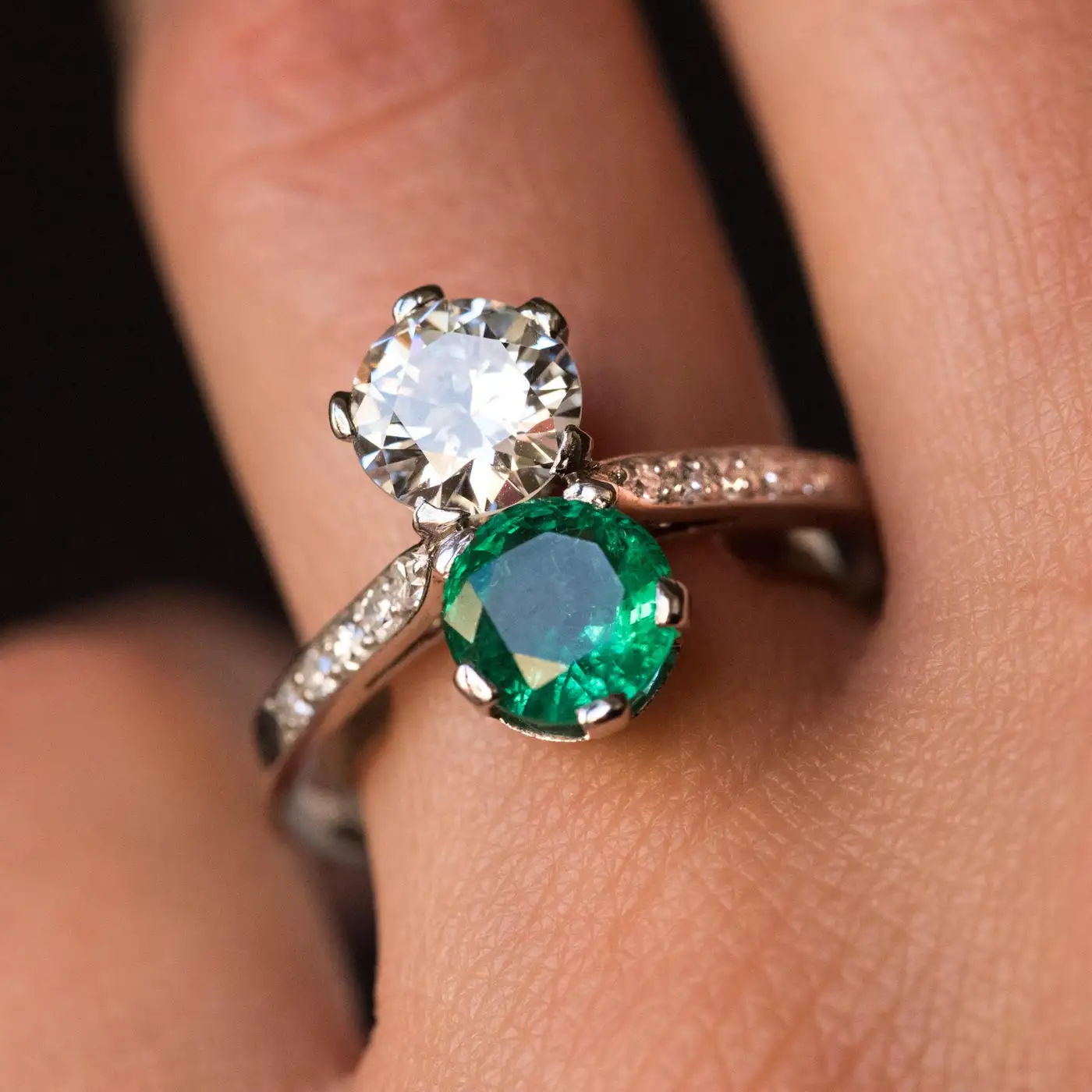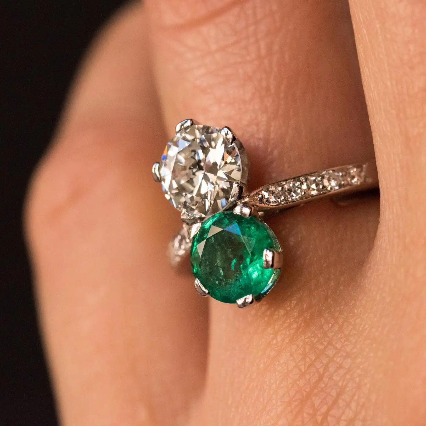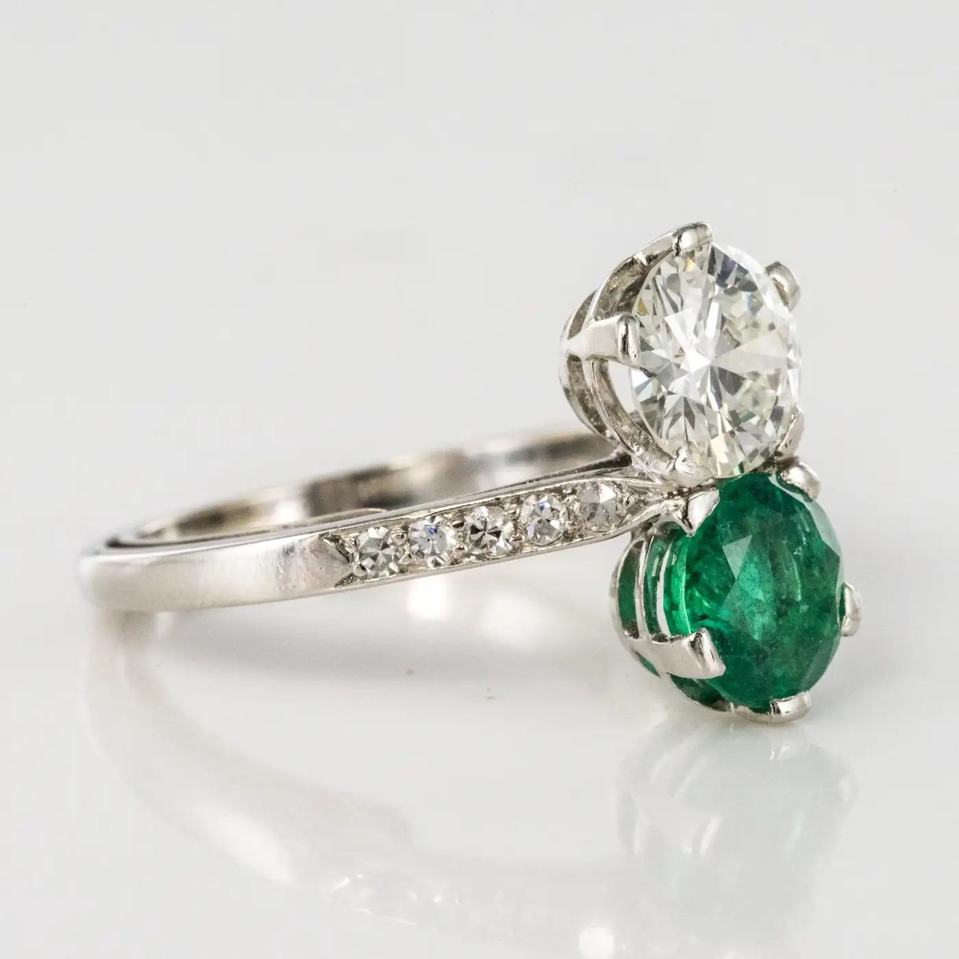 1930s French Platinum Art Deco Emerald Diamond “You and Me” Ring