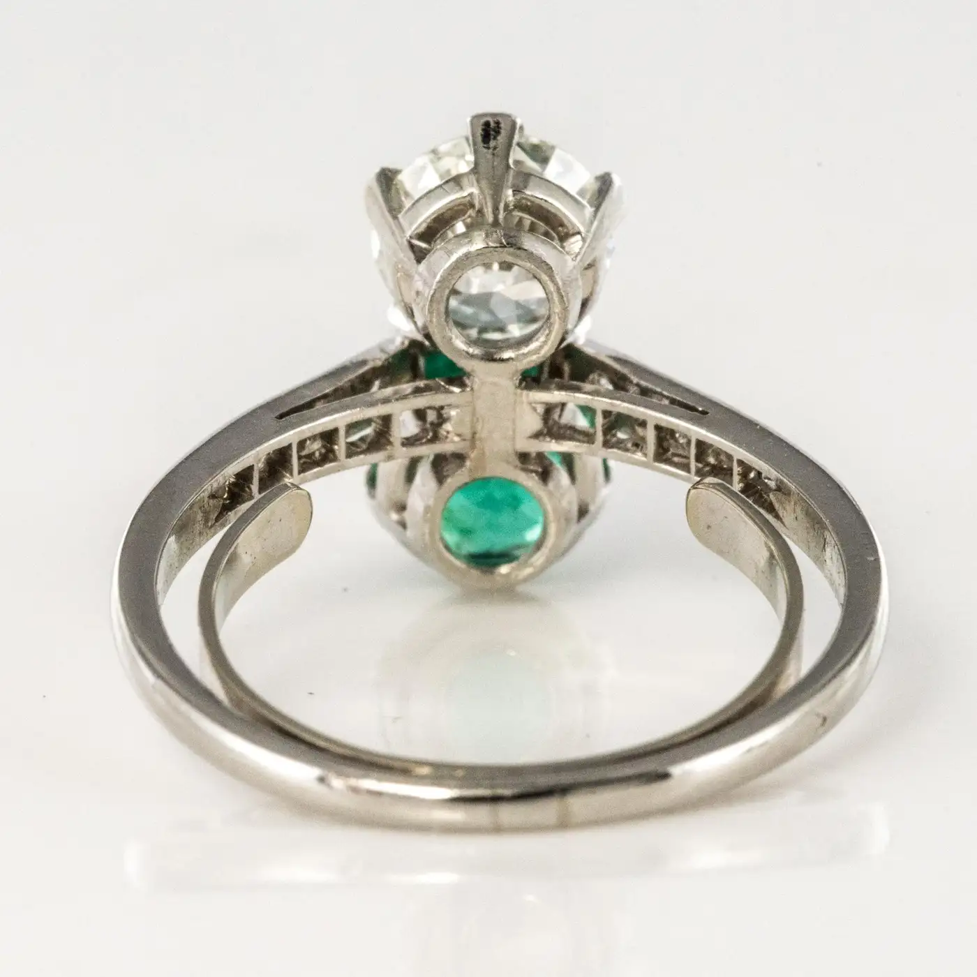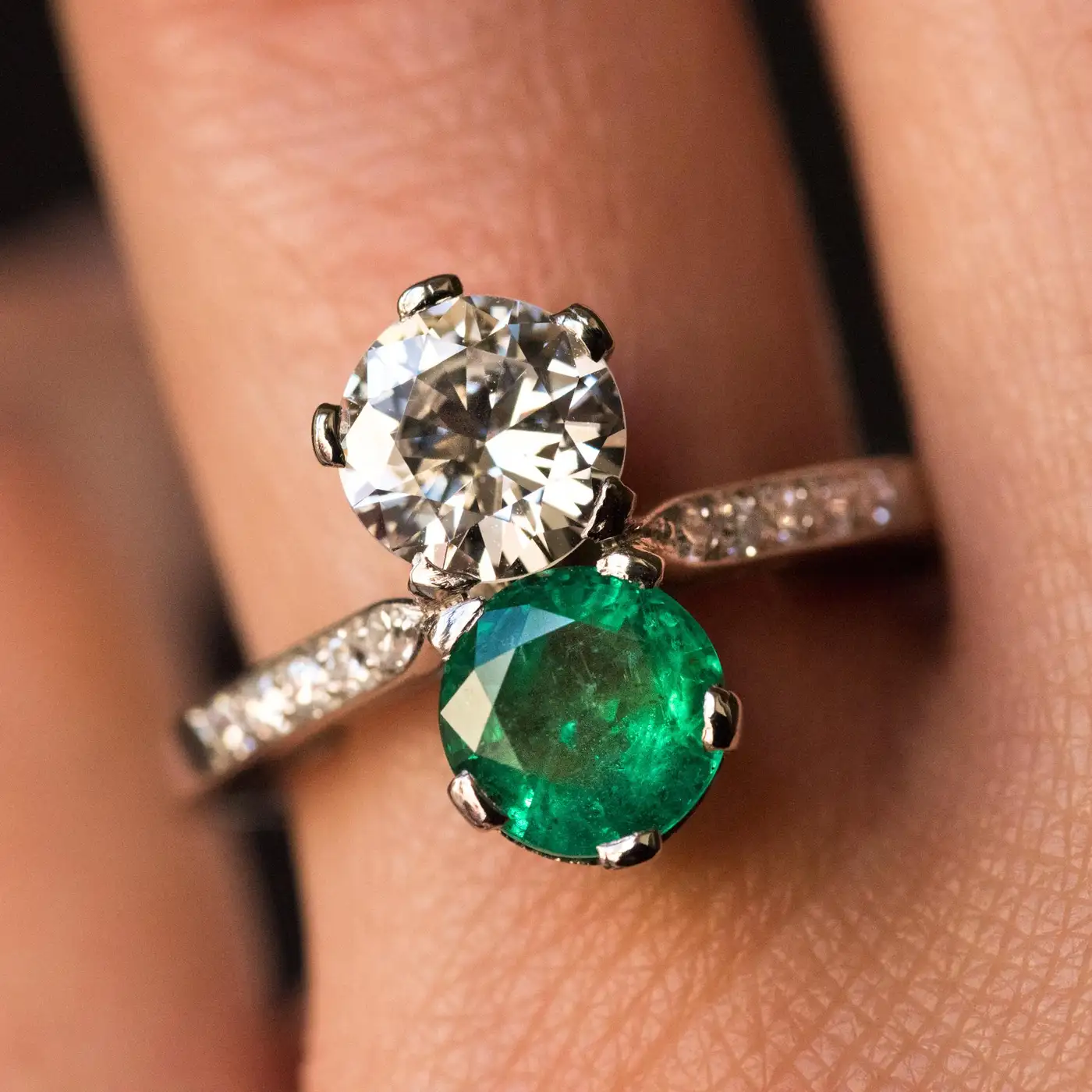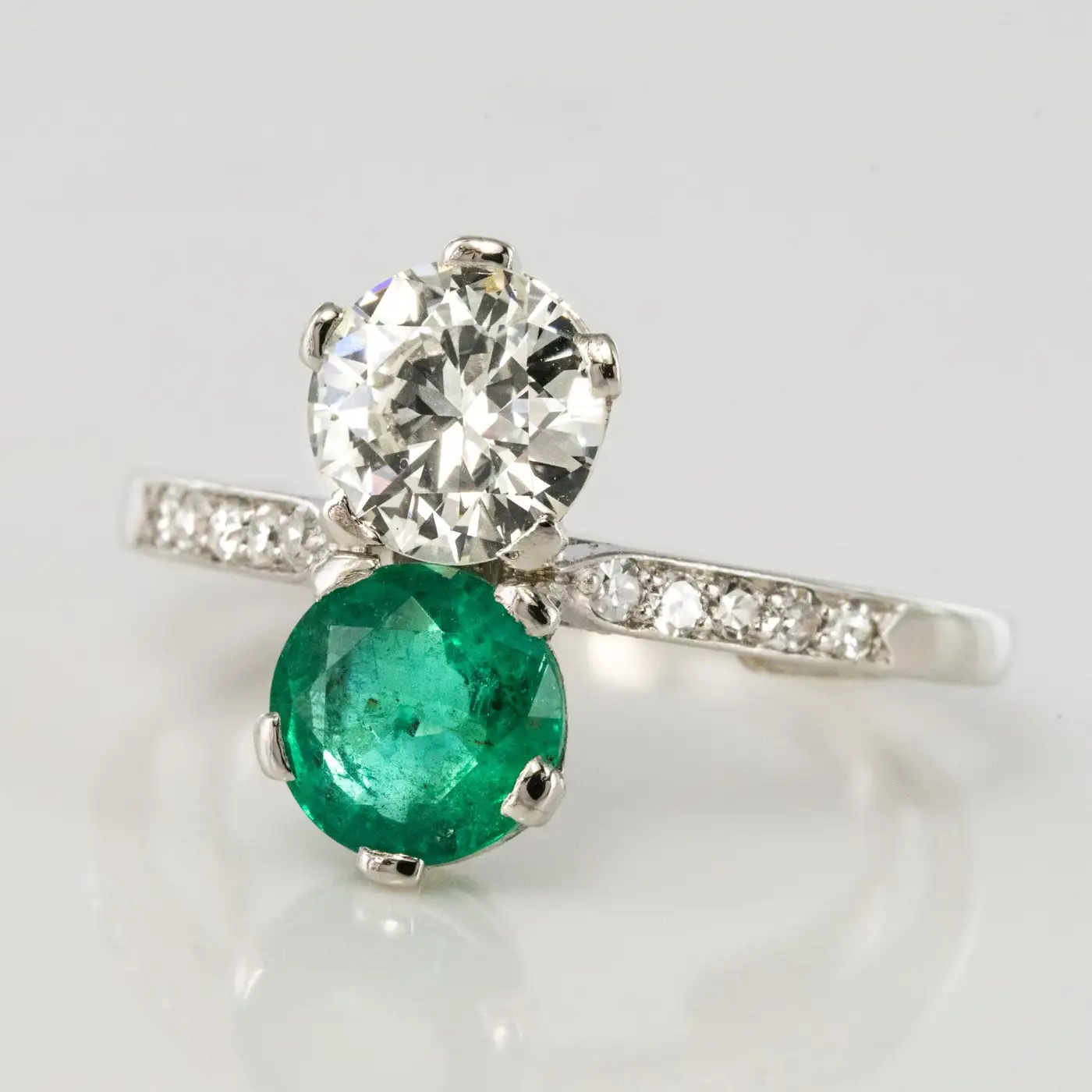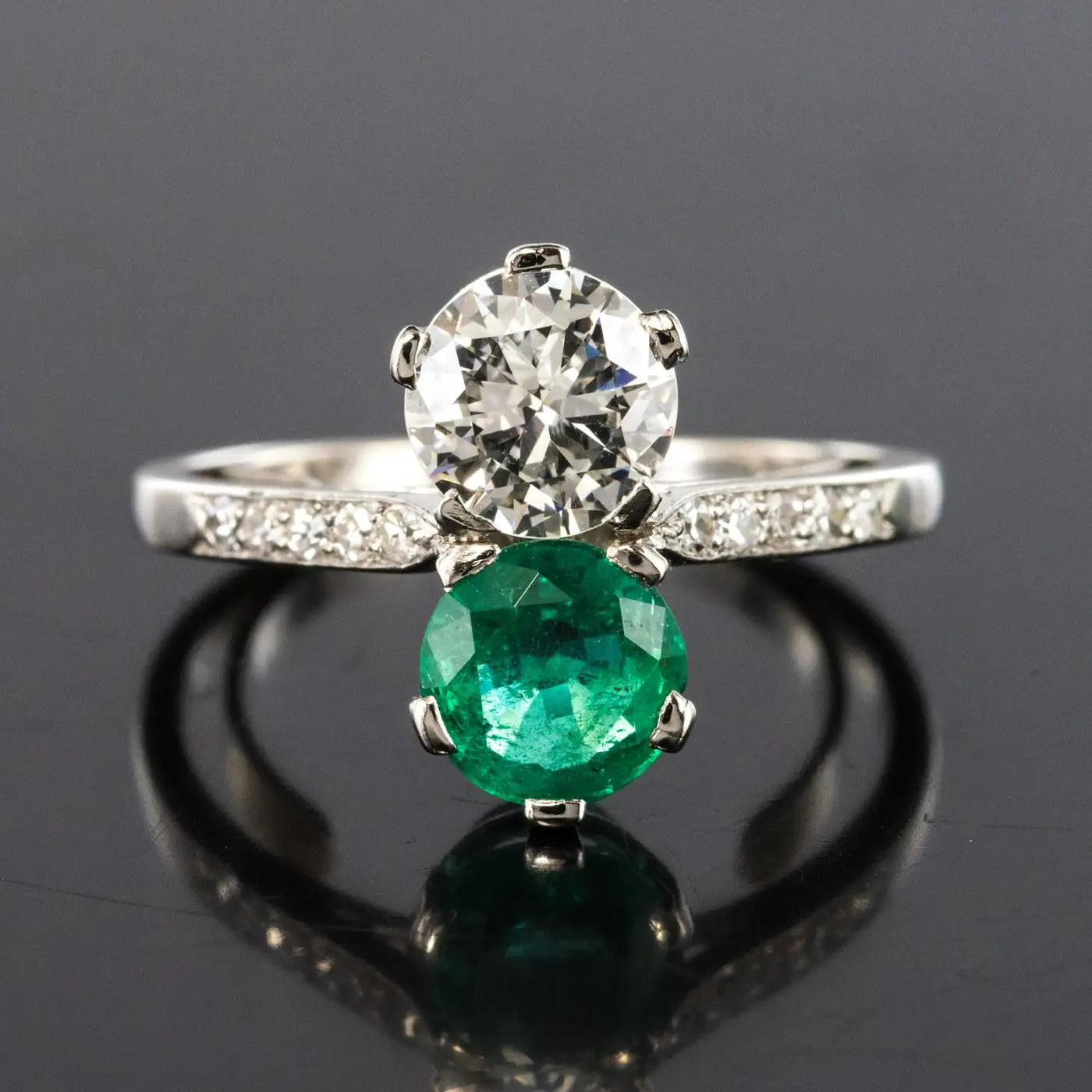 1930s French Platinum Art Deco Emerald Diamond “You and Me” Ring