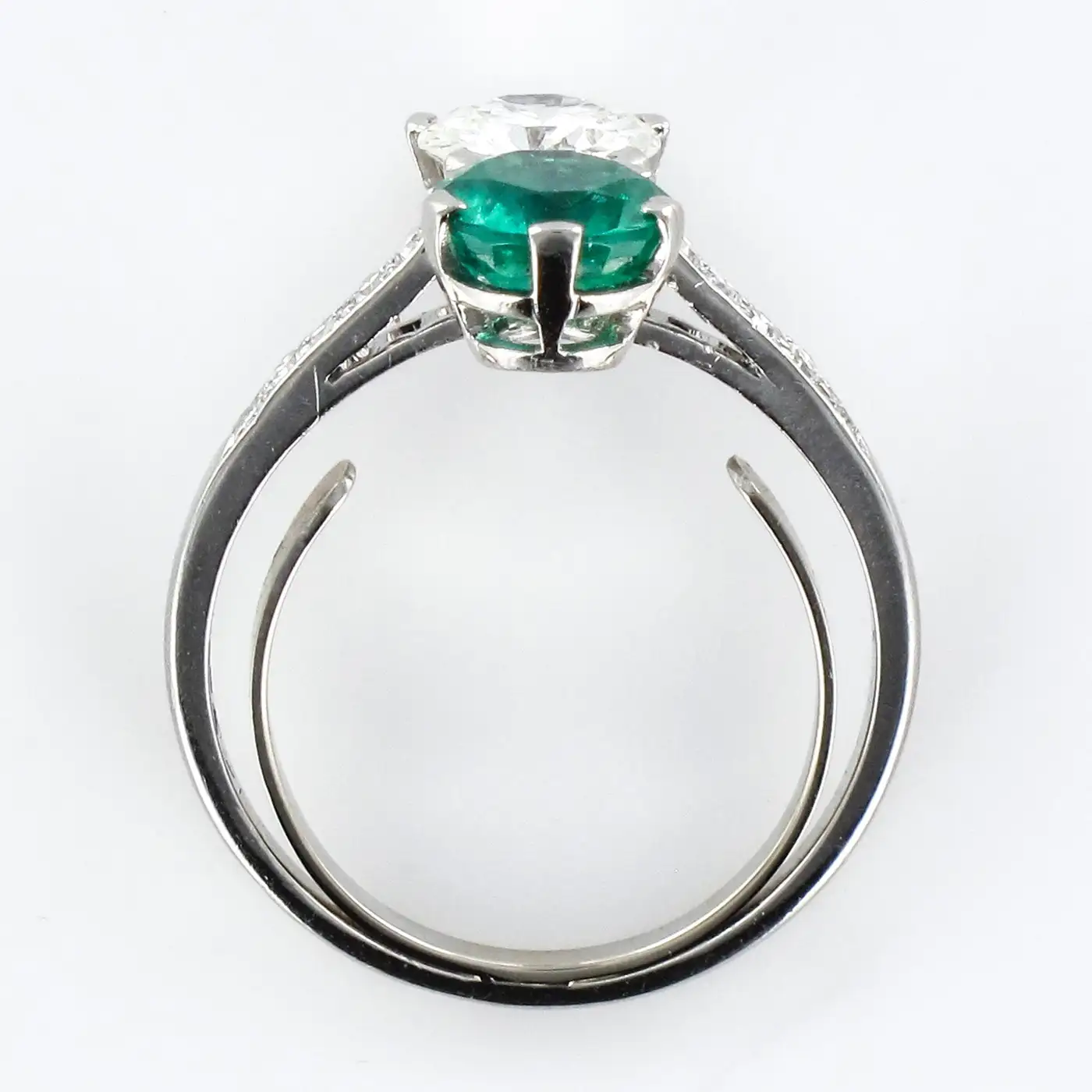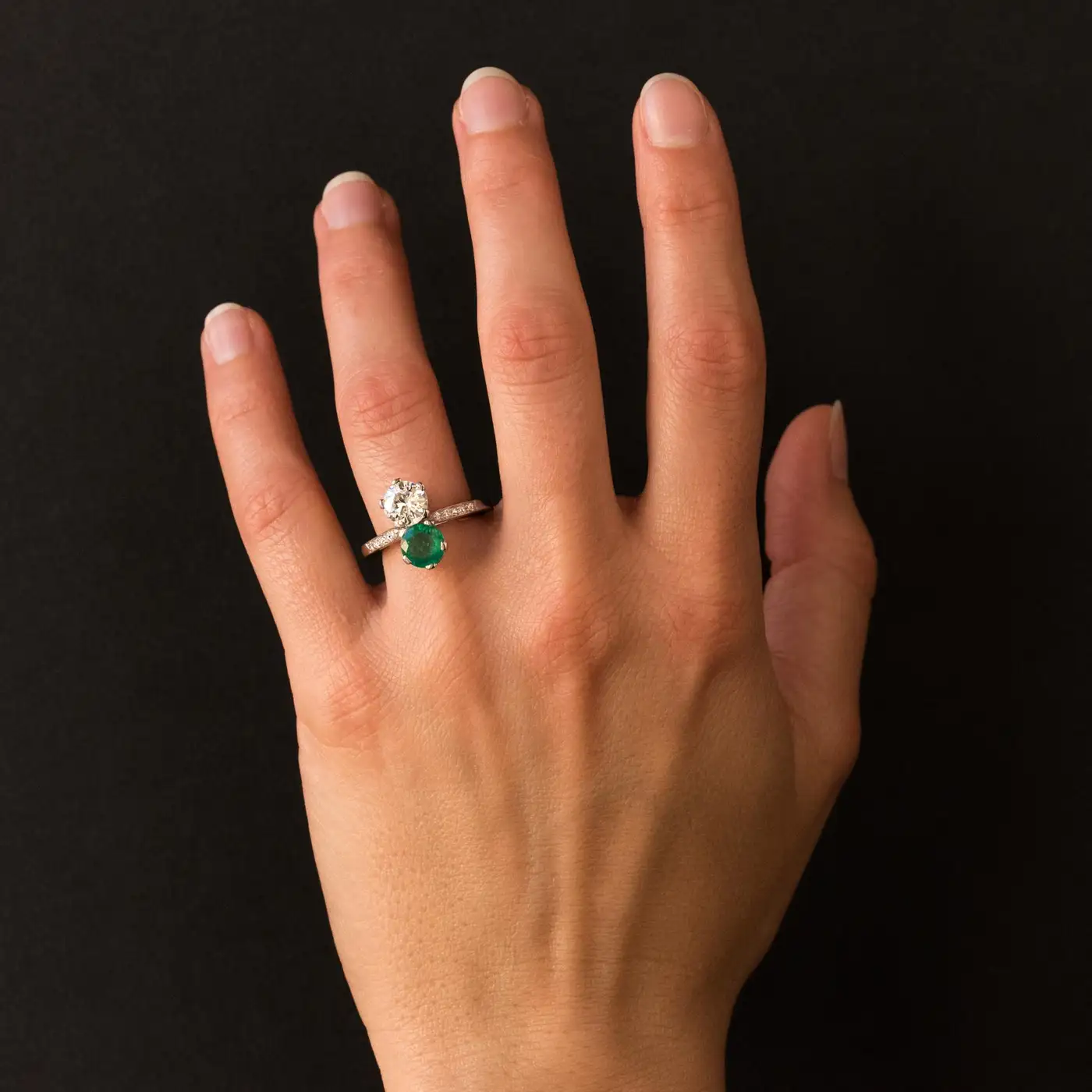 Ring in platinum, dog”s head hallmark. Called “you and me”, this ring is set with a brilliant- cut diamond and a round emerald. On both sides, on the departure of the ring is set a line of diamonds 8/8 cut. A spring ring, currently present on the ring may, if necessary, be removed.