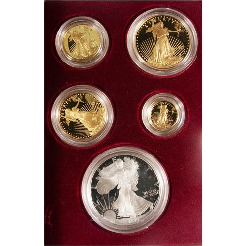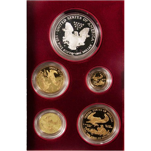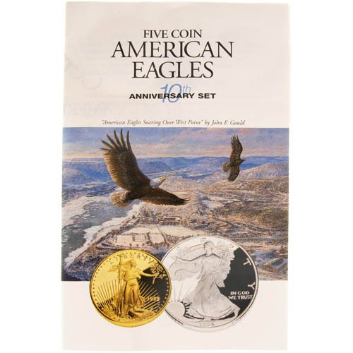 Each 1995-W Proof American Eagle 10th-Anniversary 5-Coin Set comes to you in this Omega Bullion listing with its original display box. The commemorative display houses one 1995 American Silver Eagle and four 1995 American Gold Eagle coins. The Proof Gold Eagles include weights of 1 oz, 1/2 oz, 1/4 oz, and 1/10 oz gold, while the Proof Silver Eagle has 1 Troy oz of .999 pure silver. A Certificate of Authenticity is available with the set.