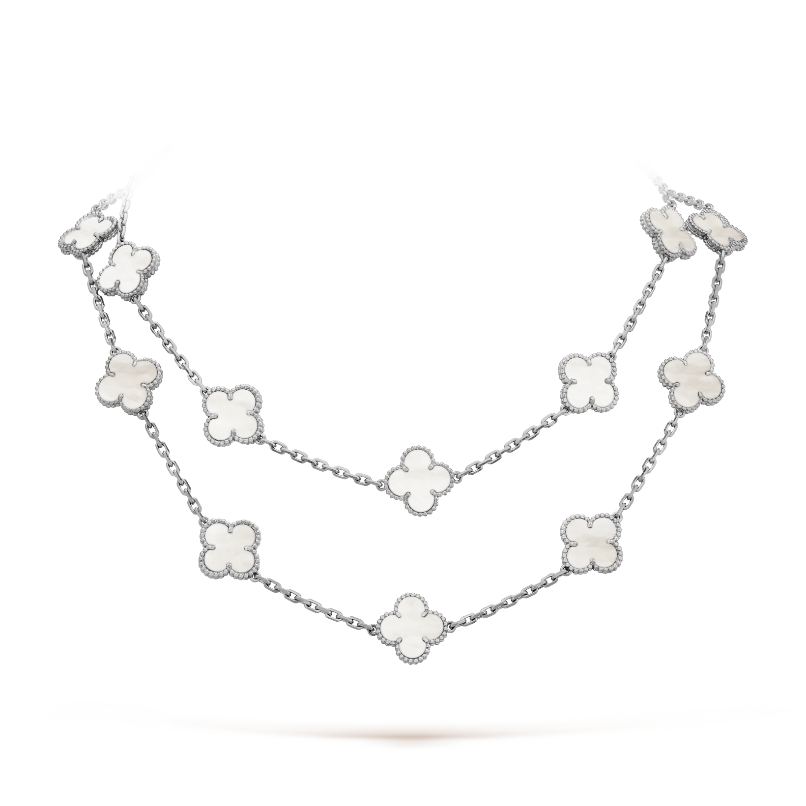 Vintage Alhambra long necklace, 20 motifs, rhodium plated 18K white gold, white mother-of-pearl.