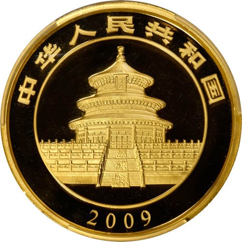 Obverse elements on 2009 Proof Chinese Gold Panda Coins include the static design that has graced the series since 1981. This building is the Hall of Prayer for Abundant Harvests and is a part of the Temple of Heaven Complex.