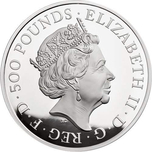 The reverse of the 2018 1 Kilo Proof British Silver Queen’s Beast Dragon Coin includes the design of Queen Elizabeth II’s fifth-generation portrait. The ruling monarch of England since 1952, Her Majesty is the longest-reigning monarch in the kingdom’s history and had this portrait of herself designed in 2015 by Jody Clark of the Royal Mint.