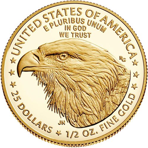 An American bald eagle features in the reverse design of 2022-W 1/2 oz Proof Gold Eagles. This new image shows the head of an American bald eagle in left-profile relief with incredible details capturing its physical features and plumage.