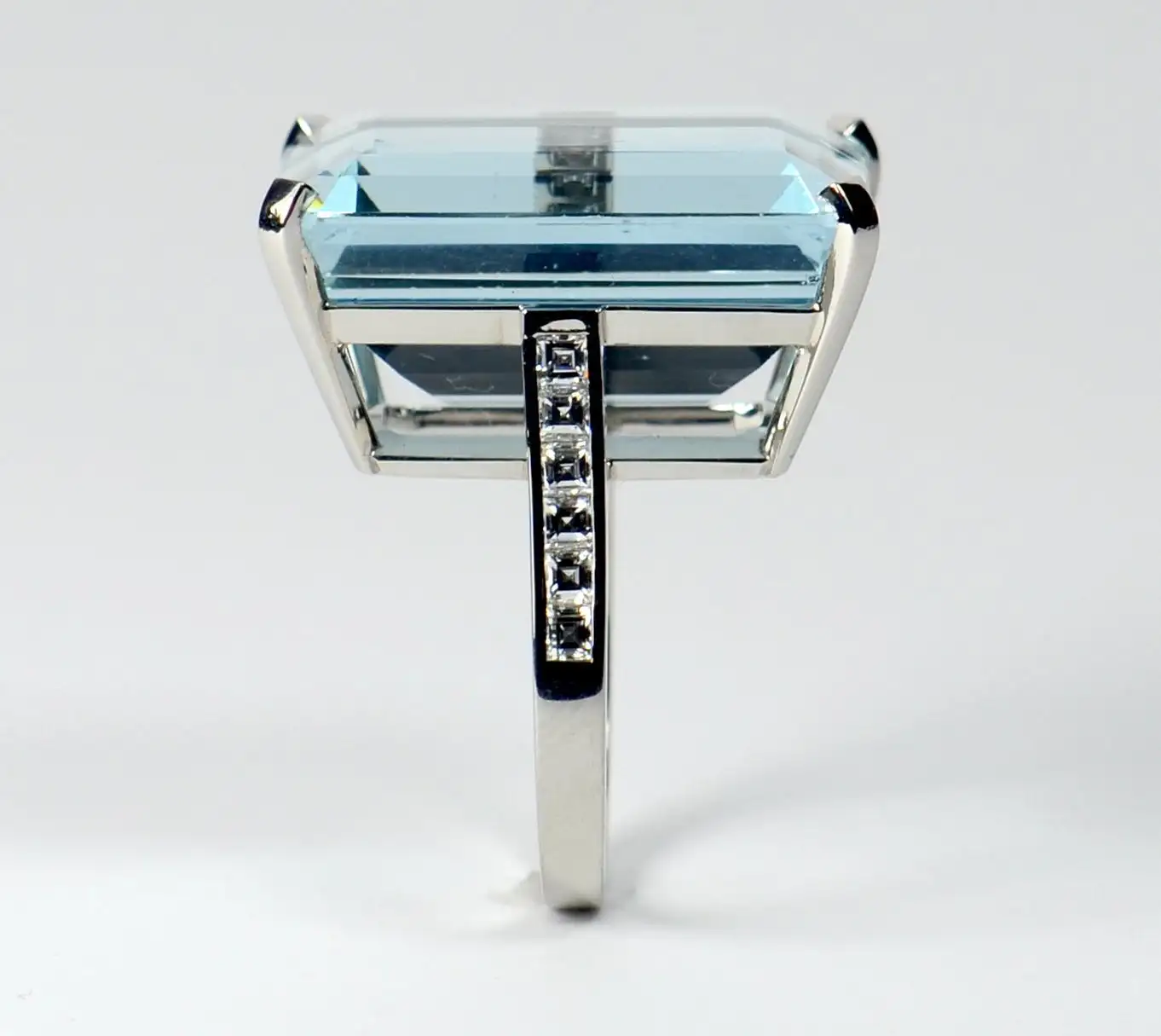 An elegant aquamarine ring with channel-set carré cut diamond shoulders mounted in platinum. The aquamarine is a clean stone with a fine clear blue colour.