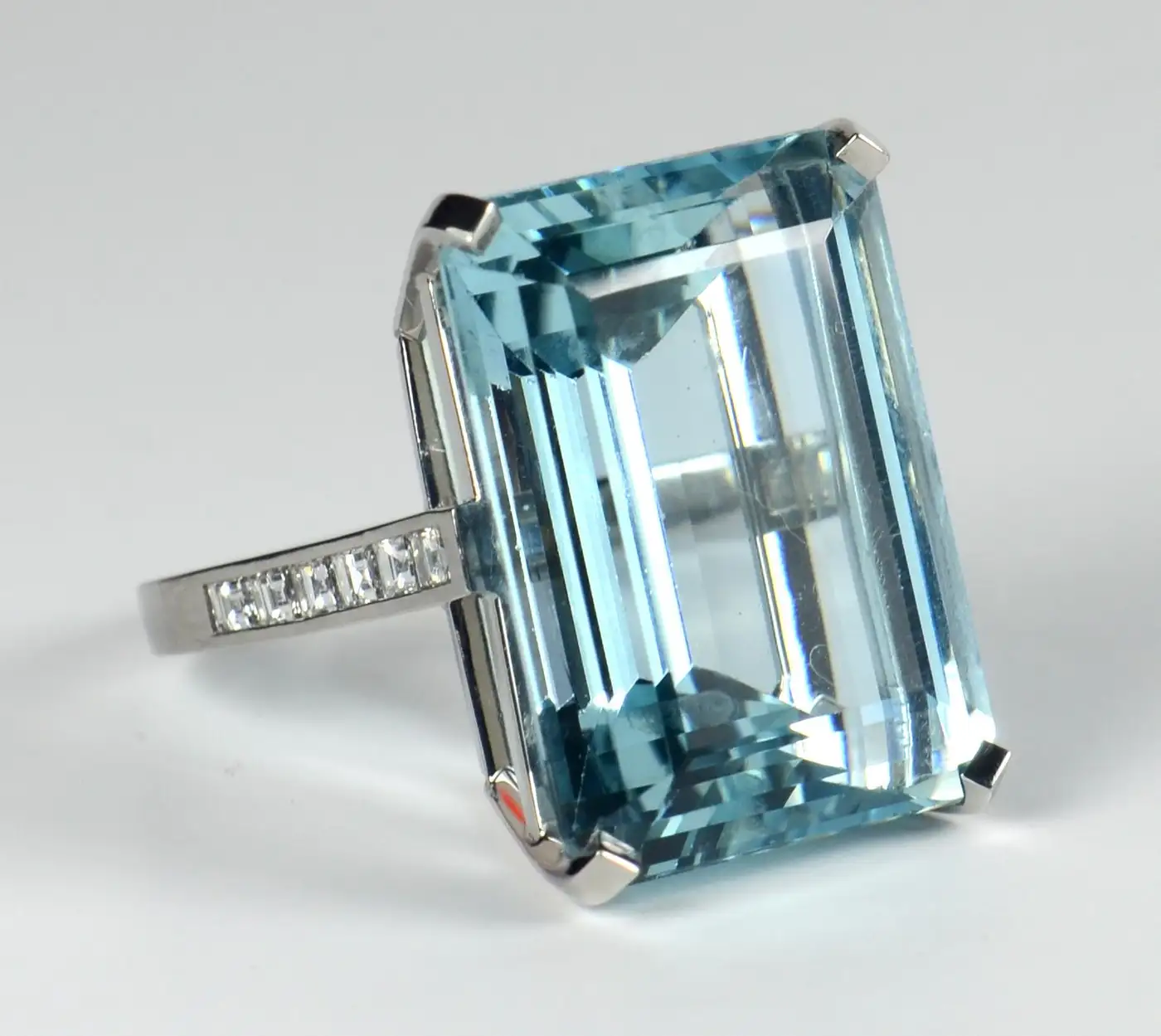 The aquamarine measures 22.4 x 17 x 10.8mm and is estimated to weigh 32.70 carats. There are 12 carré cut diamonds with an estimated total weight of 0.60cts. The ring weighs 14.58g and is unmarked. Currently a size M (US 6.5), this ring may be sized if needed.