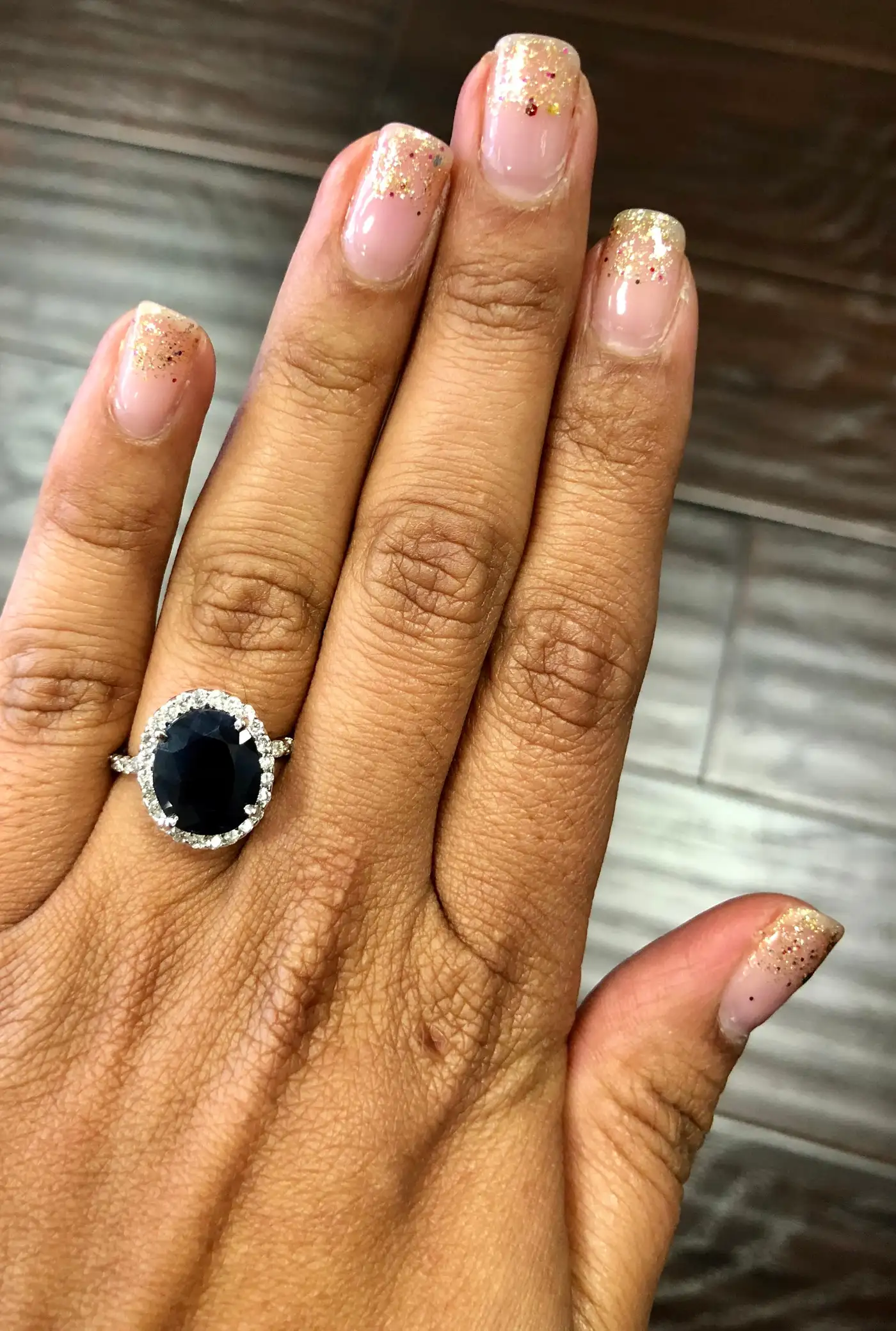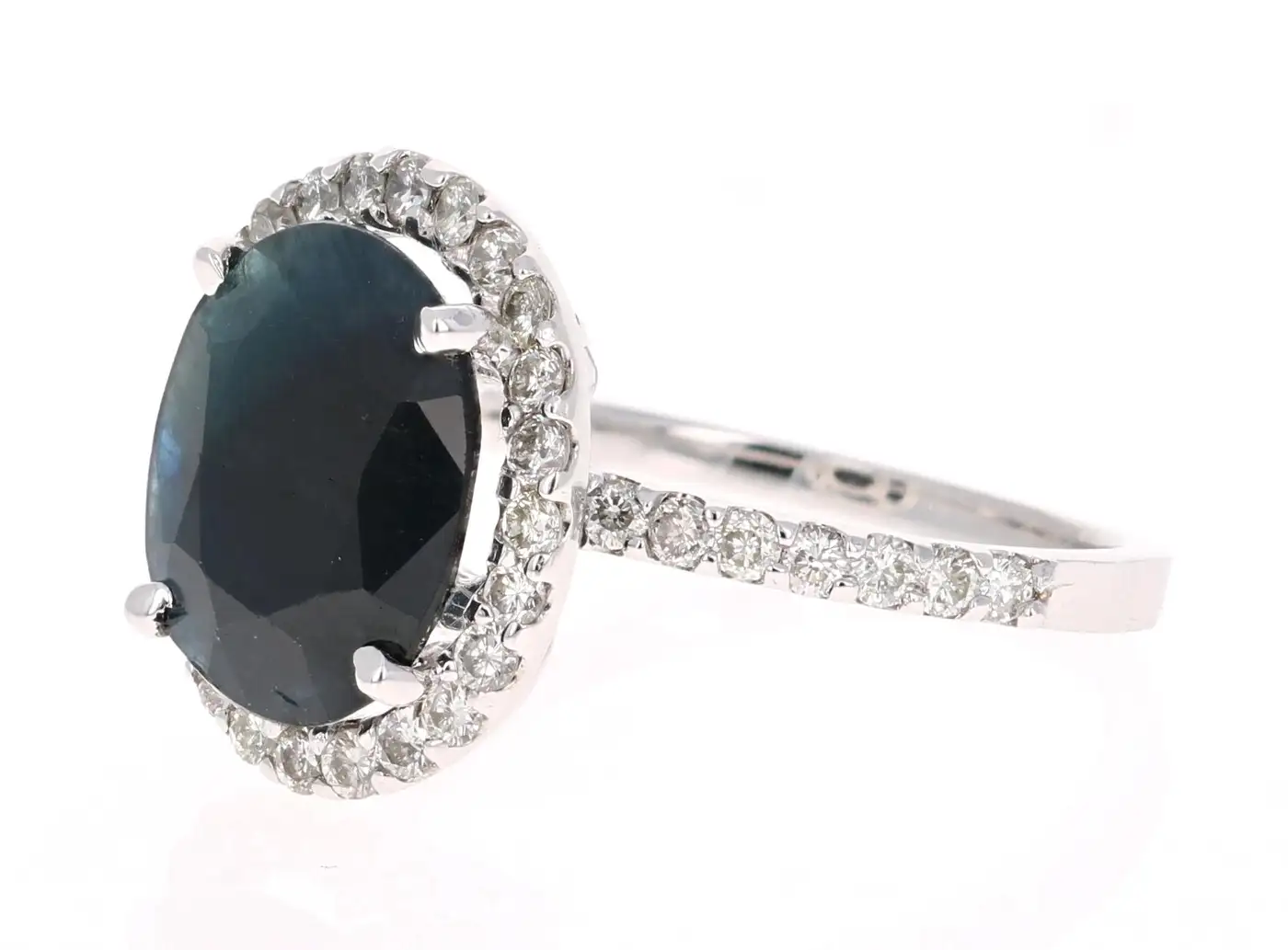 Gorgeous 4.65 Carat Sapphire and Diamond ring that can easily be worn as a unique Engagement ring! The Deep Midnight Blue Oval Cut Sapphire weighs 3.92 carats and is surrounded by 38 Round Cut Diamonds that weigh 0.73 carats. The total carat weight of the ring is 4.65 carats. This ring is made in 14K White gold and weighs approximately 3.4 grammes. This ring is a size 7 and can be re-sized if needed at no additional cost.