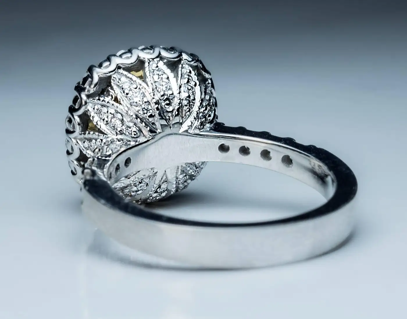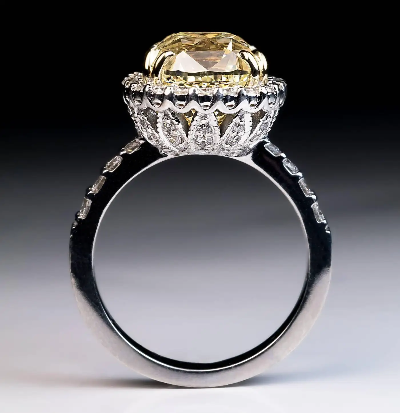 The 5.37 ct fancy light yellow, VS2 clarity, cushion shaped, old Lisbon brilliant cut diamond is from the early 1900s. The diamond is set in a modern custom made white and yellow 18K gold lotus flower motif setting embellished with numerous bright white modern brilliant cut diamonds. The ring is accompanied by GIA report for the coloured diamond. Ring size 6.75 (resizable).