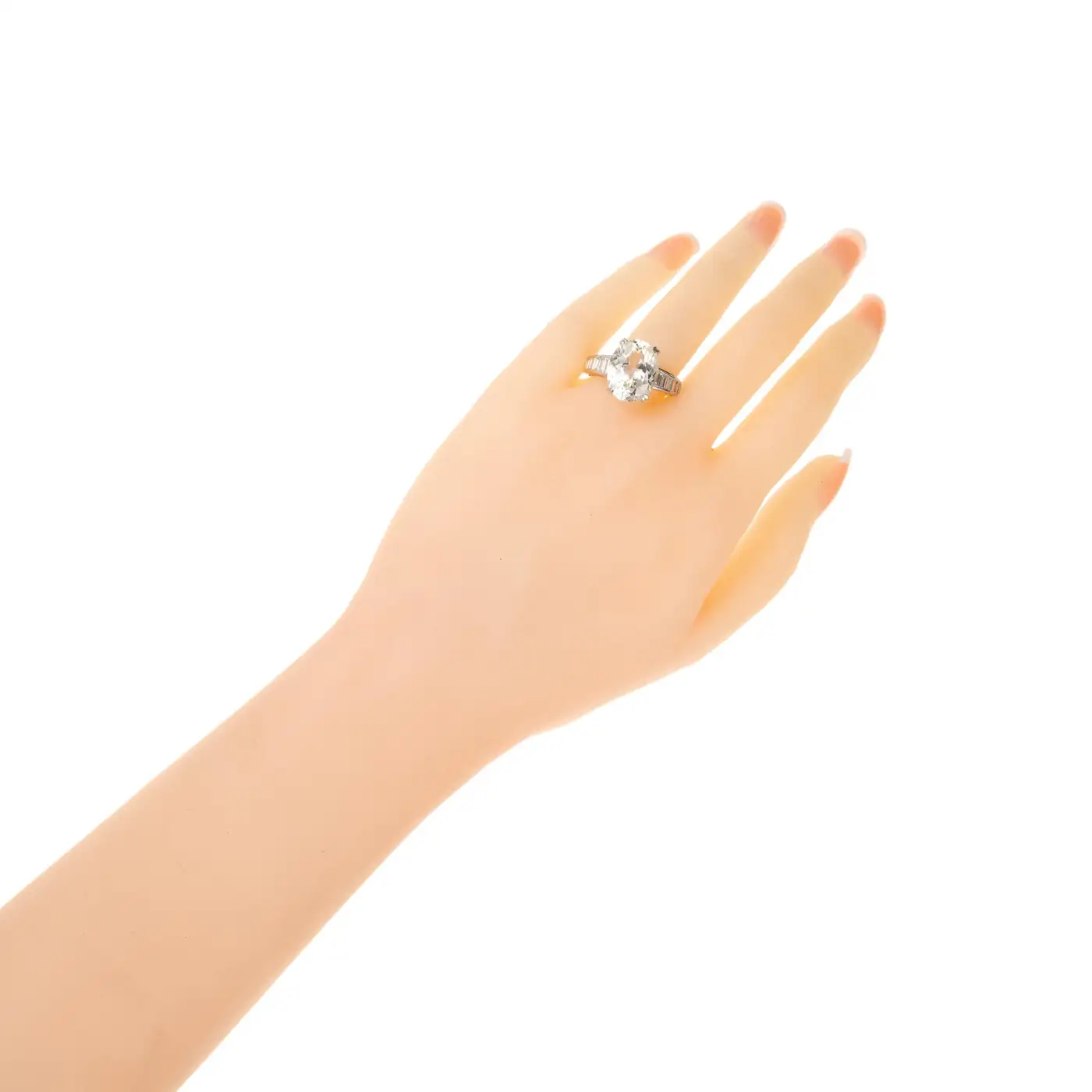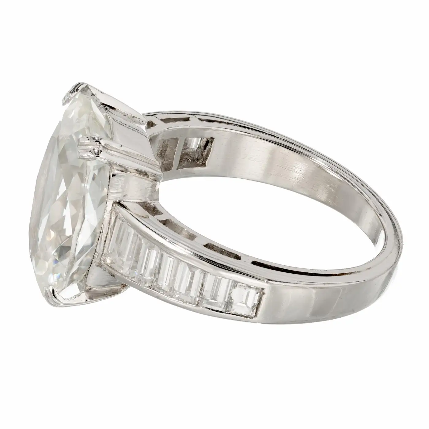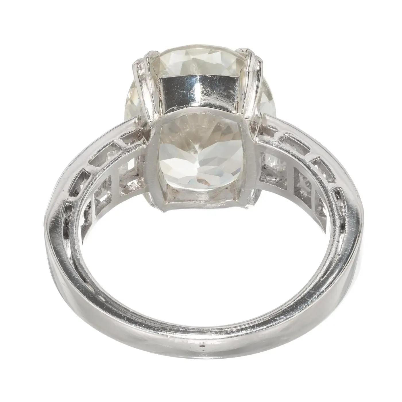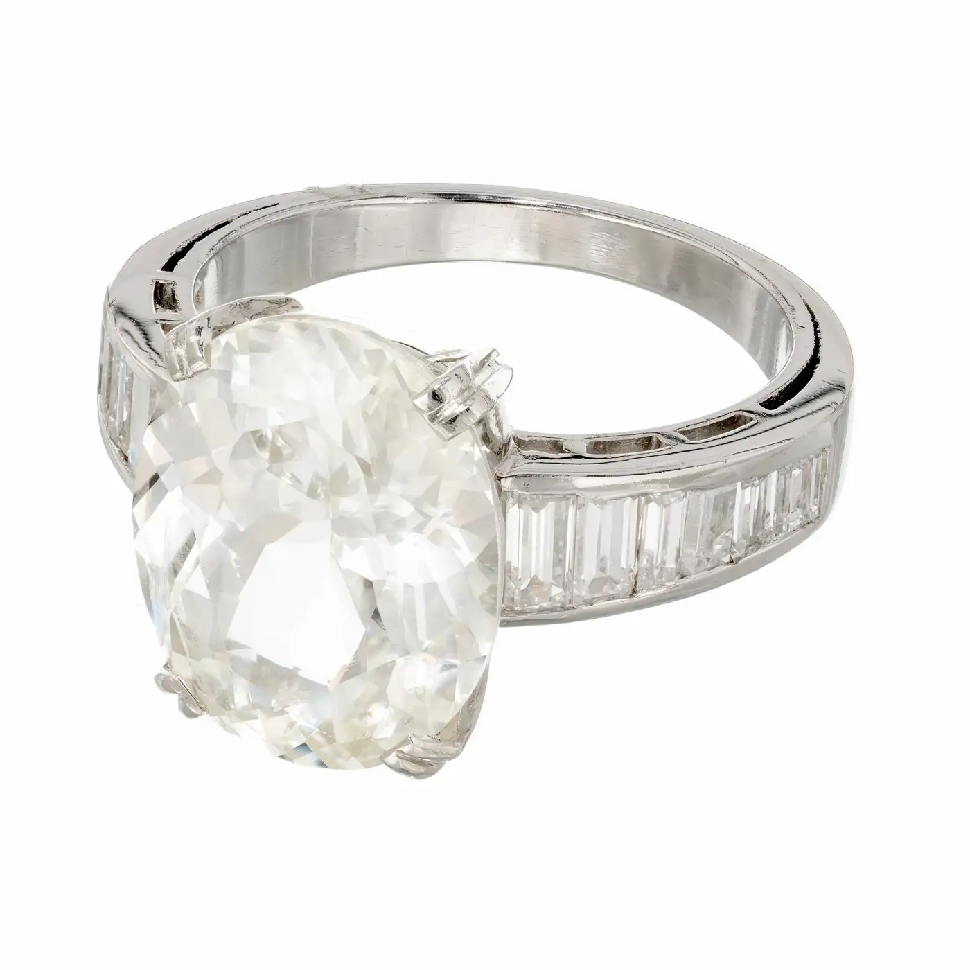 1 oval very light yellow Sapphire, approx. total weight 9.60cts, simple heat, 14.76 x 11.67 x 7.05mm, GIA certificate #5151599990 12 Emerald cut baguette diamonds, approx. total weight 1.50cts, G – H, VS, 3.69 – 2.53mm x 1.89 x 1.7mm Size 7.25 and sizable Platinum Tested: Platinum 10.0 grammes Width at top: 14.73mm Height at top: 7.05mm Width at Bottom: 3.10mm.