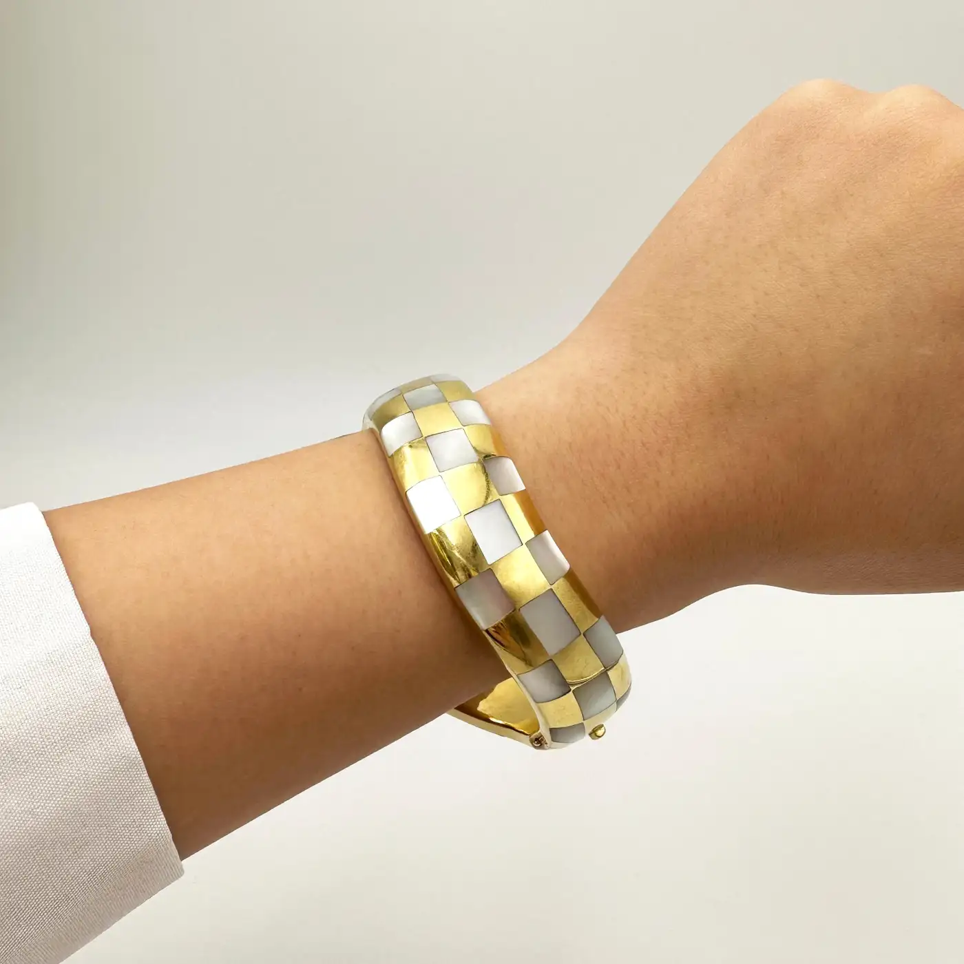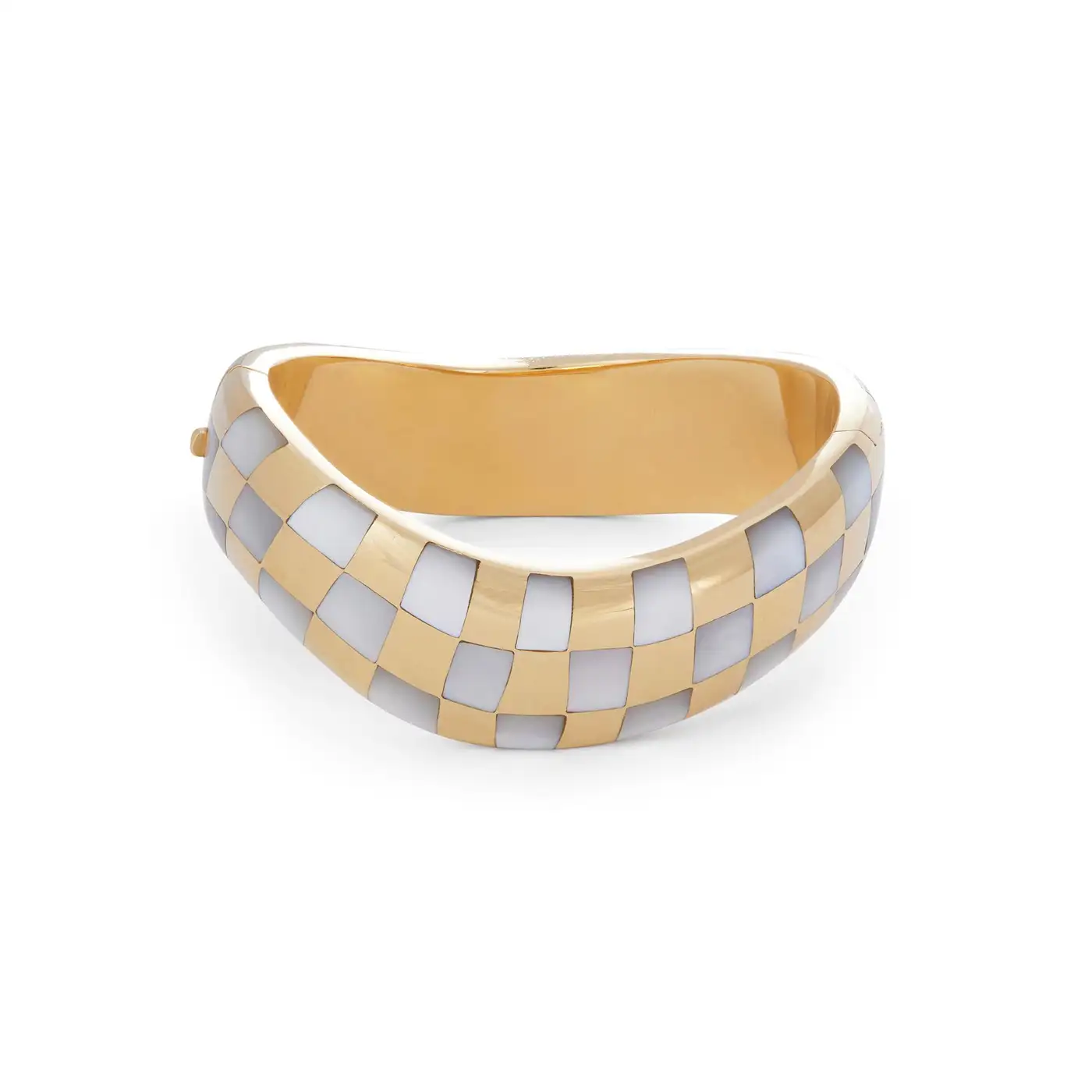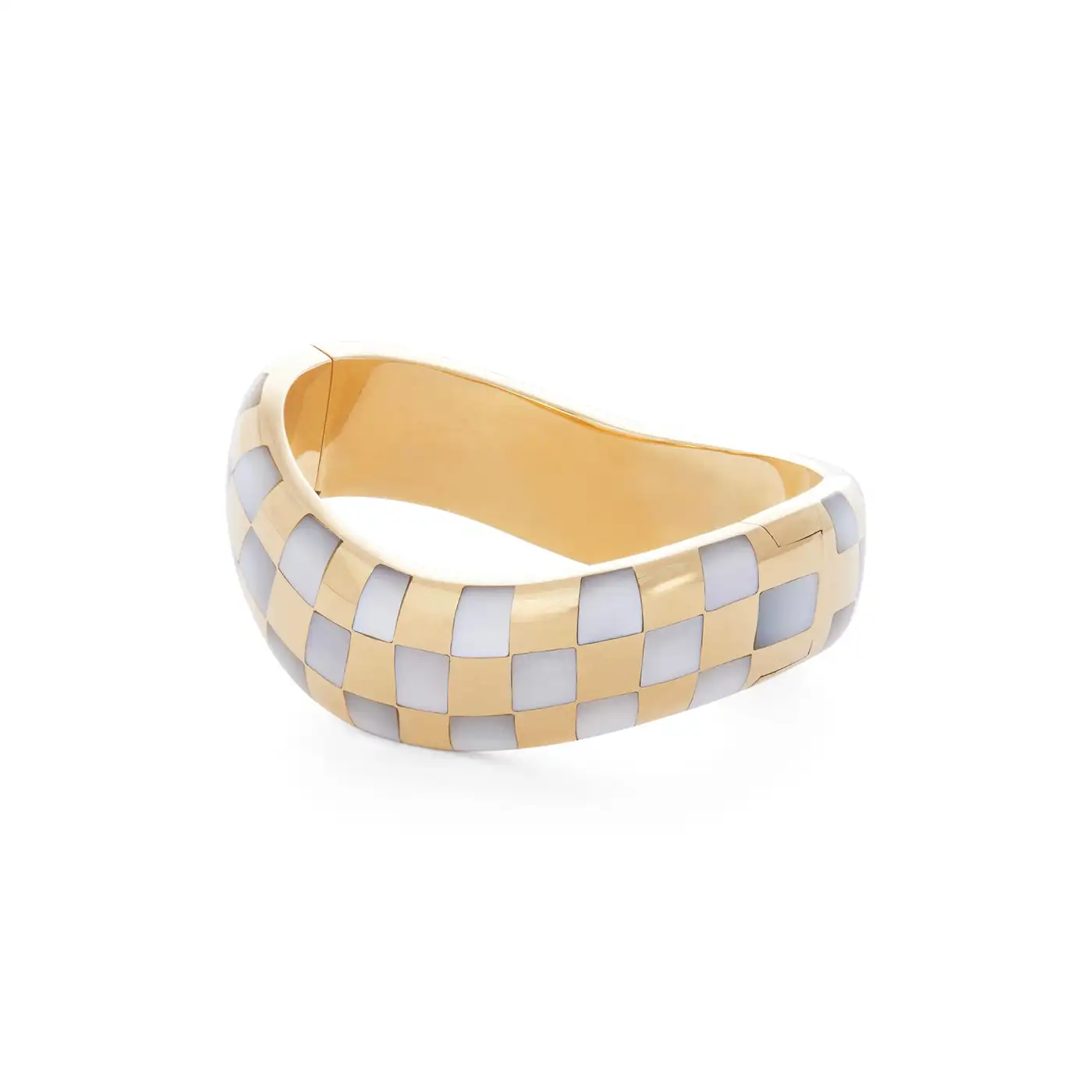 Authentic Angela Cumings bracelet crafted in 18 karat yellow gold. The asymmetric hinged bangle features inlaid mother-of-pearl in a checkerboard pattern. The bracelet measures .70 inches in width, has a 6 1/2 inch internal circumference and will fit up to a 6 1/2 inch wrist. Signed Angela Cummings, 18k, 750.