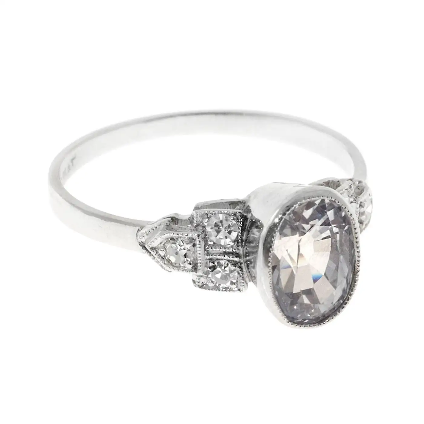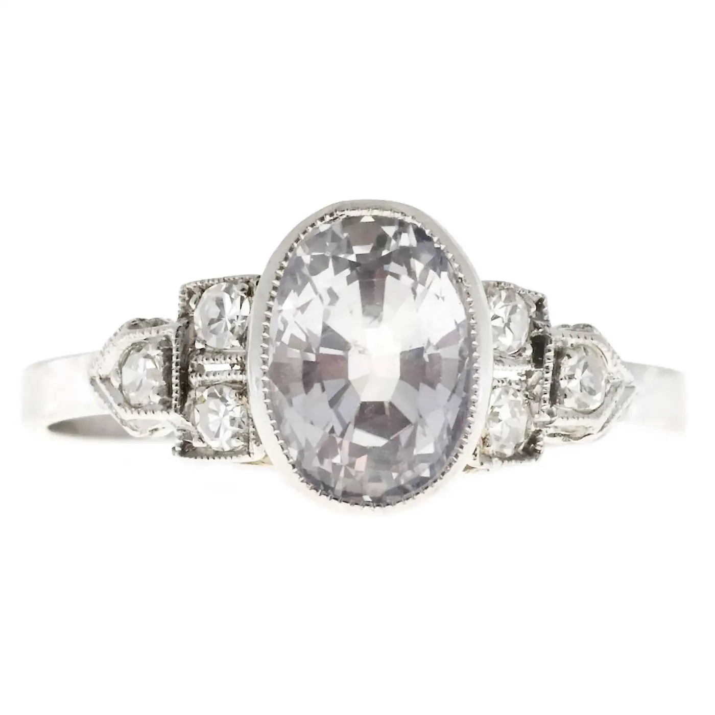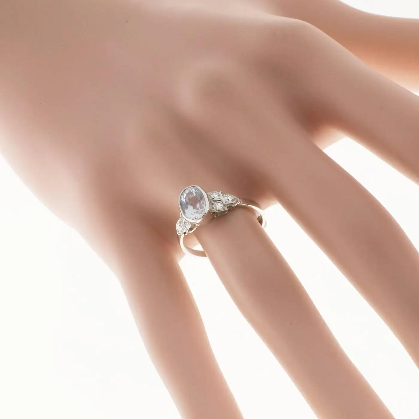 Oval very light pink blue Sapphire Art Deco engagement ring circa 1930 to 1940. In a platinum setting with 6 side diamonds.