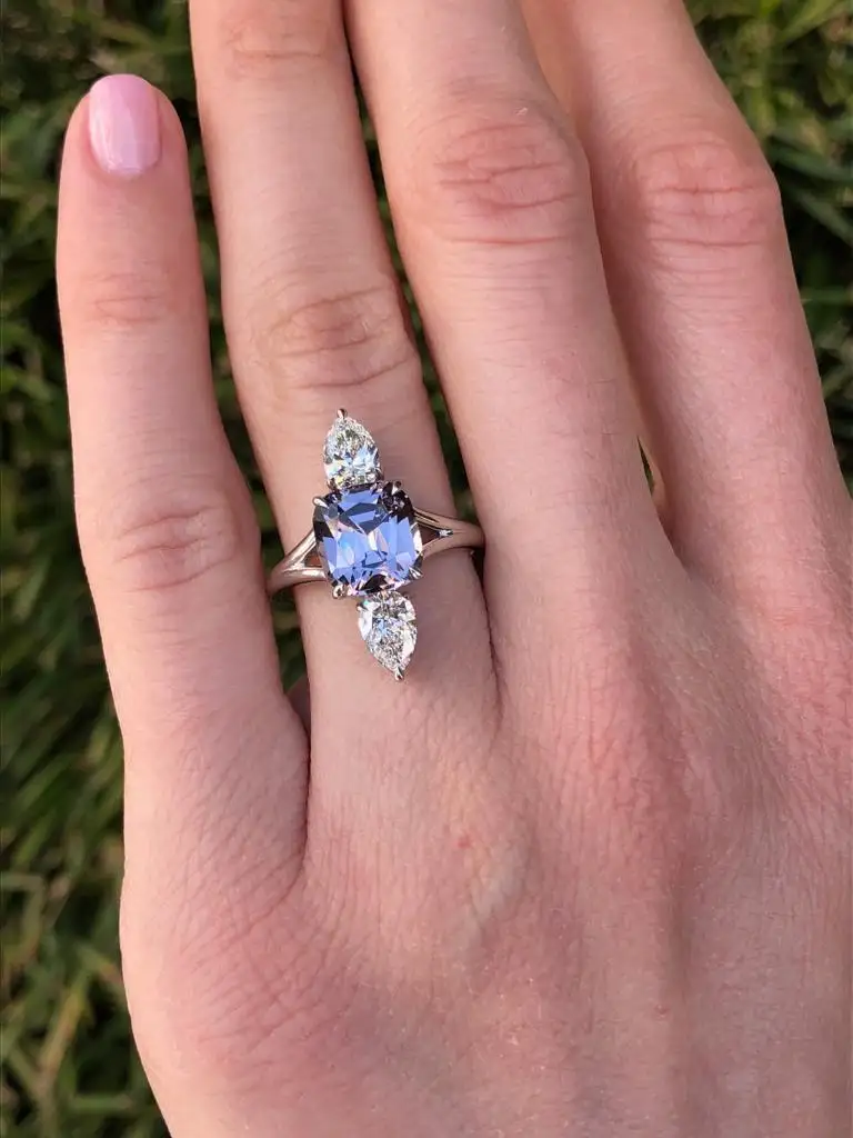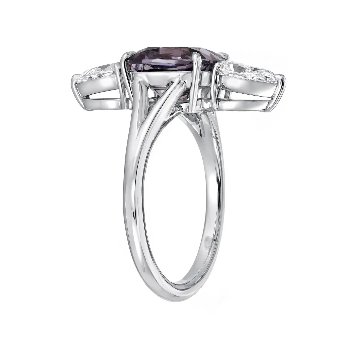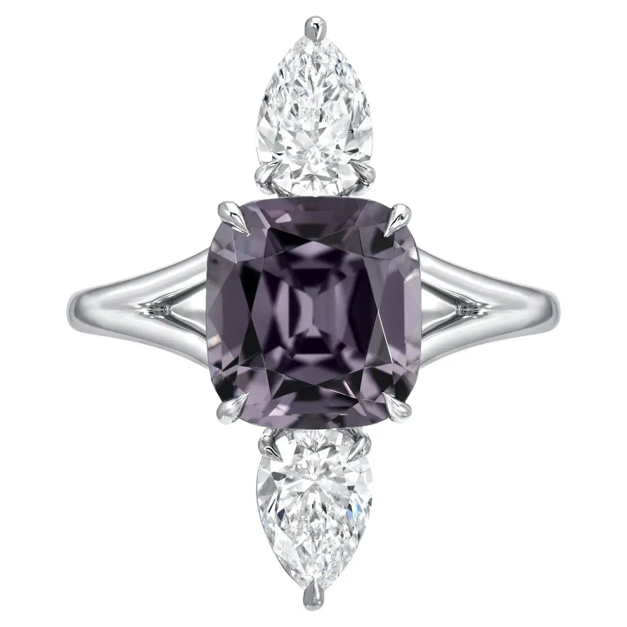 Spectacular 3.14 carat cushion cut Burma Spinel, displaying a violet hue with greyish undertones, and a pair of GIA certified F/VS1 pear shape diamonds weighing a total of 1.00 carat, are set vertically in this exquisitely hand crafted platinum diamond ring. Size 6. Resizing is complementary upon request. Returns are accepted and paid by us within 7 days of delivery. GIA diamond certificates are attached to the images for your reference.