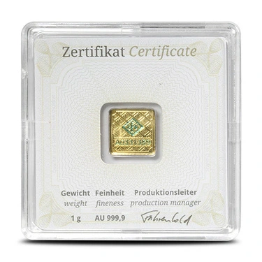 Each of these 1 Gram Geiger Square Gold Bars are available to you for purchase today inside of individually-sealed certificate capsules. These capsules house your 1 Gram gold bar securely in the center with an assay card included inside of the packaging. The assay card’s reverse face has the matching weight, purity, and metal content from your bar, along with the signature of an official assayer.