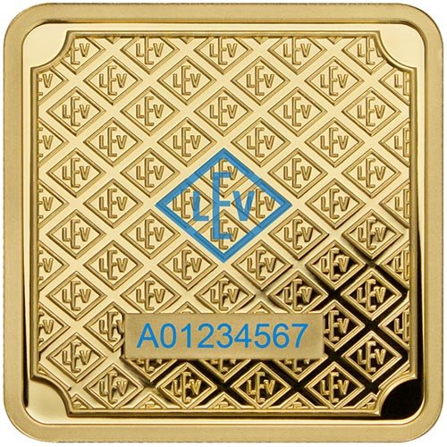 On the reverse of the Geiger Square Gold Bar is a repeating design that arranges the famed “LEV” rhombus of the mint in horizontal rows. In the center of the design is the UV-coating that reveals the additional “LEV” rhombus under black light. The serial number is also engraved on this side of the bars.