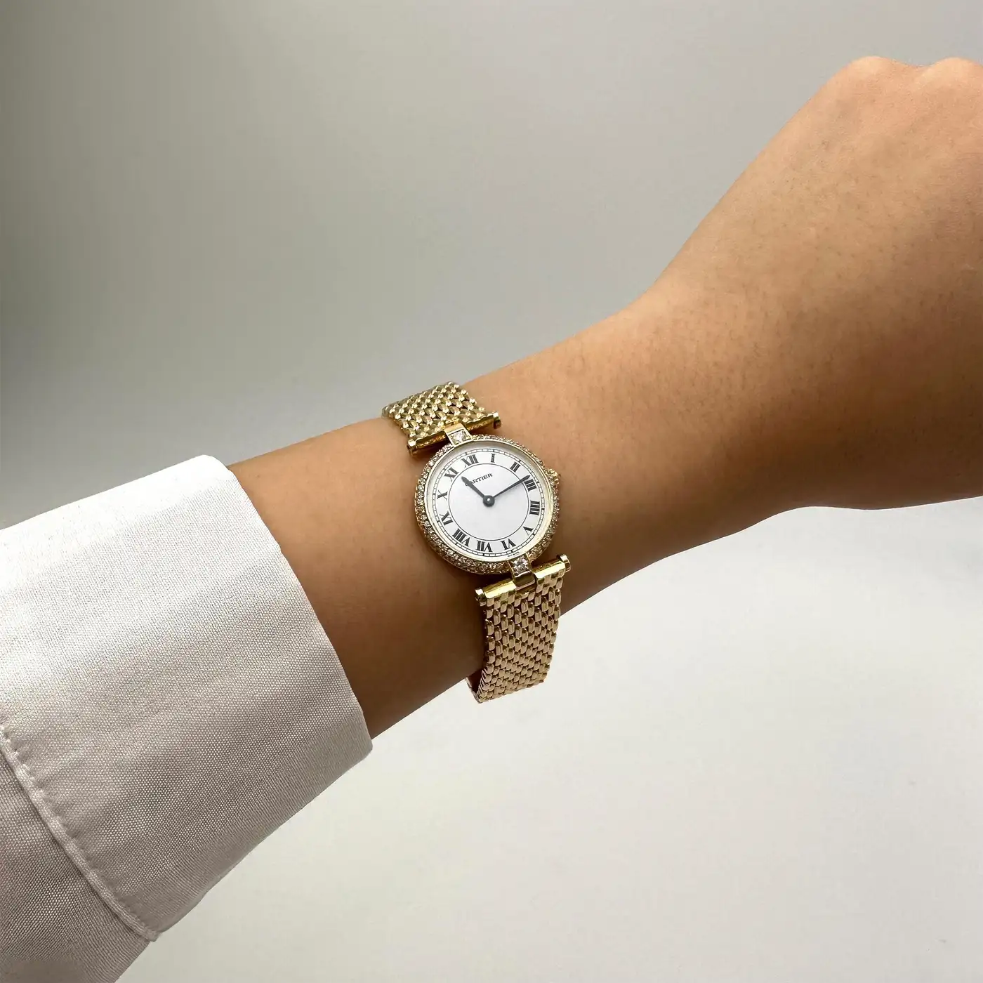 Authentic Vendome de Cartier watch crafted in 18 karat yellow gold with matching mesh bracelet and hidden deployant clasp. The round case diameter measures 24 mm. Features a white dial with black Roman markers, and a bezel set with single and round brilliant cut diamonds weighing an estimated 0.50 carats total. Watch is presented with Cartier service papers. Fits up to 6 1/2 inch wrist. CIRCA 1990s.
