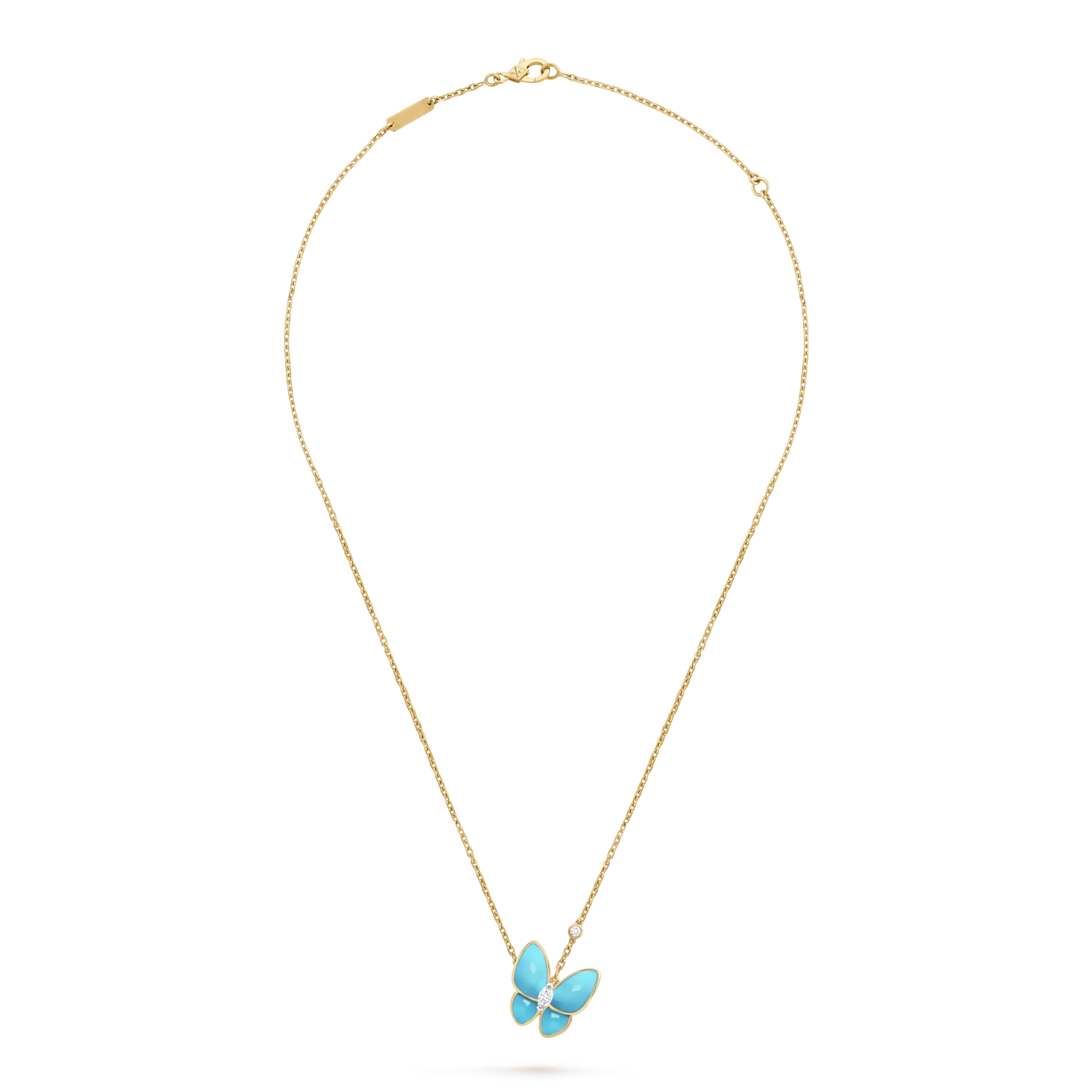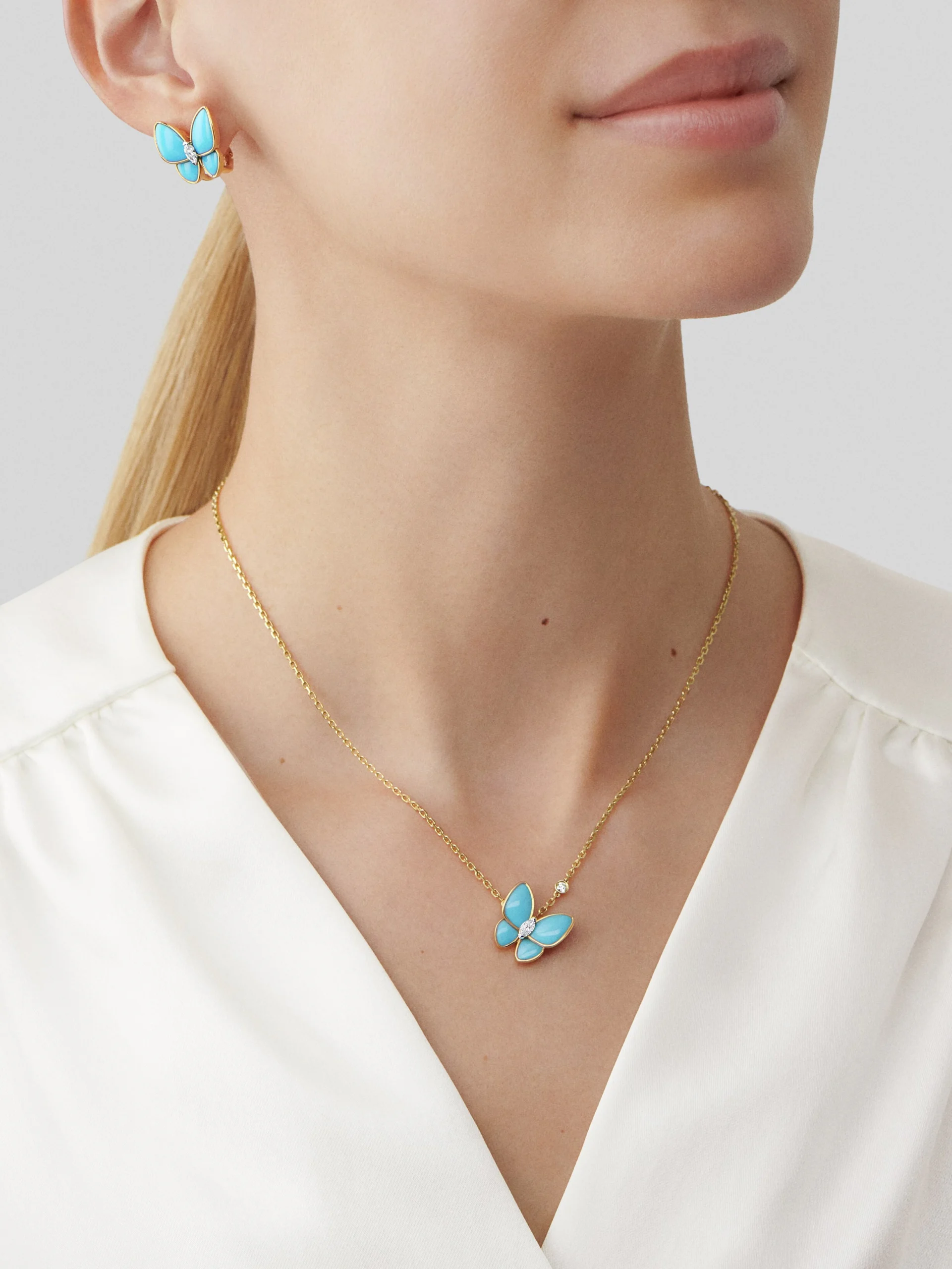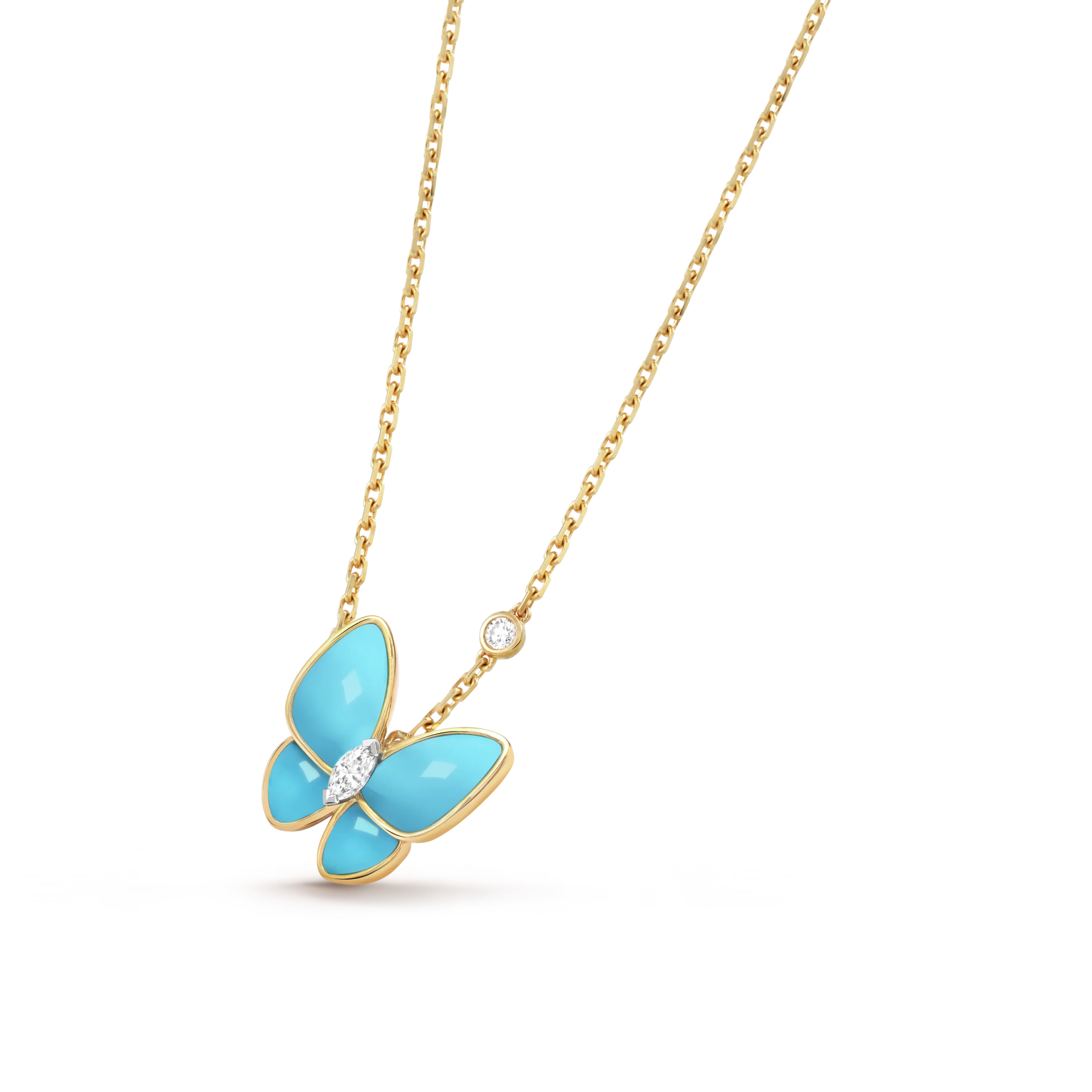 Two Butterfly pendant, 18K yellow gold, turquoise, round diamond, rhodium plated 18K white gold, marquise-cut diamond; diamond quality DEF, IF to VVS.
