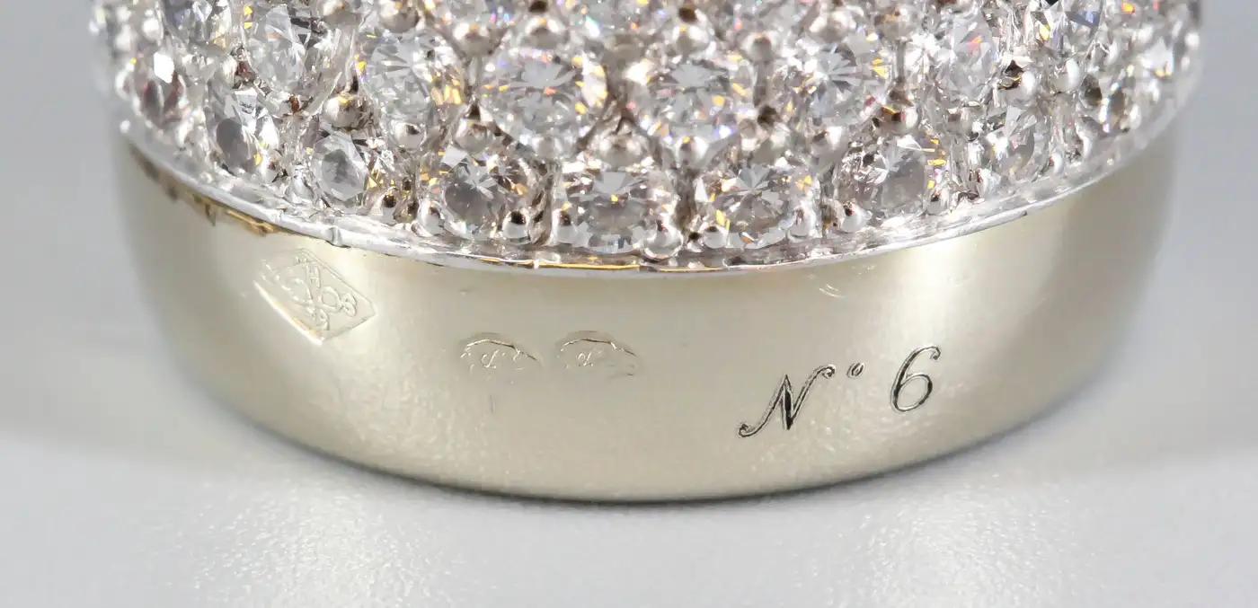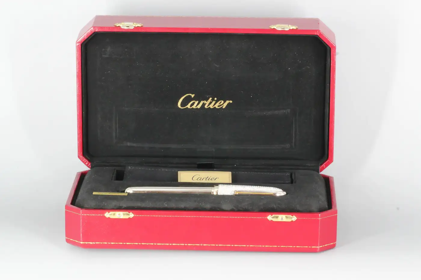 Very fine and exceptionally rare diamond and 18k white gold fountain pen from the “Louis Cartier” collection, by Cartier. Limited edition of 10 pieces believed to be in existence today. Approx. 18.0-22.0 carats of very high grade round brilliant cut diamonds pave set on the barrel of the pen, diamonds are all original and factory set. Comes with box, blank certificate, and copy of papers stating it originally sold for $105,000 in the 2002. Hallmarks: Louis Cartier, No. 6, French 18K gold assay marks, maker”s mark. (Nib marked with French 18K gold assay mark, 18k, 750, and Cartier logo.)