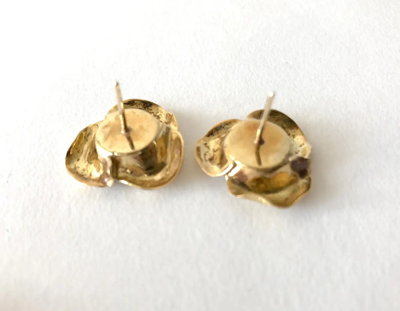 An 18 karat gold and diamond rose flowering brooch and matching earrings created by Cartier of France. The set has a Florentine finish to the petals with 15 full cut diamonds in the brooch, some of them en tremblant. The earrings have one single diamond each. Brooch measures 2″ by 2″ and is signed Cartier, 18K. The earrings are of pierced variety, measure .75″ in diameter and are unsigned, testing positive for 18K. Earrings can be worn as scatter pins as seen in my last picture. In very good vintage condition. 43.6 grammes.