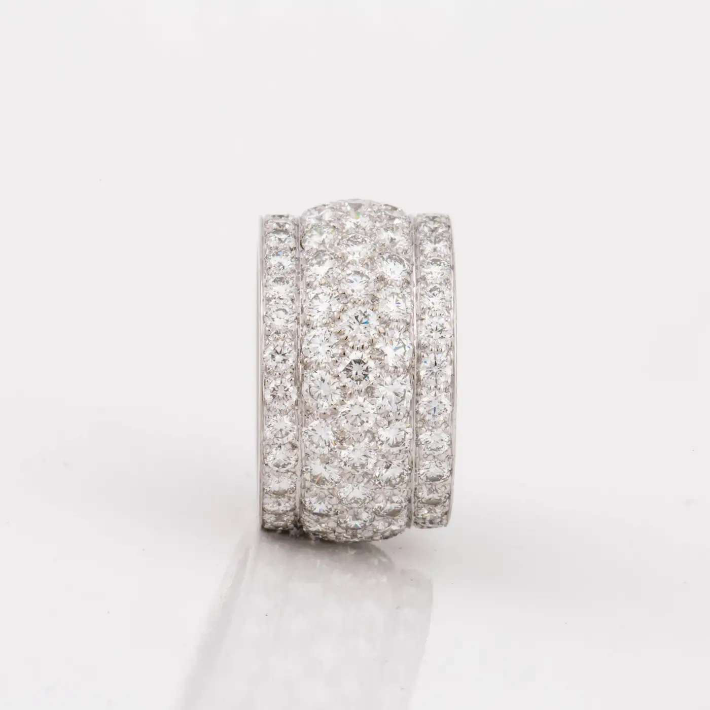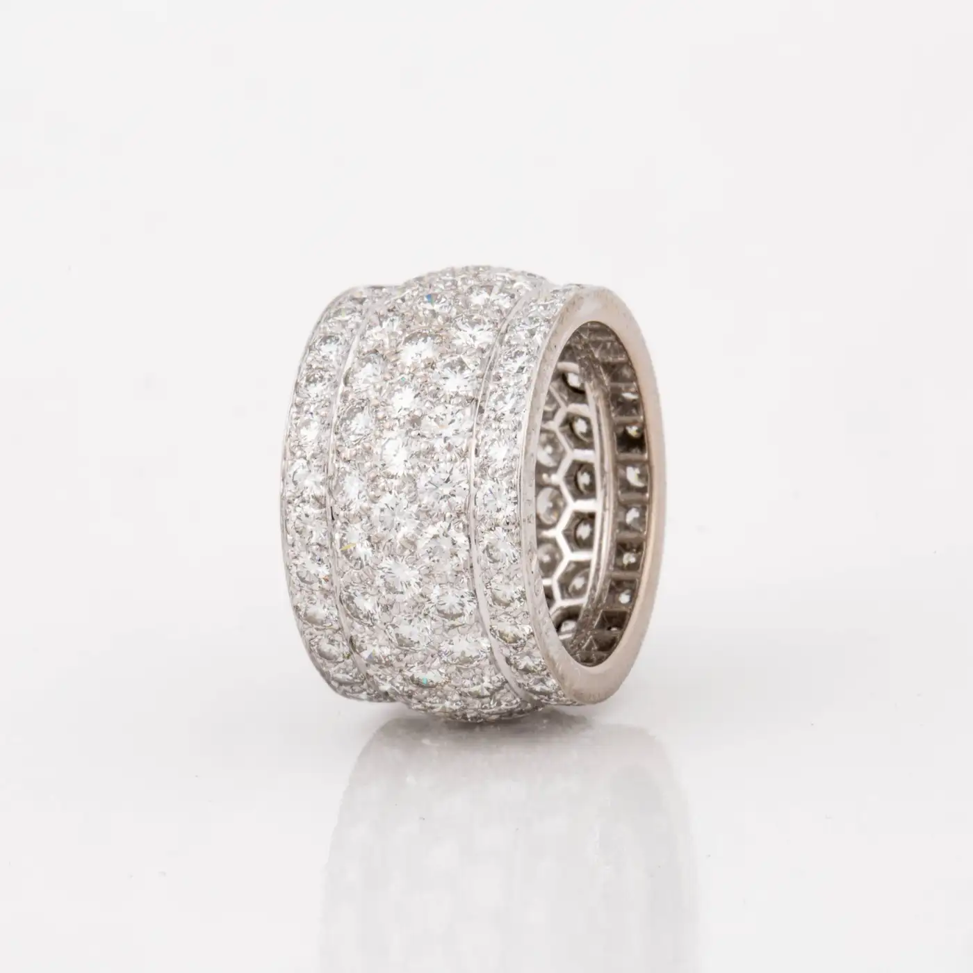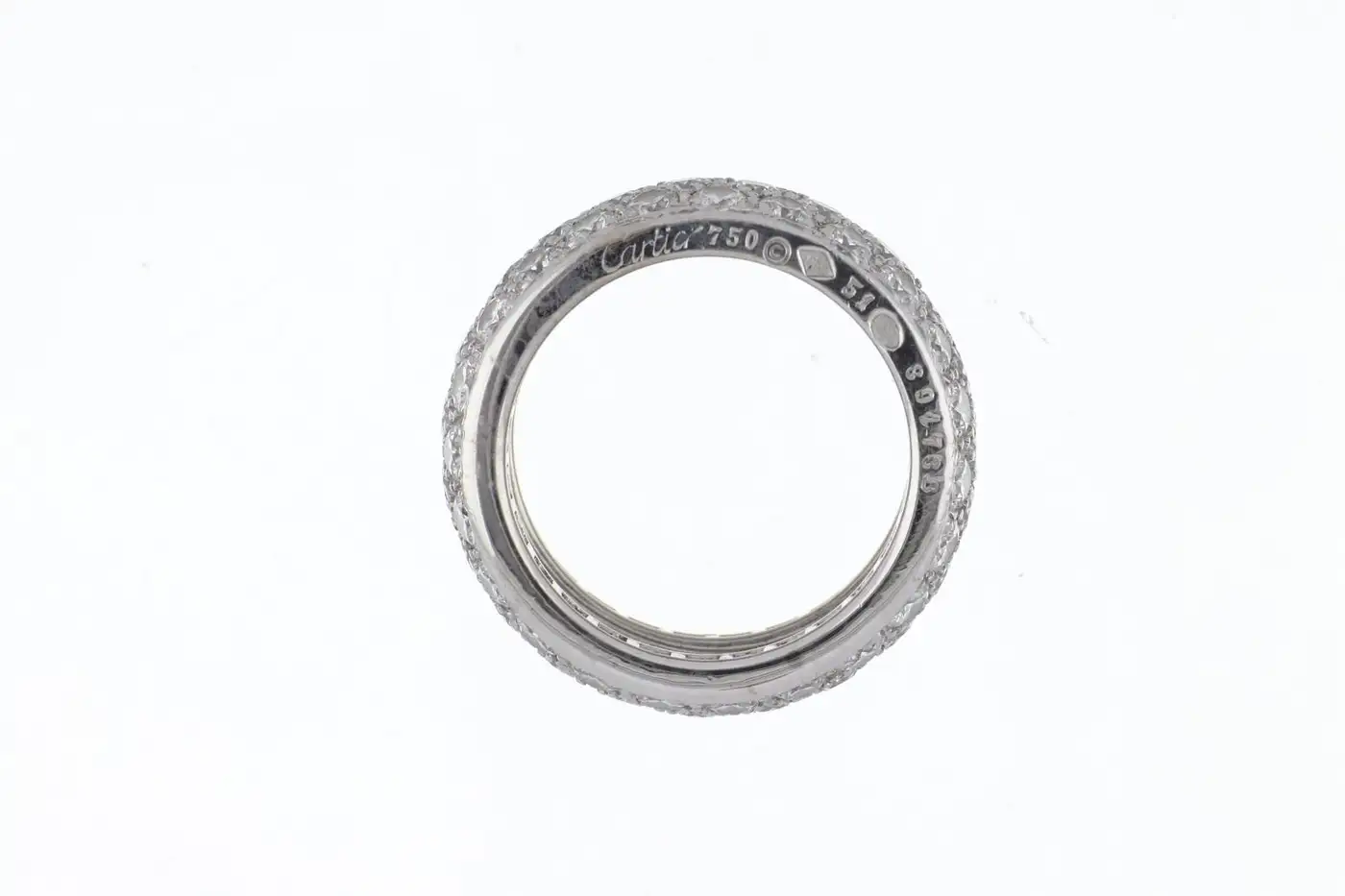 Cartier wide eternity band from the Nigeria Collection composed of 18K white gold with round brilliant-cut diamonds. There are 125 diamonds that total 5.65 carats; F-G colour and VVS-VS1 clarity. Ring is an American size 5 1/2 or European size 51. Marked “Cartier 750 51 89473B” along the edge.