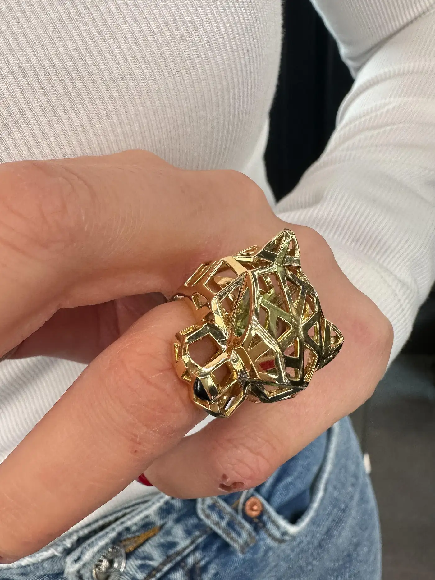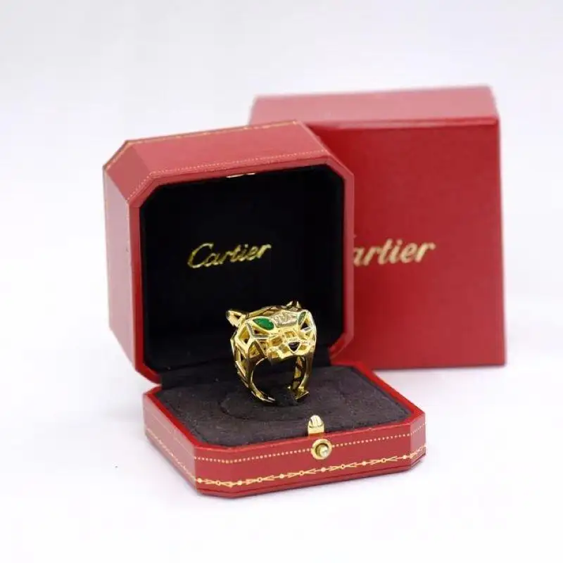 The emblematic panther has been an important part of Cartier”s designs since 1914. This fiercely fashionable design from the Panthère de Cartier collection is made of 18K yellow gold and boasts an almost skeleton look. Panthere de Cartier ring, 18K yellow gold, tsavorite garnets, onyx. size EU50 it”s approx. size 5 (CLOSE TO A SIZE 5.25). Ring will be lightly buffed and polished before shipping other than that is in excellent condition and will come in it”s original Cartier box.