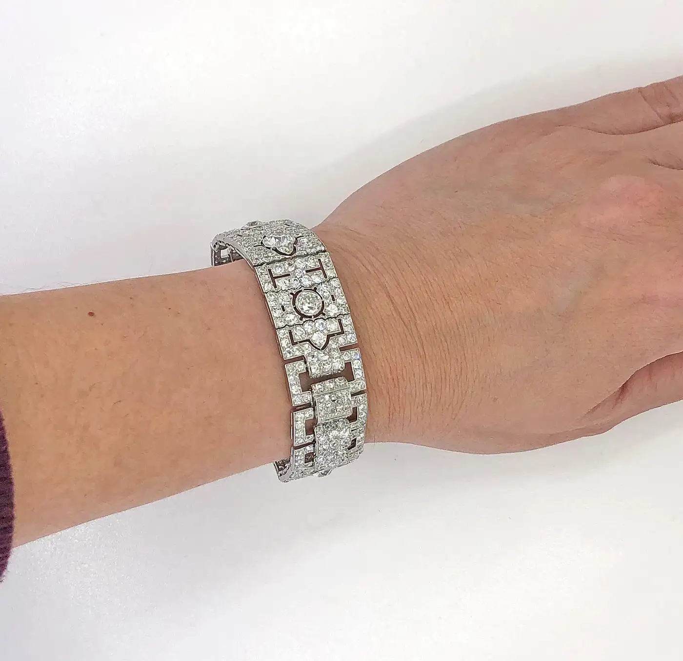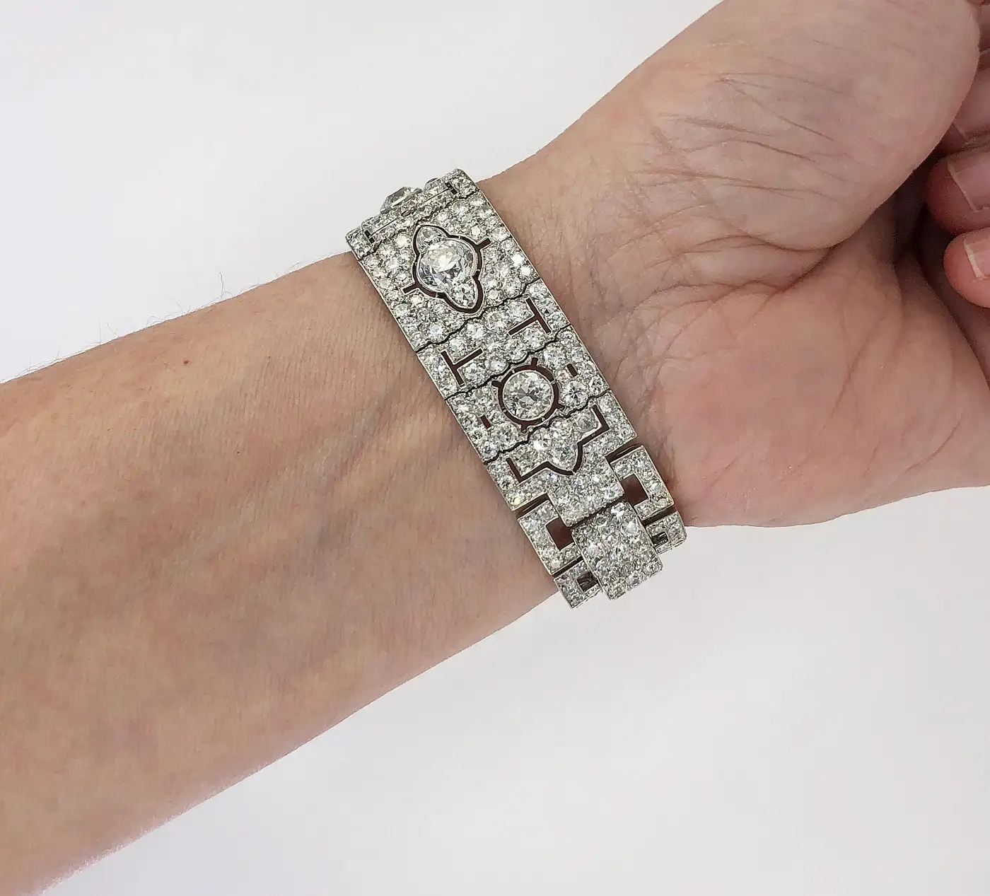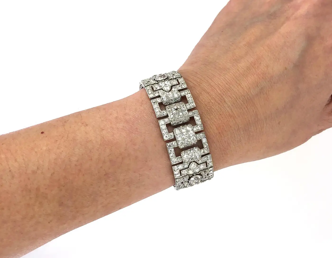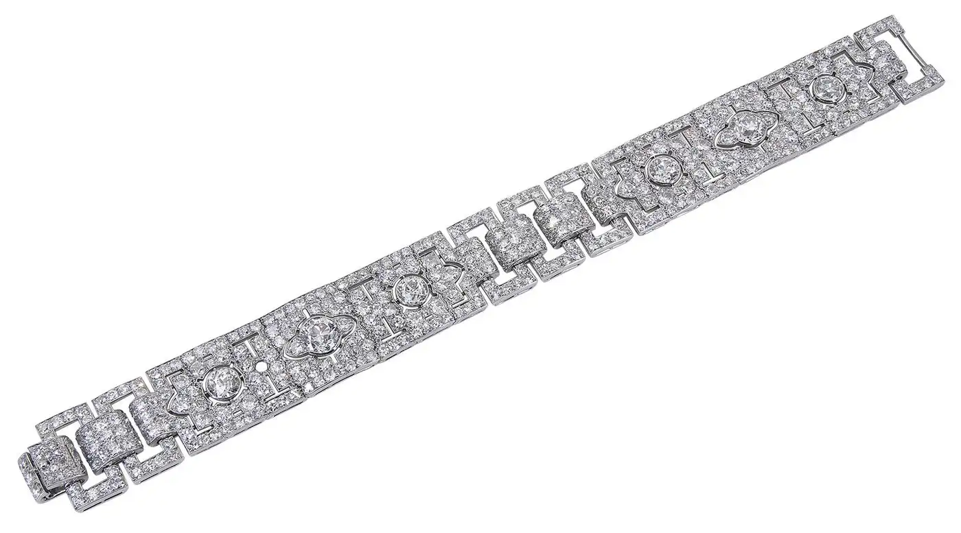 Cartier Paris Art Deco Diamond Platinum Strap Bracelet Formal Cartier Paris Art Deco strap bracelet designed as open rectangular links connected by Persian stylized motifs set with larger diamonds. At the time, fashionable women such as Madame Louis Cartier would have worn several bracelets on one wrist.