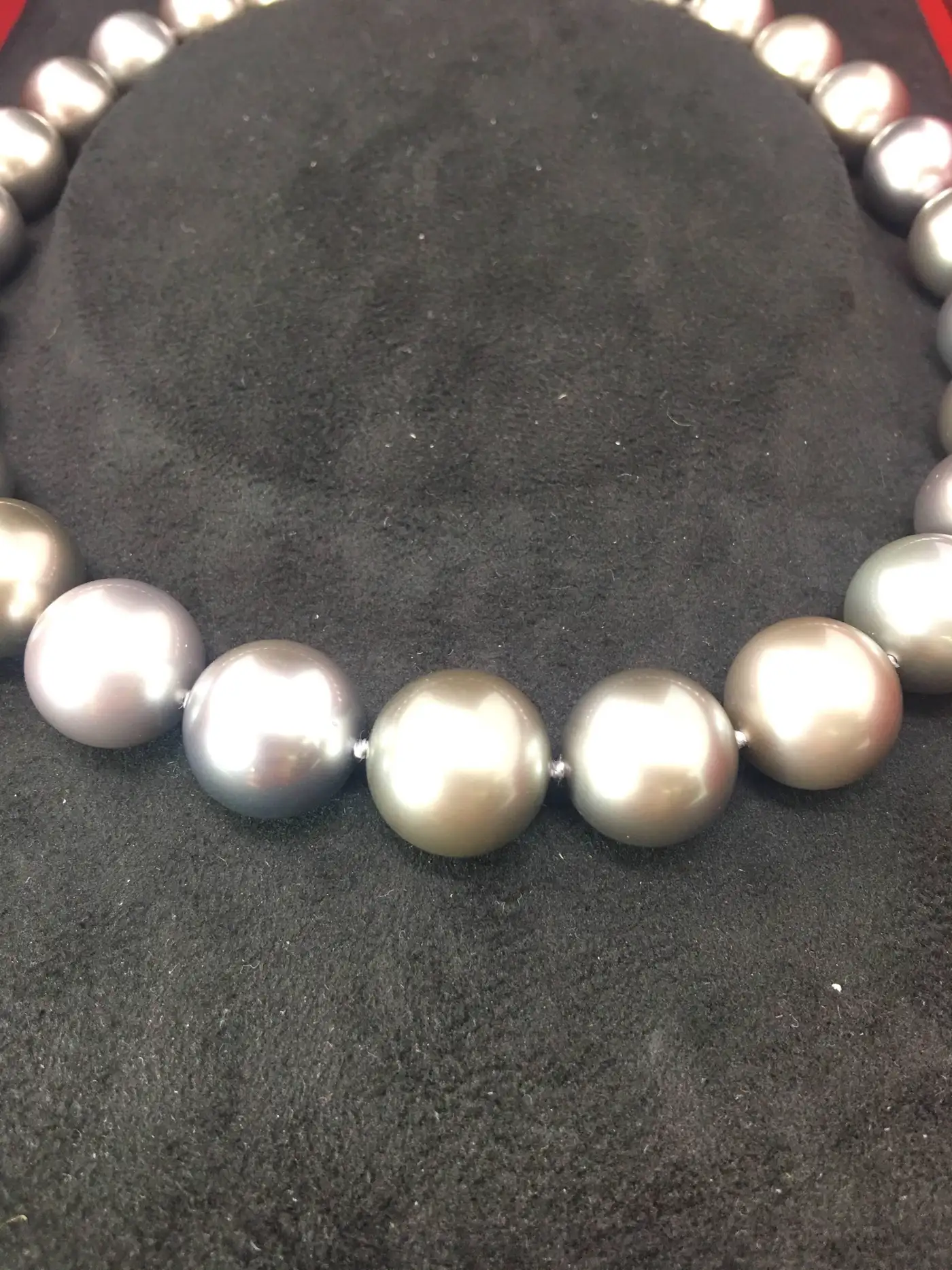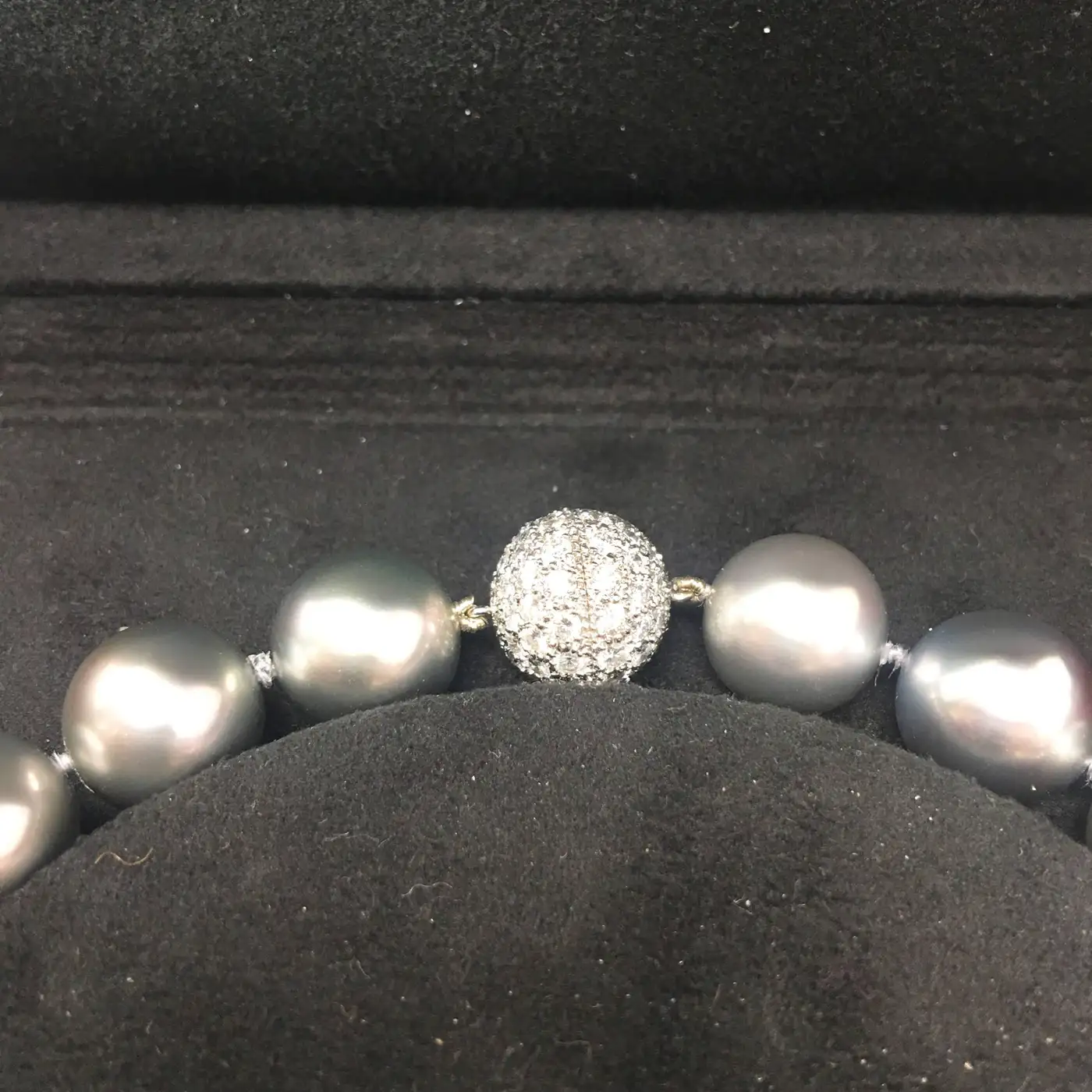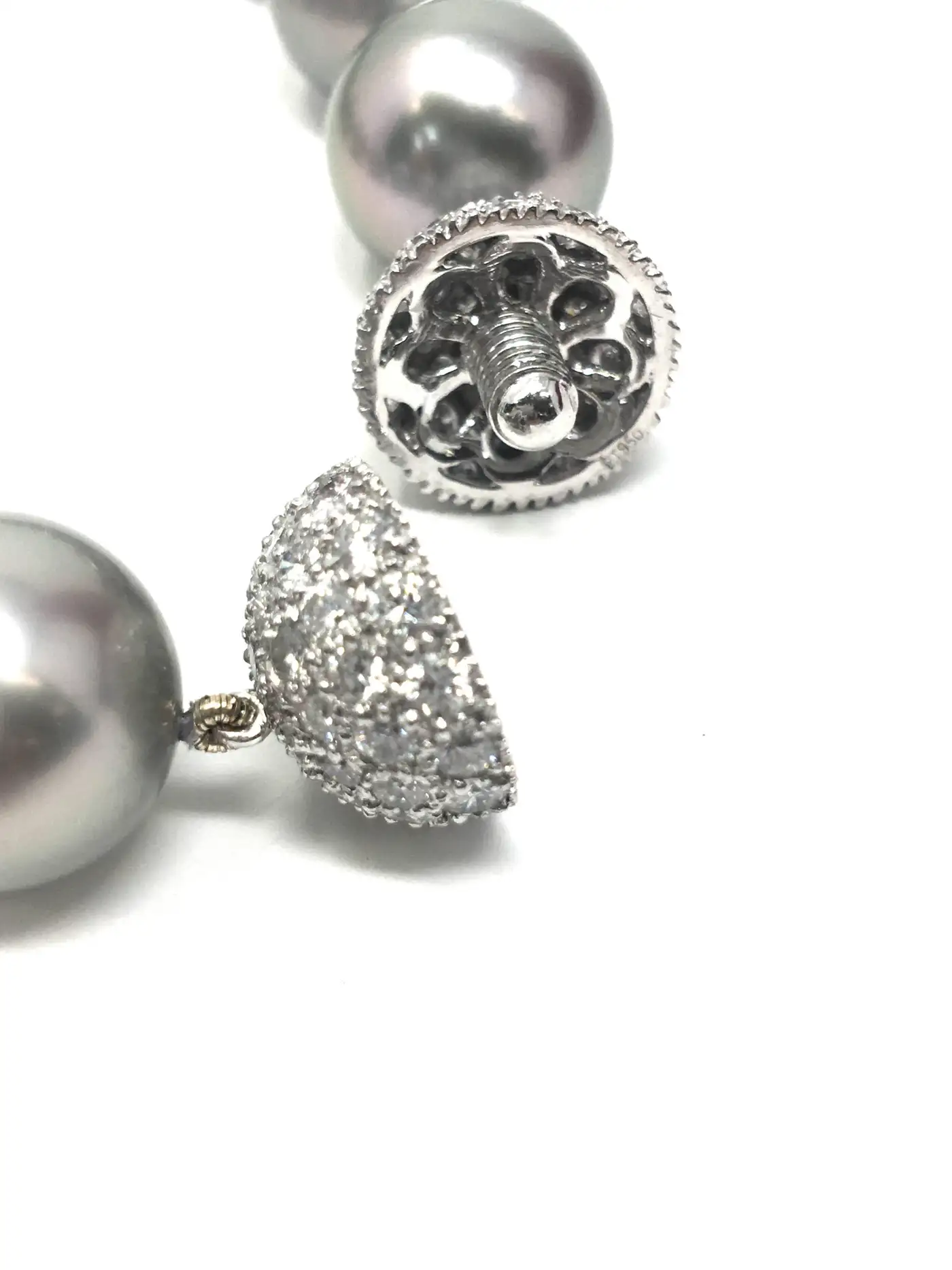 Beautiful Tahitian pearl necklace by Cartier… 27 greyish-purple colour pearls. Each pearl measures between 14-16mm. Securing the necklace is a white gold clasp decorated with collection quality diamonds. The necklace measures 18 inches in length.