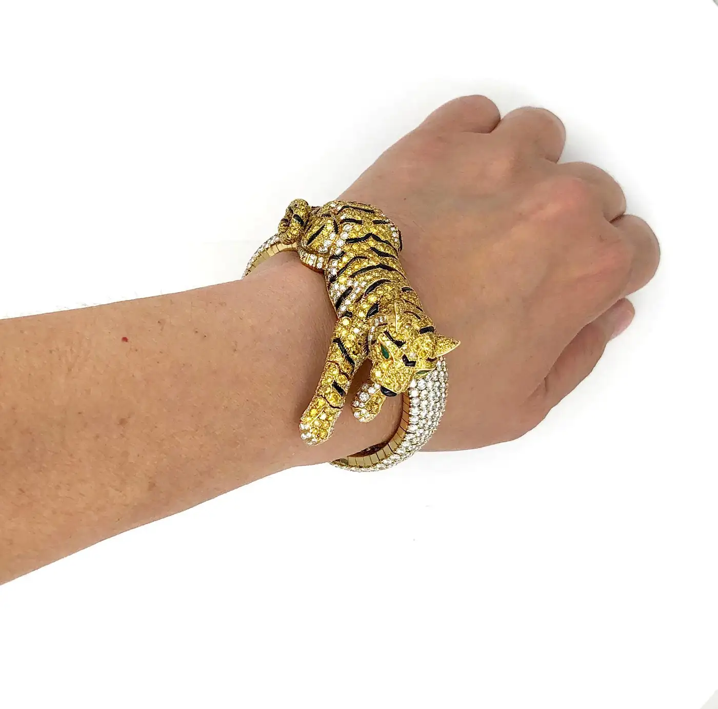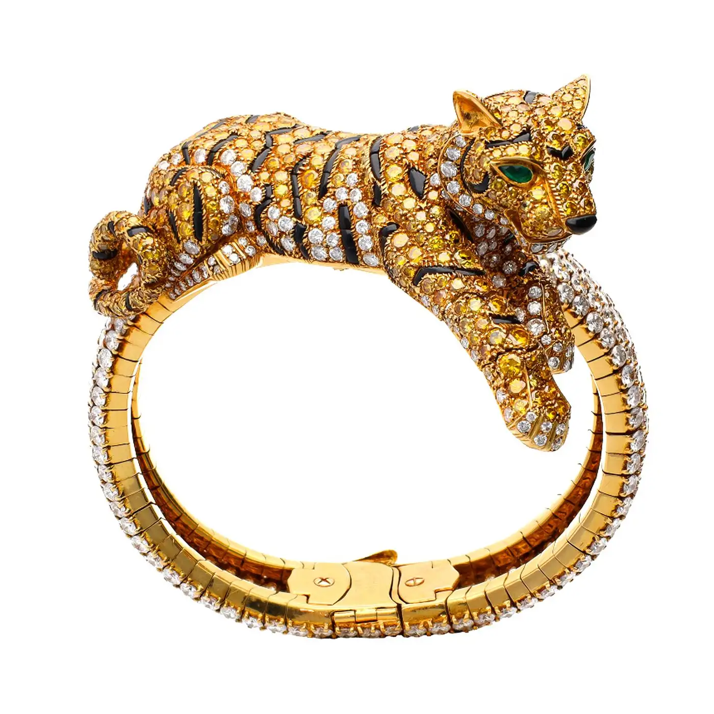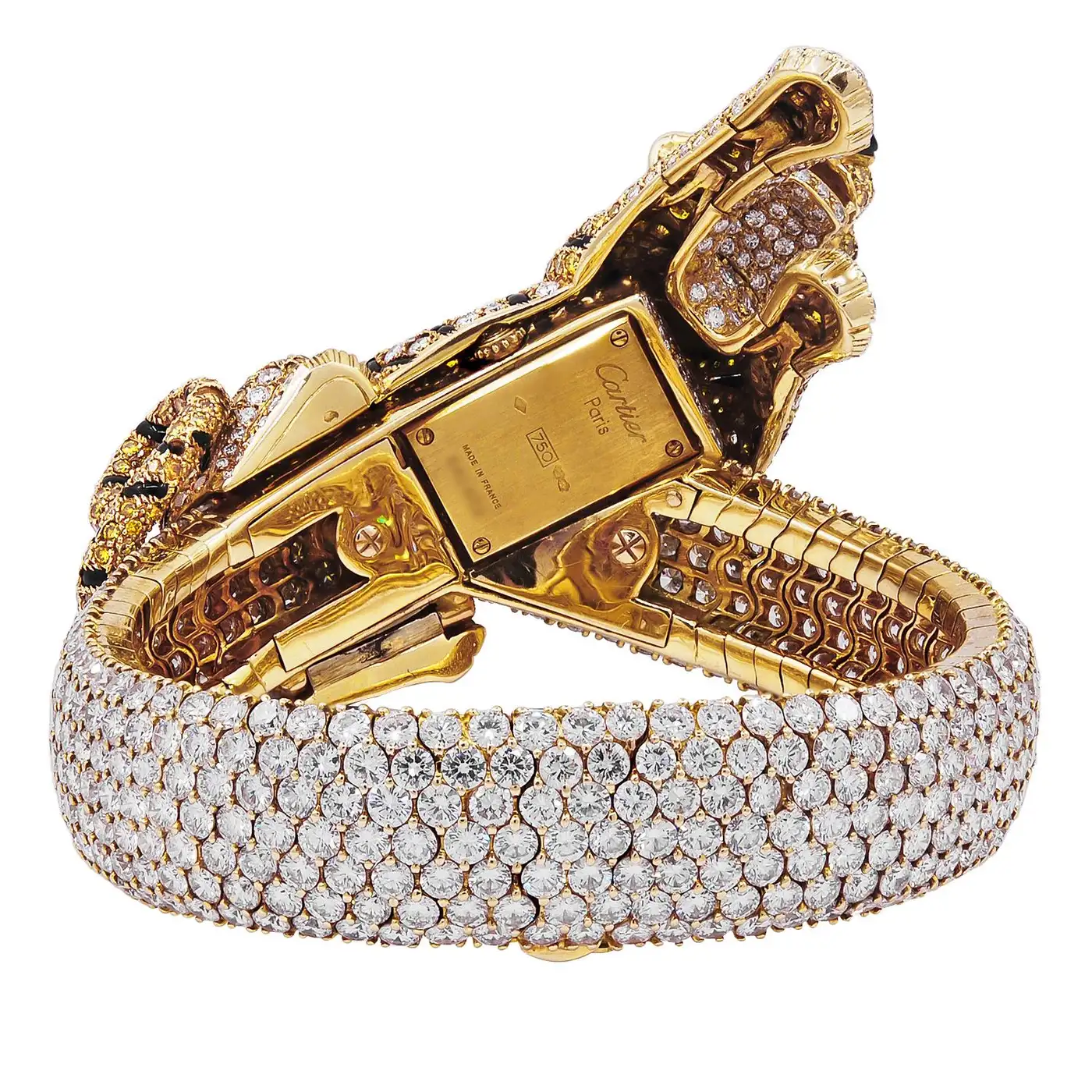 CARTIER Vivid Yellow, White Diamond Panther Watch A magnificent 18k yellow gold Panthere watch, set with vivid yellow and white diamonds, emerald eyes and onyx, signed Cartier with French hallmarks. Inner circumference is approx. 6″, bracelet width is approx. 0.59 Signed “Cartier Paris“; circa 1980s
