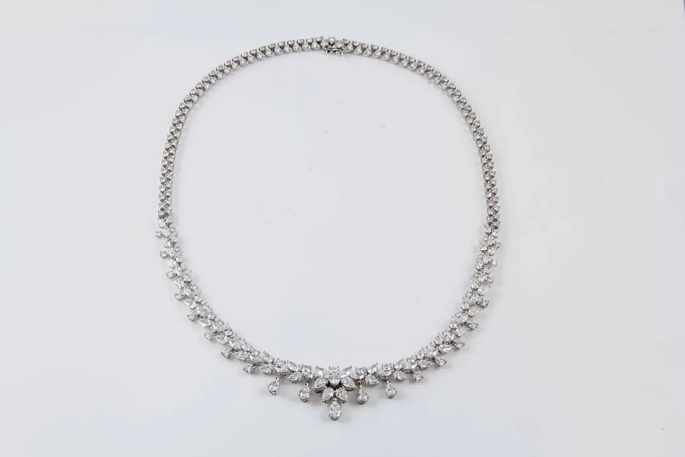 A beautiful necklace for any occasion! A stunning timeless design! 19.40 carats of round, pear and marquise shaped diamonds all F/G in colour VS clarity diamonds set in 18k white gold. Approximately 16 inches in length, the necklace can be shortened or lengthened upon request.
