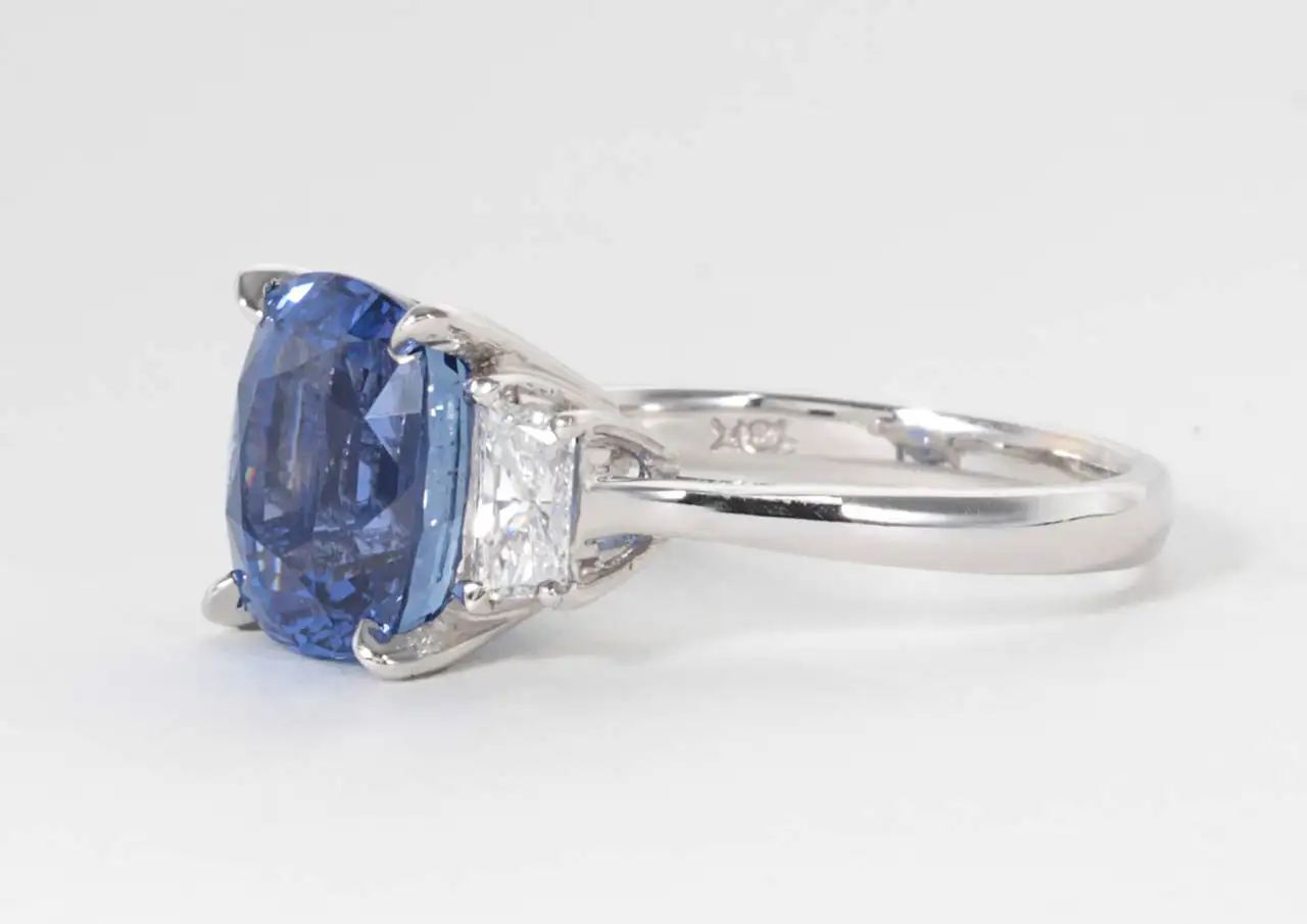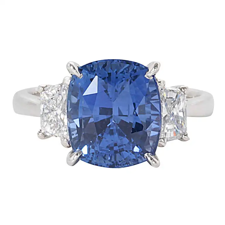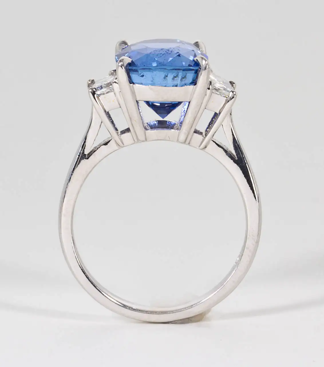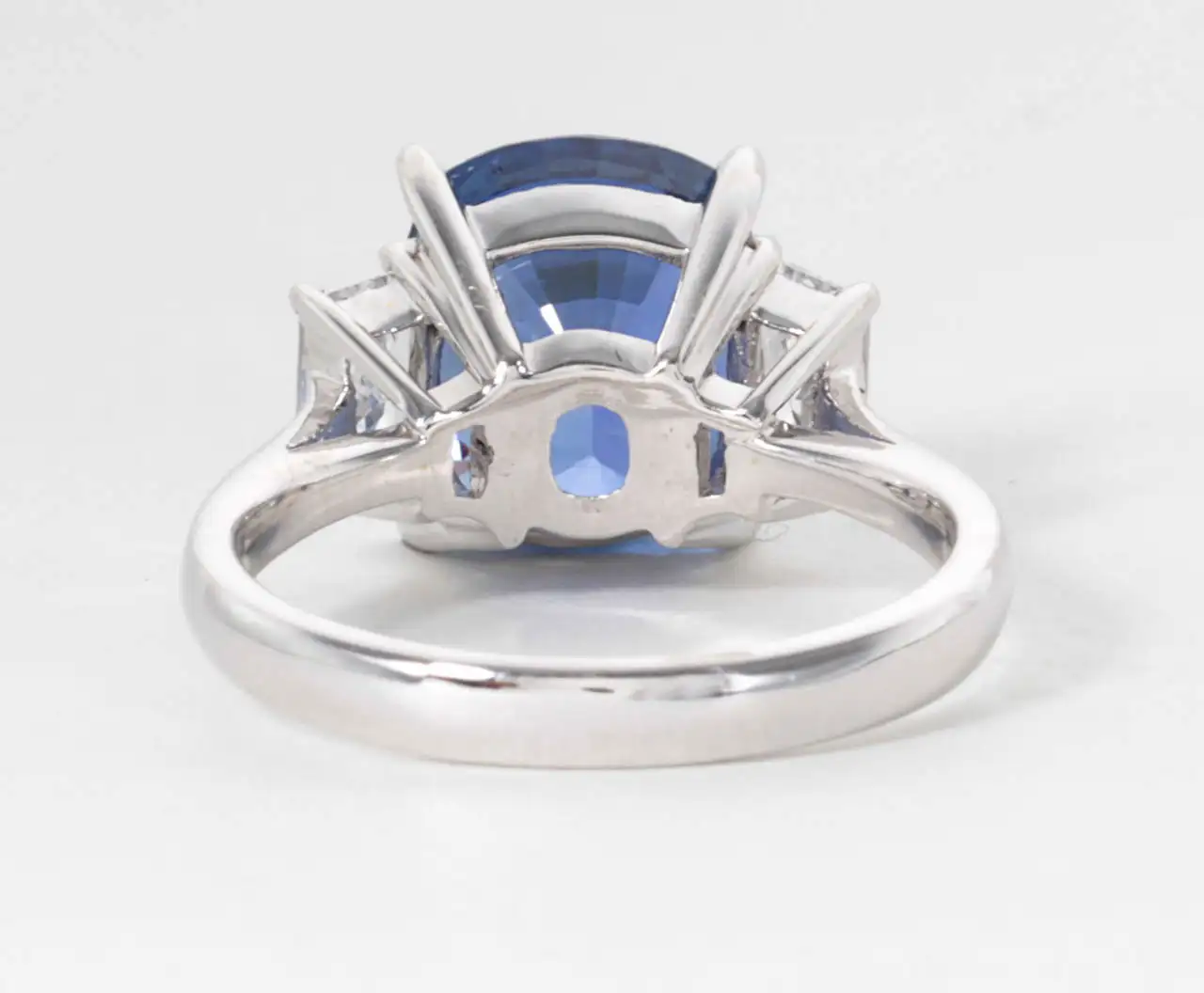 A gorgeous and very brilliant centre sapphire! 8.04 carats Cushion Modified Brilliant natural blue sapphire with minimal heat certified by GIA. This centre sapphire is set in a 18k white gold custom handmade mounting set with trapezoid brilliant cut diamonds weighing .75 carats. A beautiful blue sapphire ring with a unique shape that is extremely brilliant.