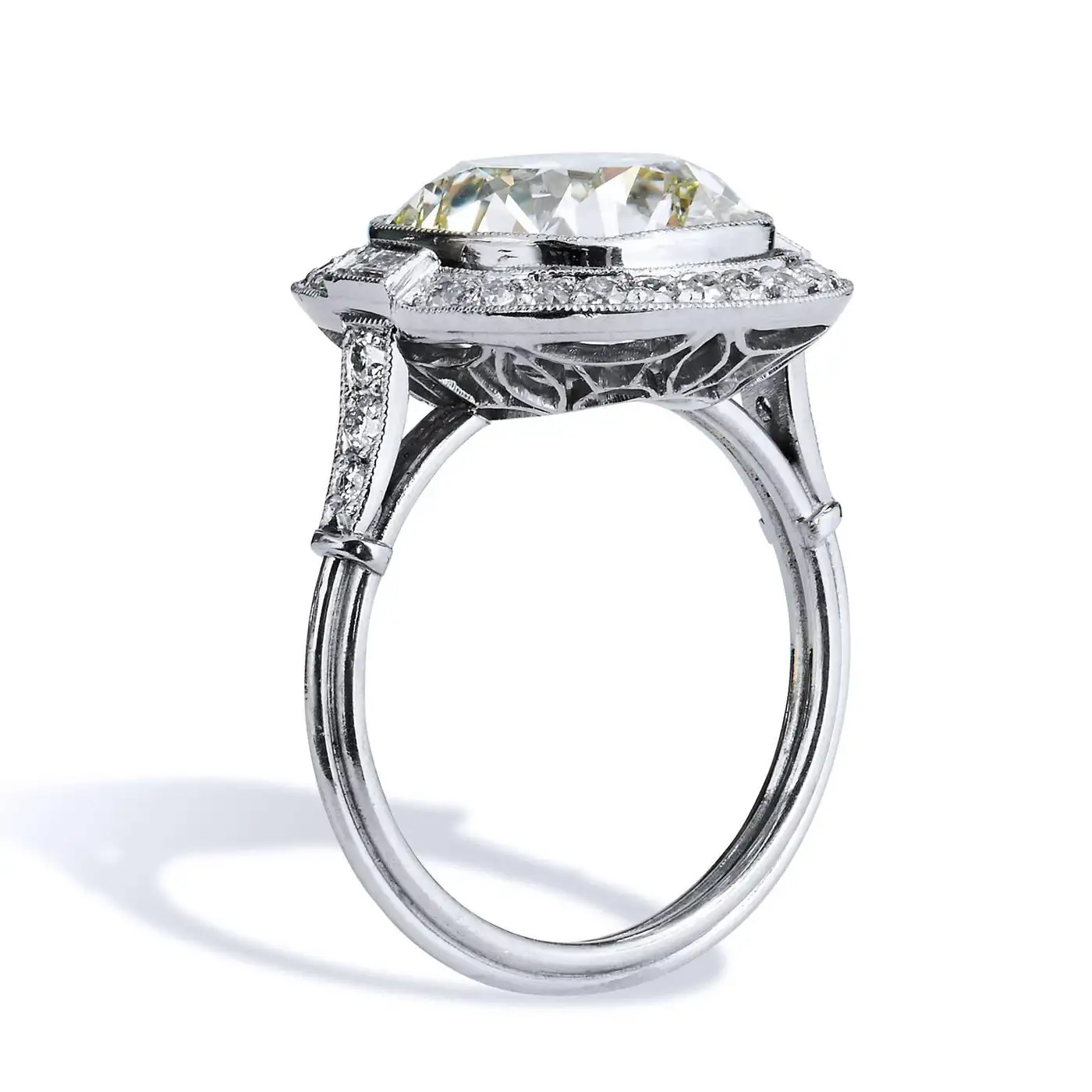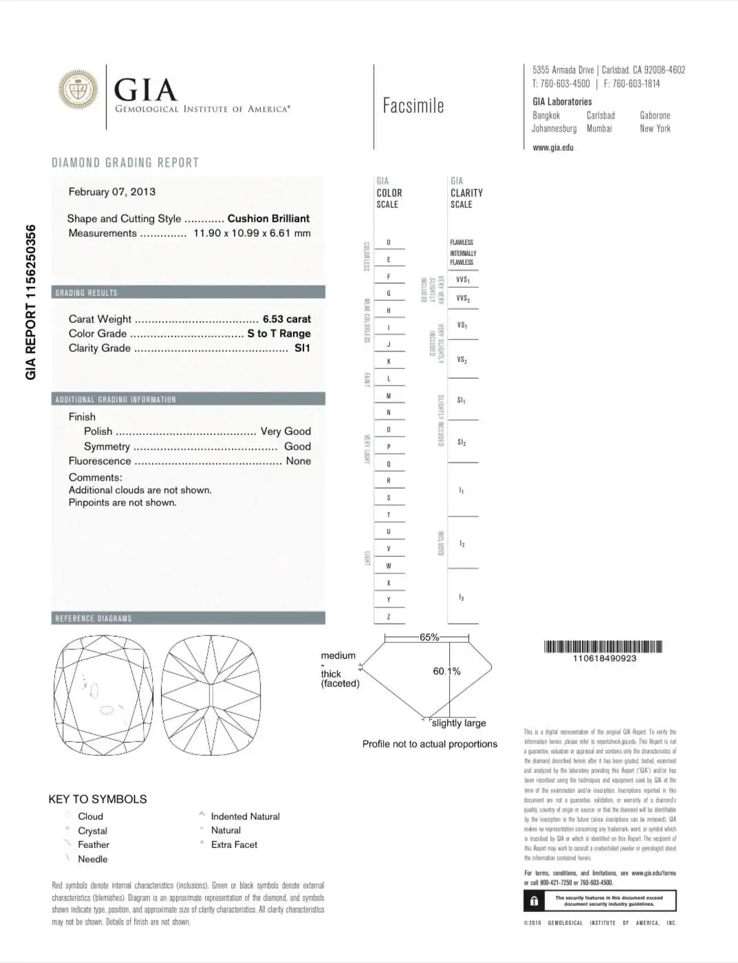 GIA Certified 6.53 Carat Cushion Cut Diamond & Modern Old European & Baguettes. This gorgeous 6.53 carat diamond ring of platinum scores the highest marks. It is S-T in colour and has a clarity of SI1. Designed and manufactured by H&H Jewels which make this stunning ring a one of a kind. It is all done in Platinum. It has a striking bezel set, 6.53 carat cushion brilliant diamond, surrounded by 24 modern old European cut and 2 baguette diamonds, with an additional 6 round diamonds bead set on the rings shank, for a total diamond weight of .75 carats This diamond mixed with modern design is offered with a GIA Diamond Grading Report #1156250356. Currently a size 7.5 Complimentary ring sizing is available upon request