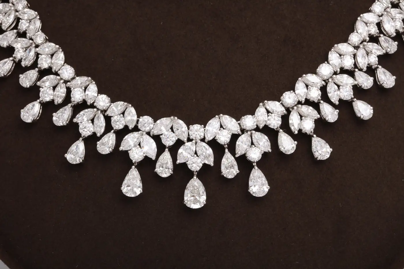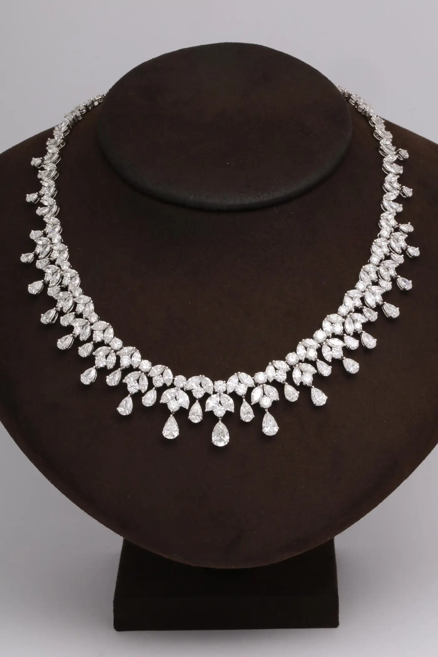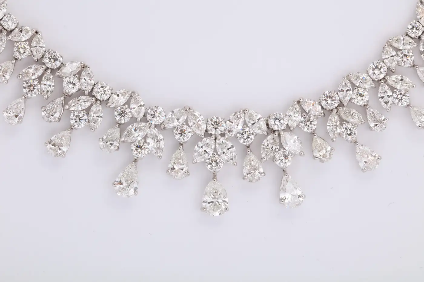One of our favourite designs, this necklace is SPECTACULAR!! A timeless design featuring 48.28 carats of white pear, marquise and round cut diamonds set in platinum. A grand piece — the perfect addition to any collection. 16 inch length that can be adjusted if necessary.