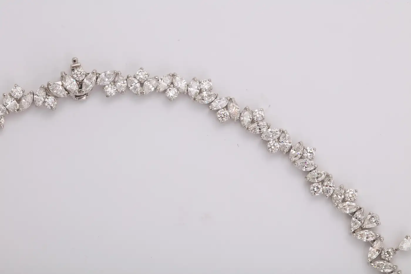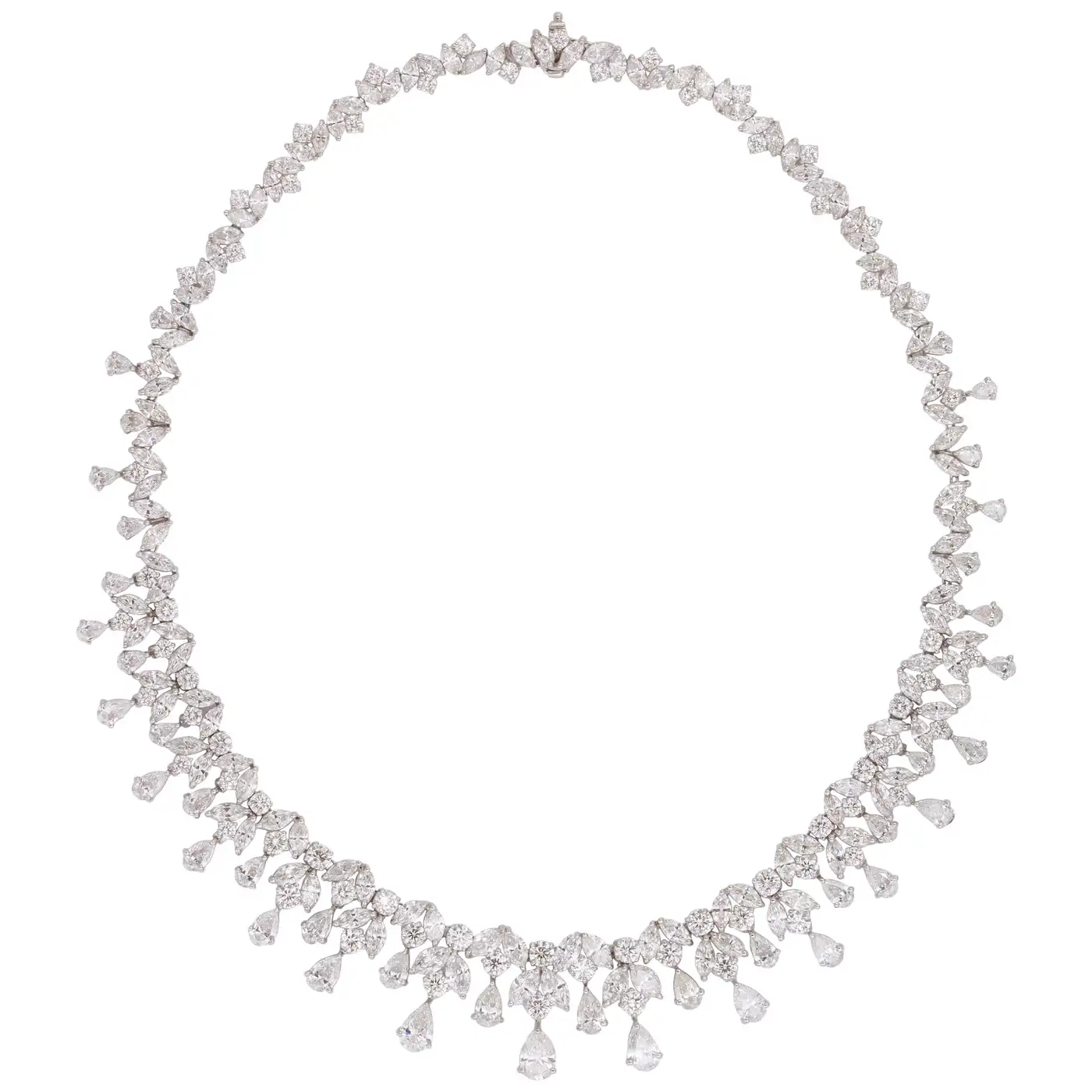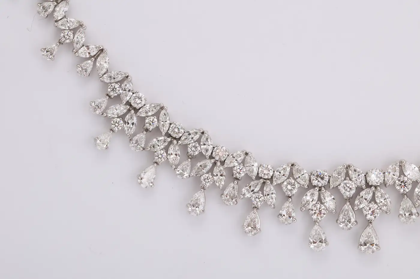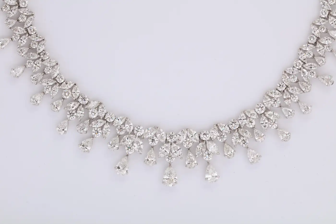 One of our favourite designs, this necklace is SPECTACULAR!! A timeless design featuring 48.28 carats of white pear, marquise and round cut diamonds set in platinum. A grand piece — the perfect addition to any collection. 16 inch length that can be adjusted if necessary.