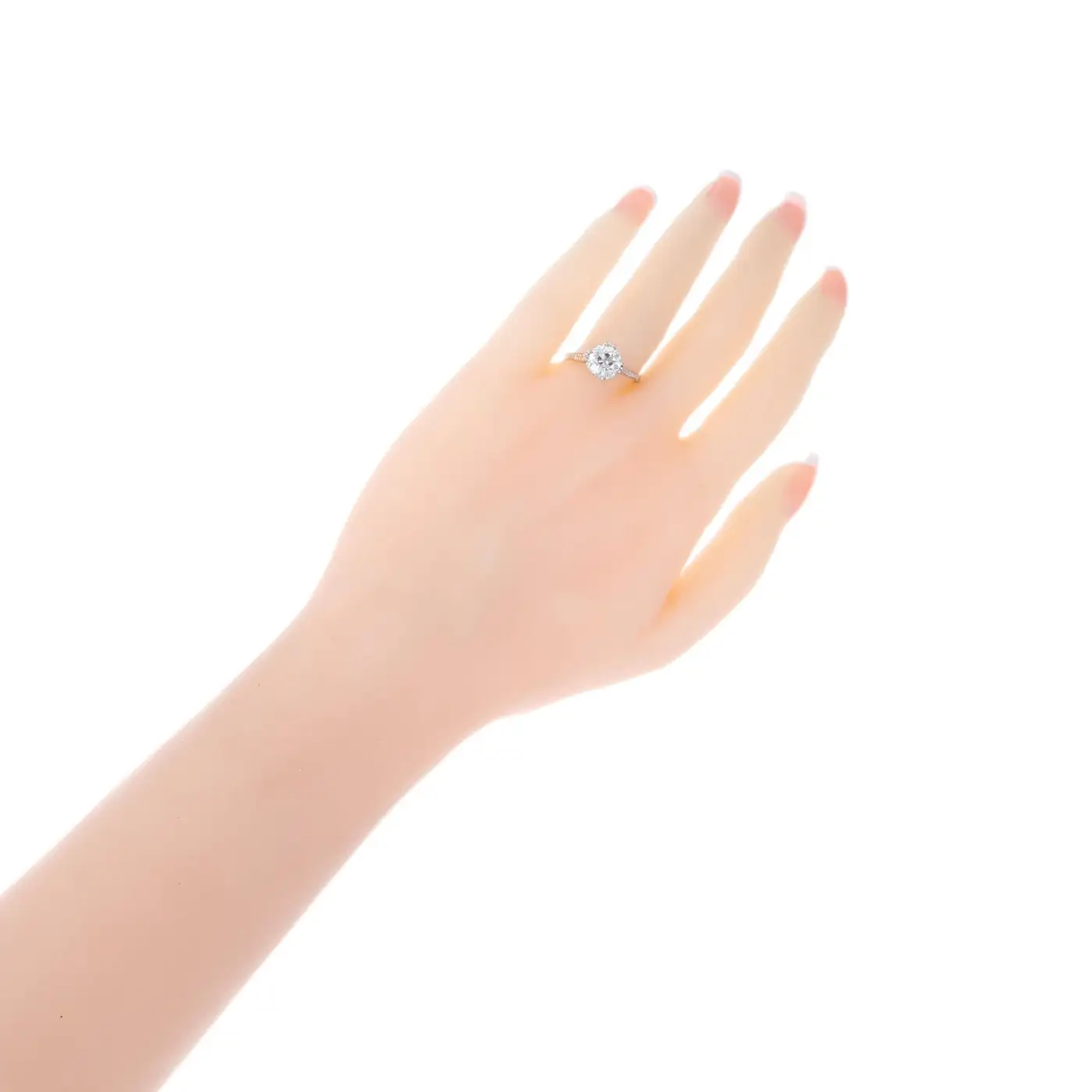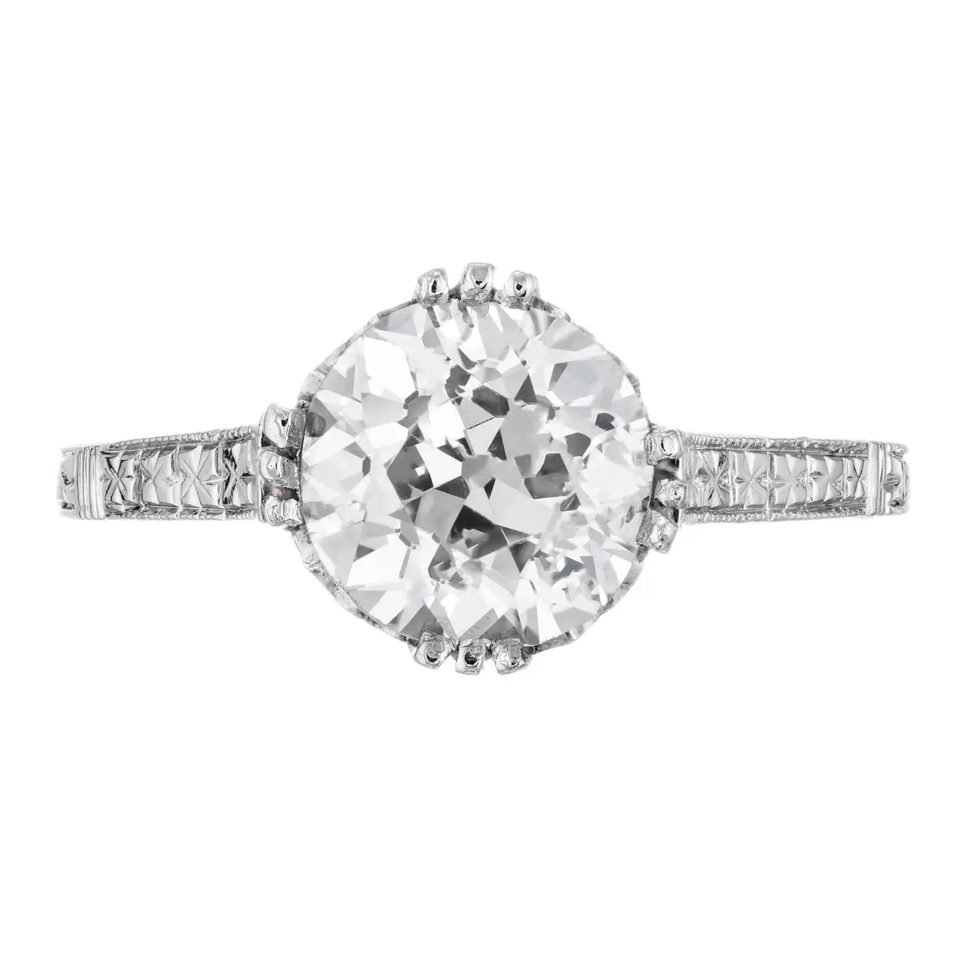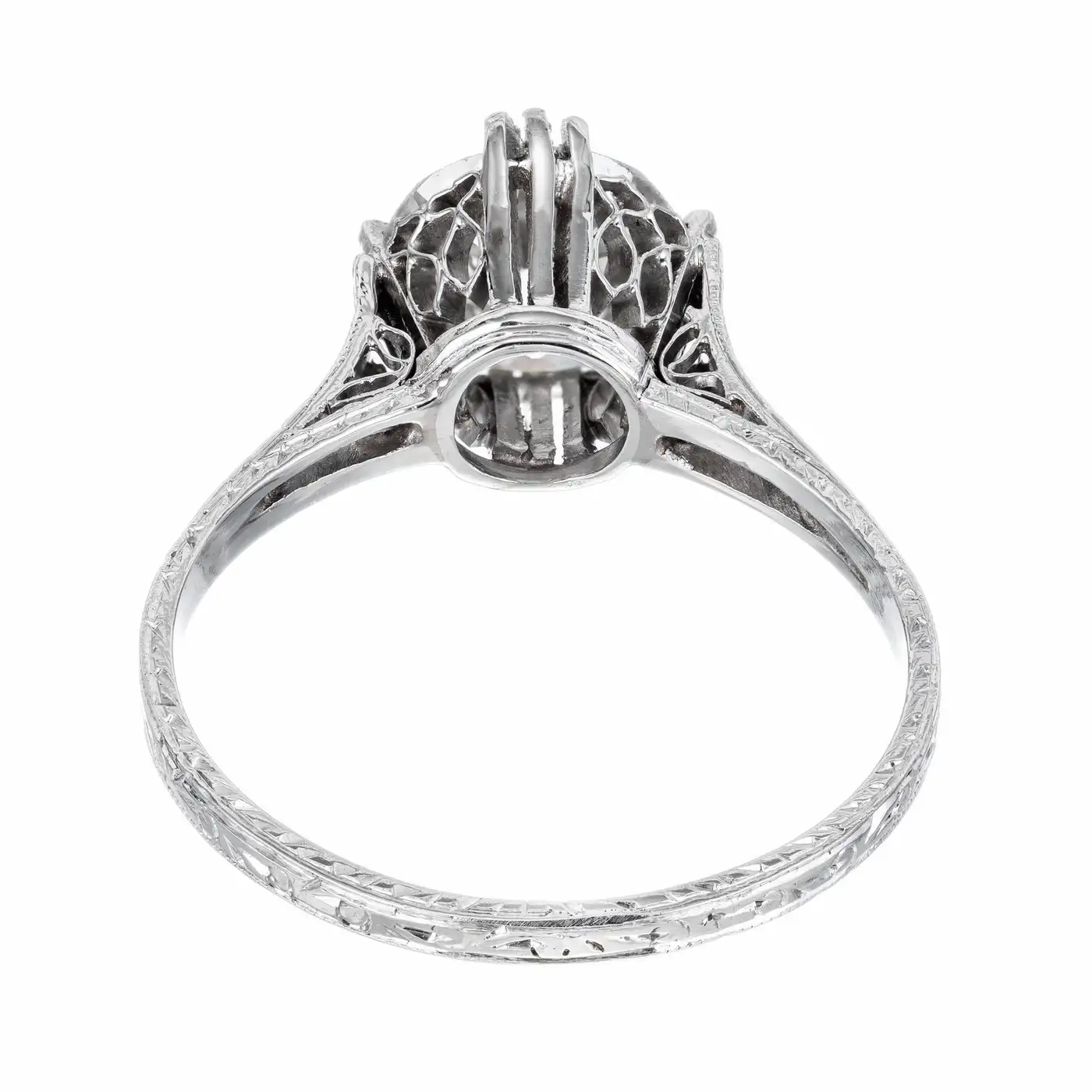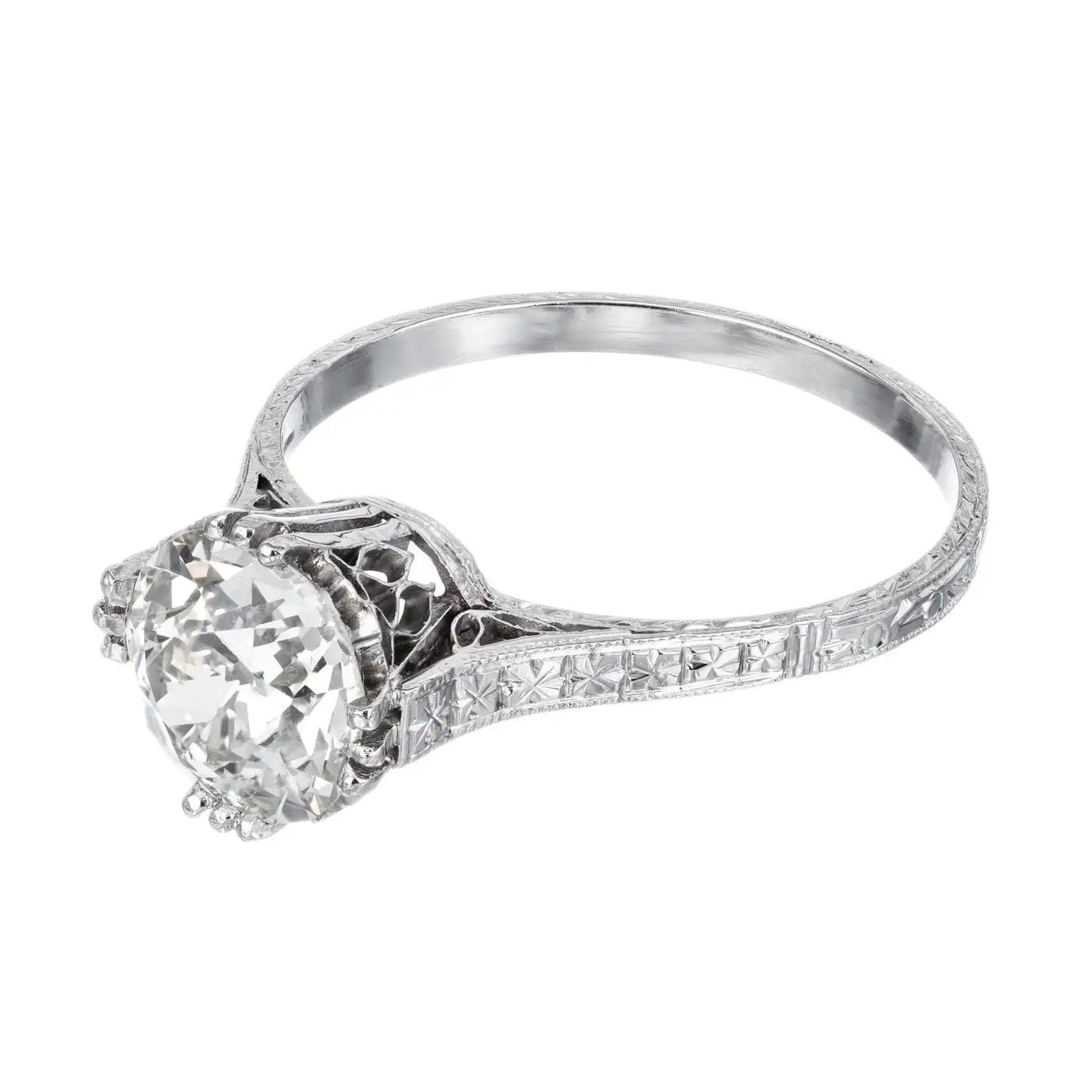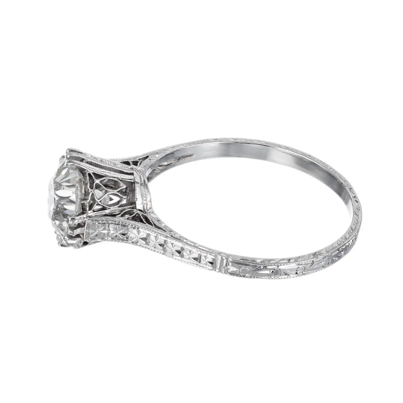 EGL certfied Old European Ideal cut centre diamond in a pierced and engraved platinum setting.