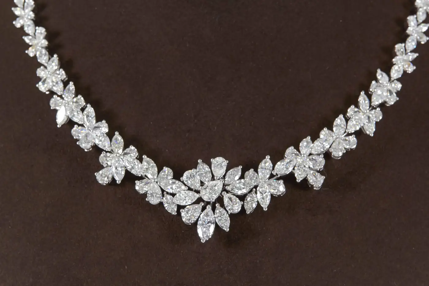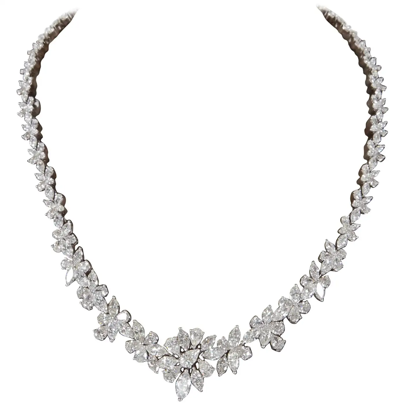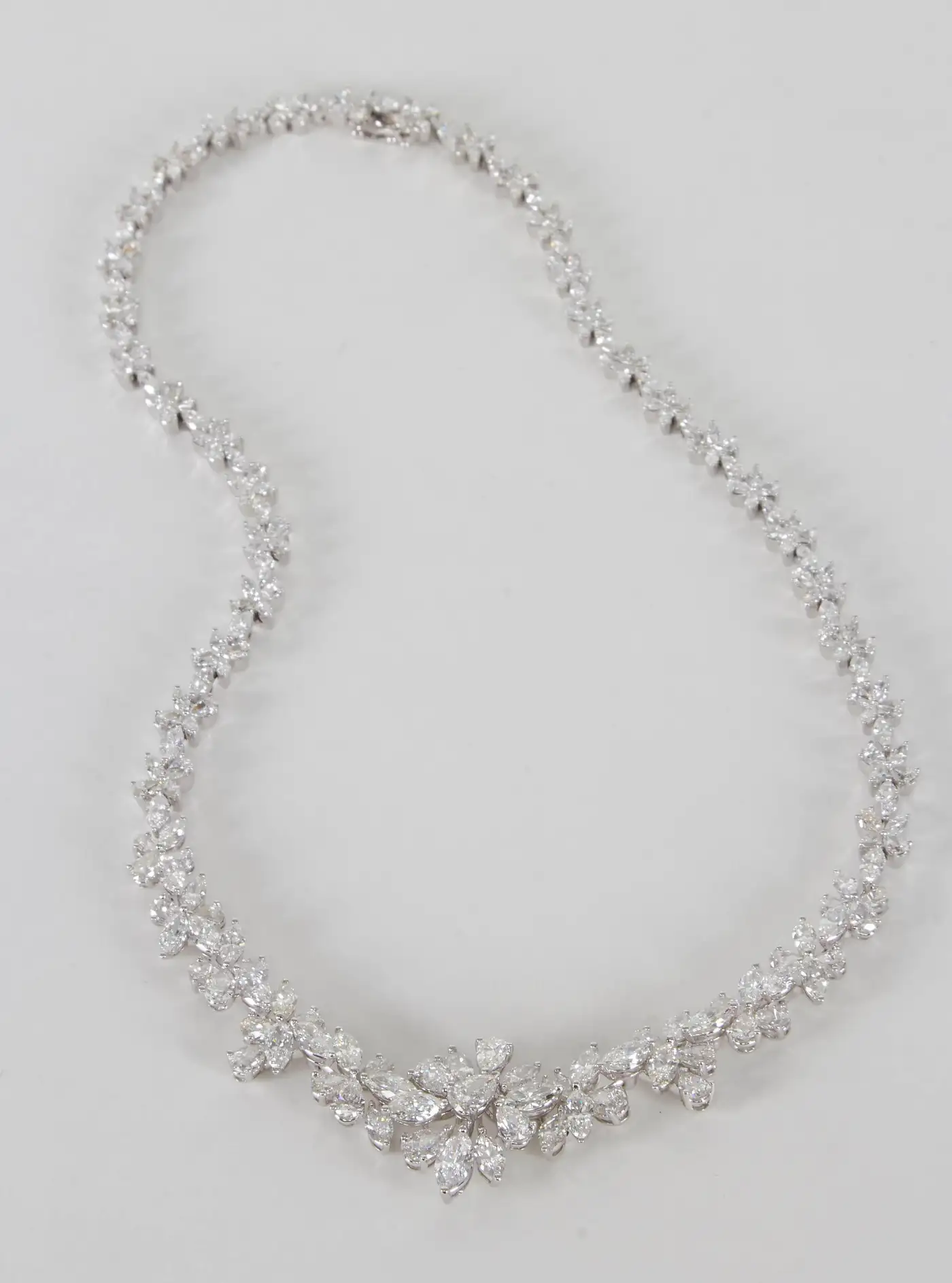 A beautiful necklace in a timeless design. Pear shape and marquise cut diamonds make up this magnificent piece. 28.05 carats of F/G colour VS clarity diamonds set in 18k white gold. 16 inch length that can be adjusted if needed.
