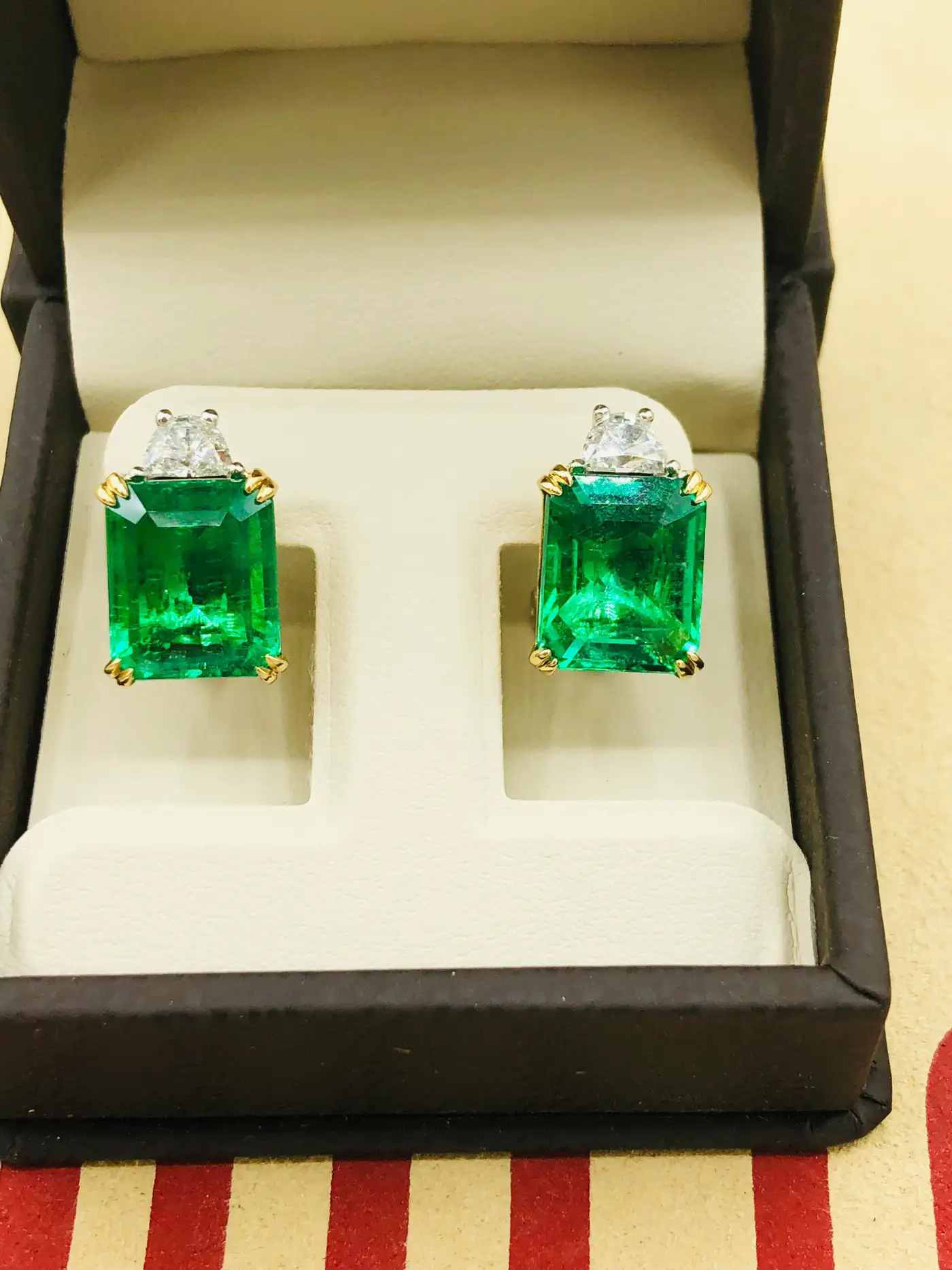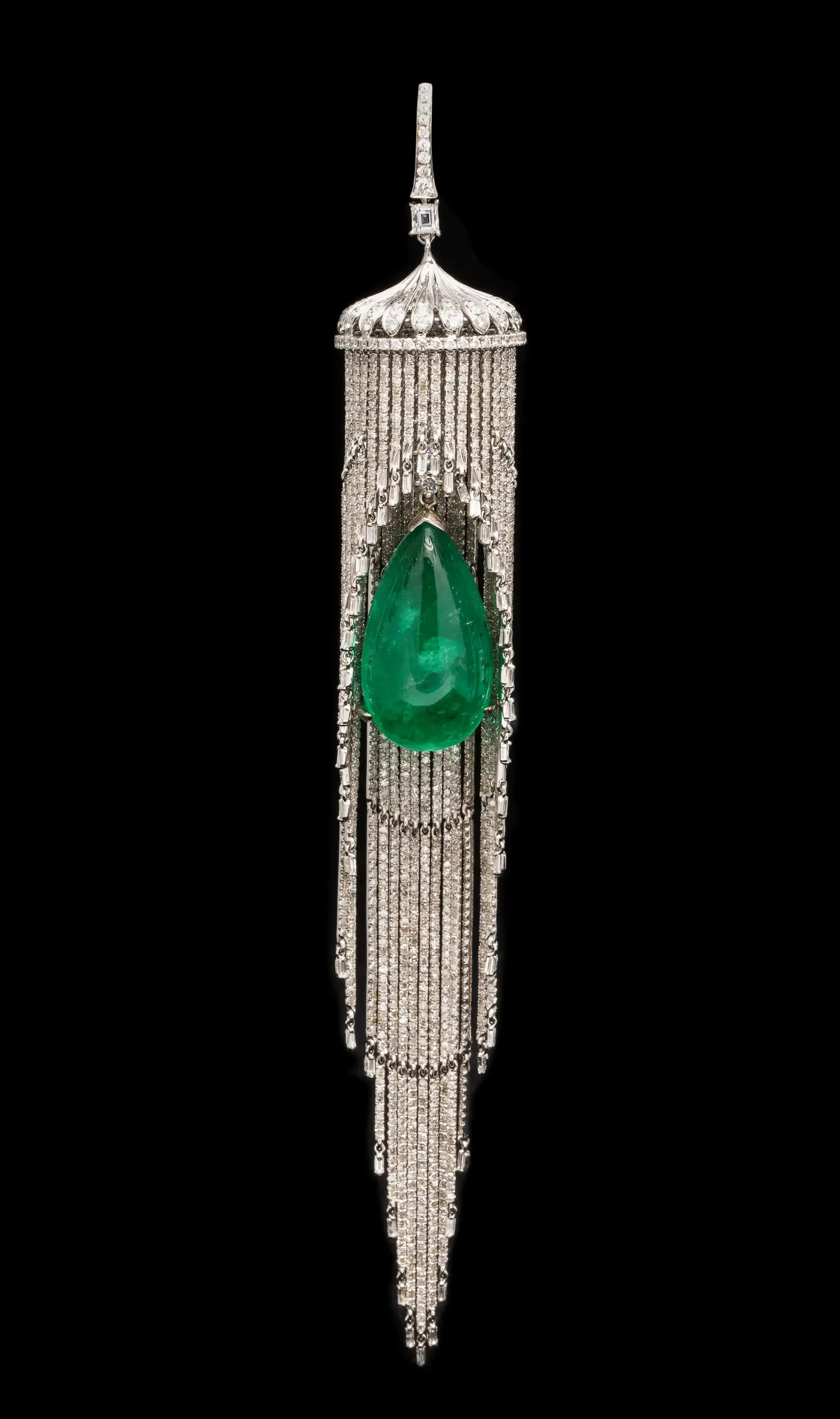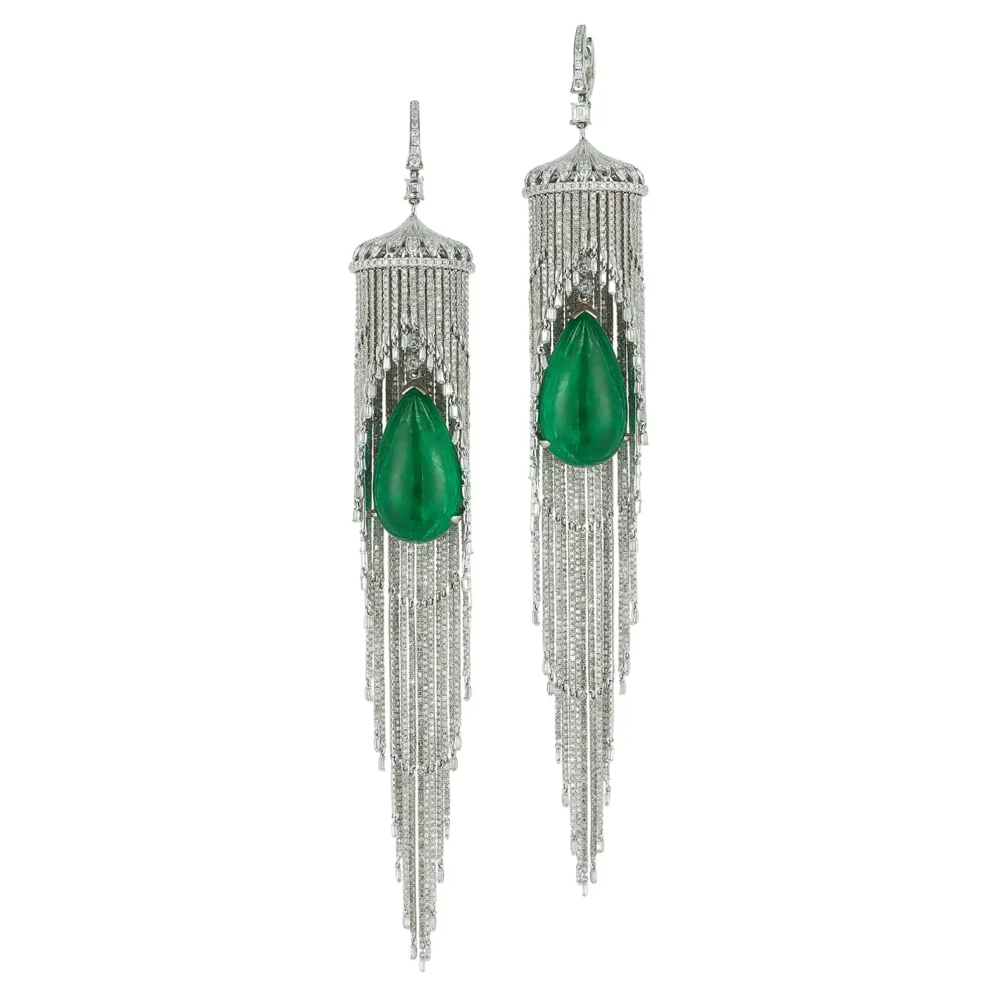 Emerald and Diamond Chandelier Earrings The Emeralds are 26.08 ct, 26.78 ct respectively 18.47 ct of Diamonds.