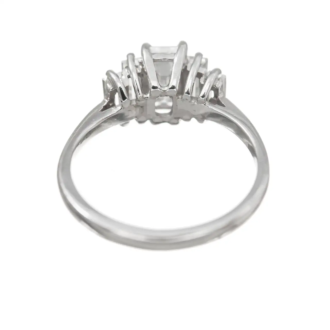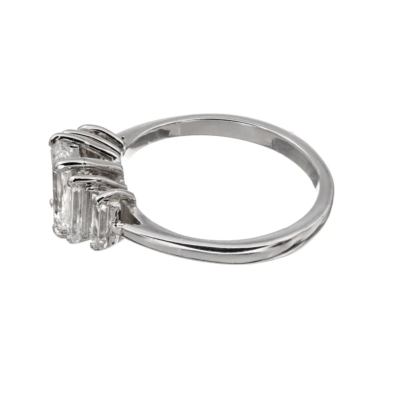 Emerald and baguette cut diamond engagement ring, in a handmade platinum setting circa 1980s. 1 Emerald cut 0.94 carat diamond, F colour and VS2 clarity GIA certificate # 5195224 2 straight baguette cut diamonds, F VS2 Approx. .37 ct total 2 straight baguette cut diamonds, F VS Approx. .30 ct total.