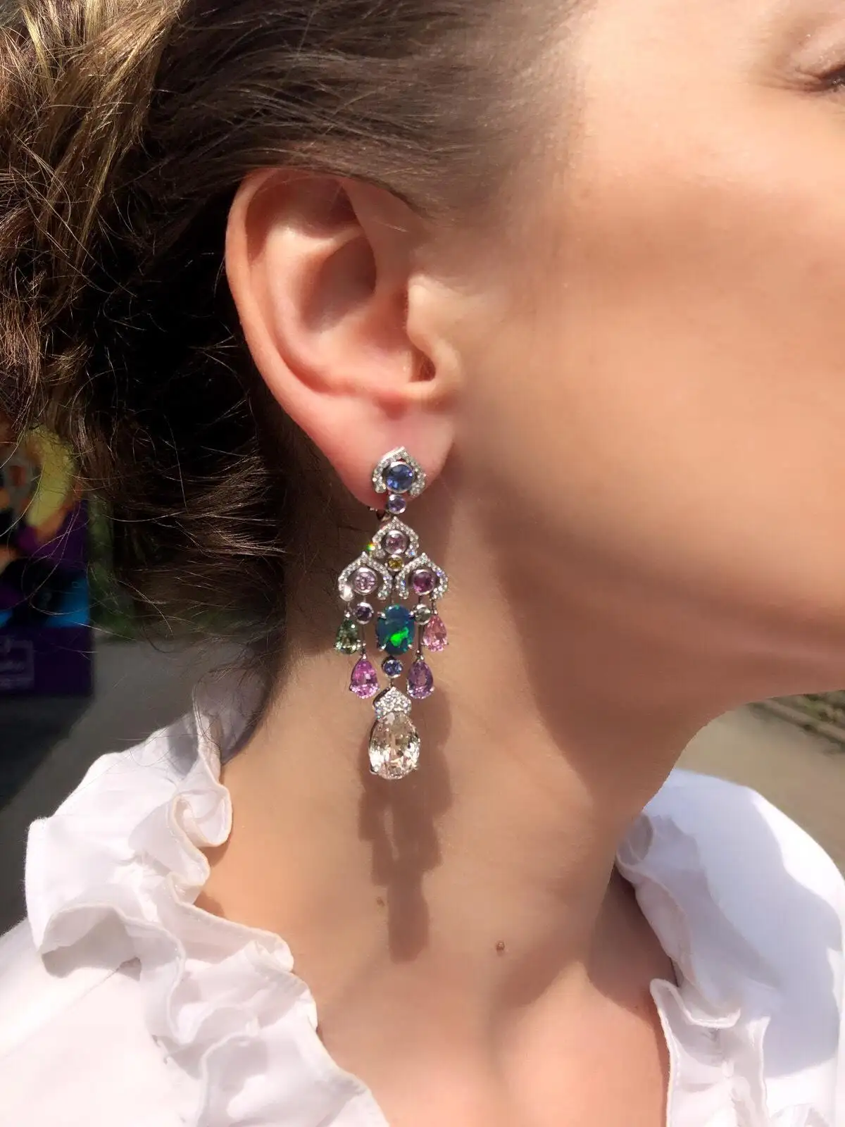 Fabergé workmaster collections, capsule collections and jewellery suites each tell a story inspired by Fabergé’s rich legacy – masterpieces possessing the modernity, refinement and technical perfection of Fabergé’s original captivating works of genius. Délices D’Été Earrings feature round white diamonds and pear shape multi-coloured sapphires set in 18 carat white gold.