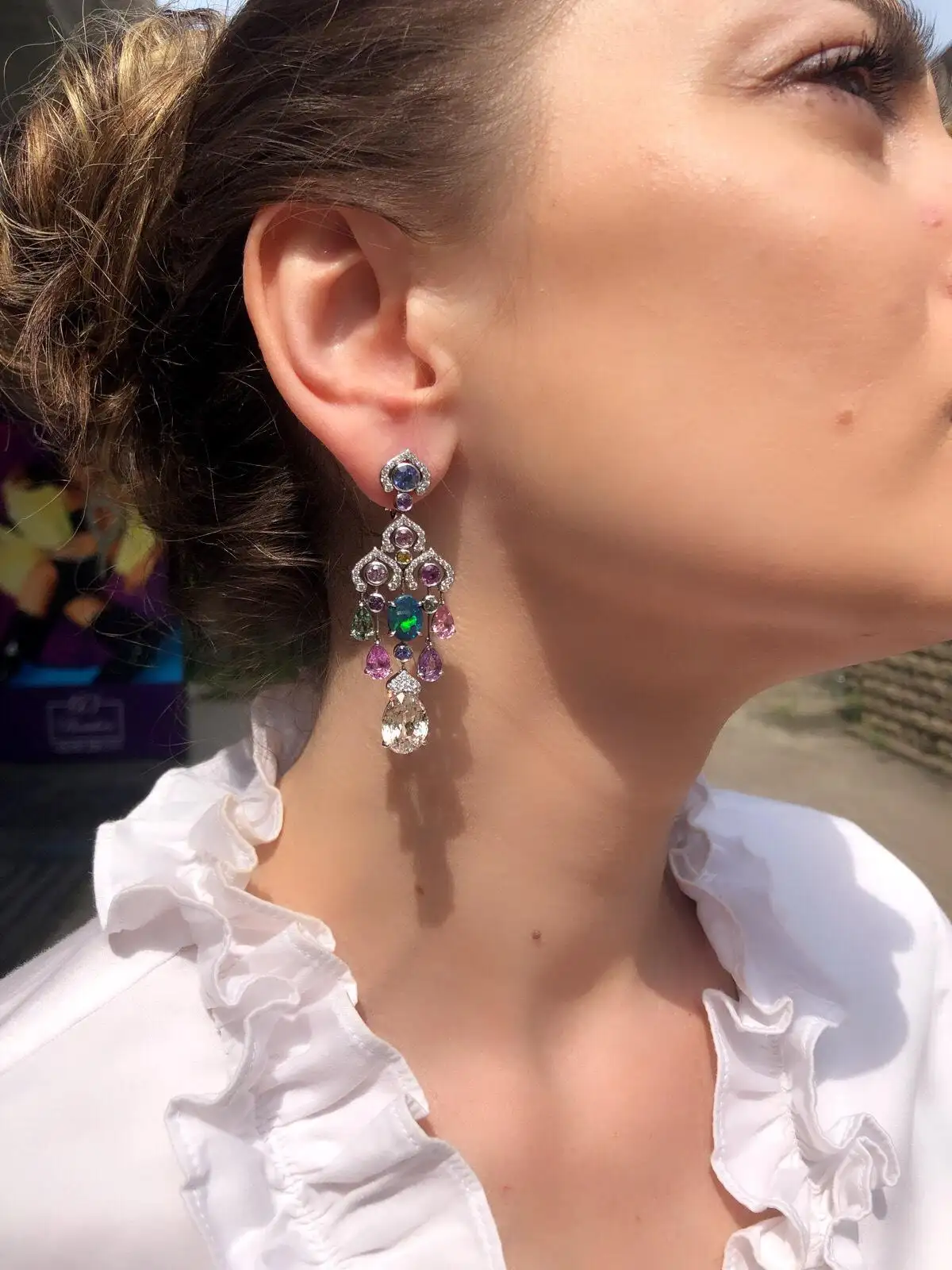 18kt White Gold 21.10 grammes 8 Pear Multicoloured Sapphires 6,53cts 18 Round Multicoloured Sapphires 3.87cts 144 Round White Diamonds 1,22cts 2 Oval Black Opals 2.39 cts 2 Pear Shape Yellow Sapphire 14.52 cts