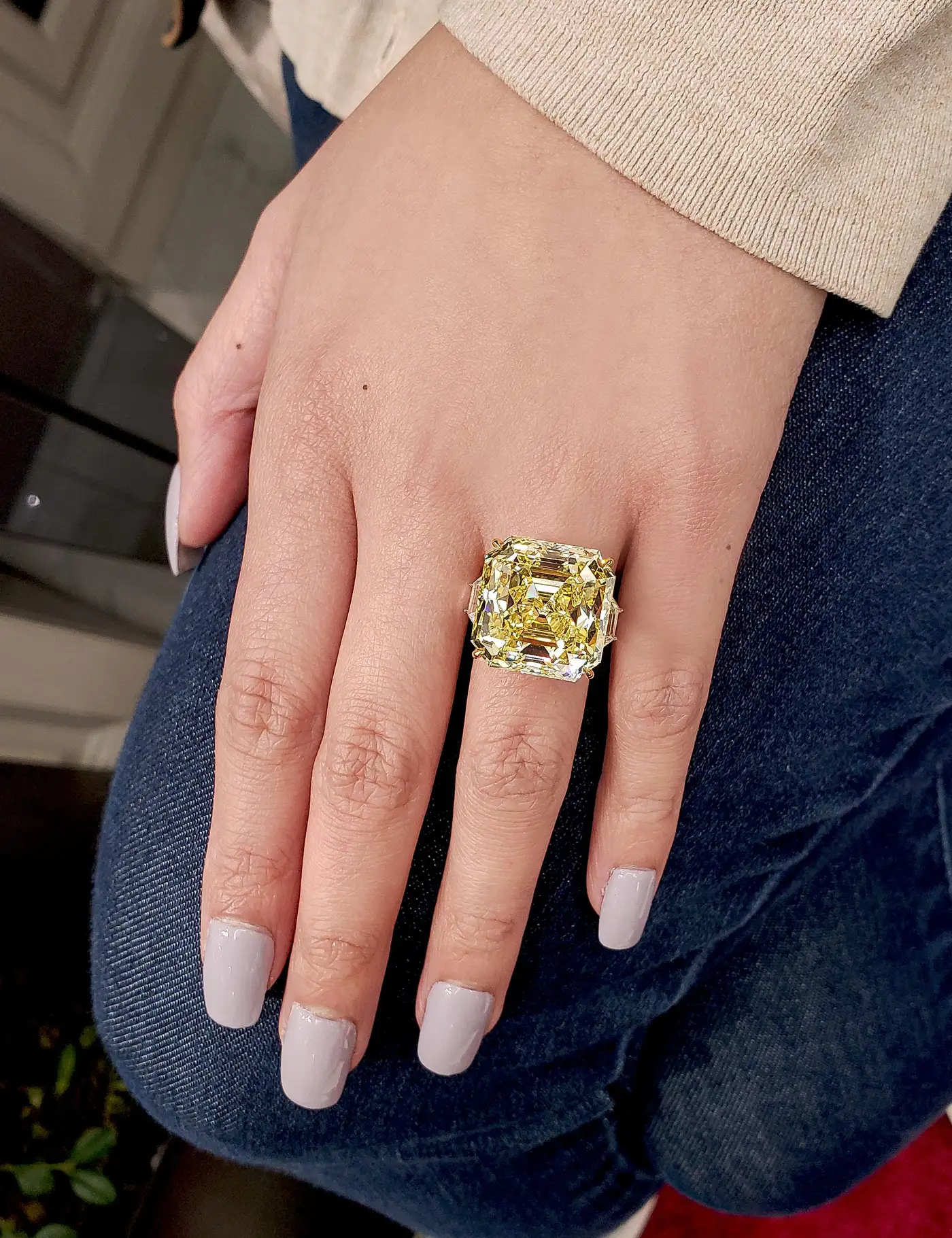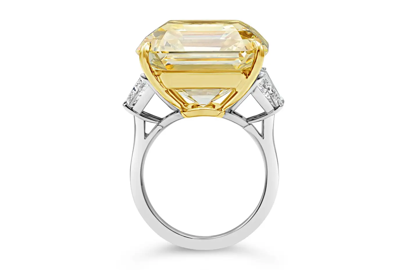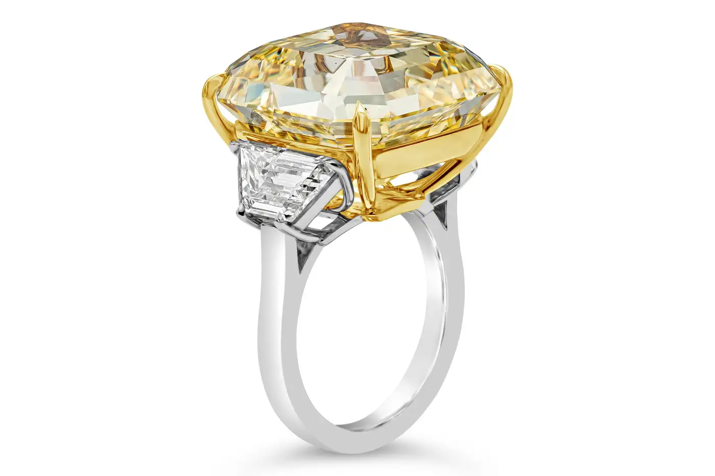 A very rare piece of jewellery that will catch everyone”s eye. Features a stunning 30.02 carat Asscher cut diamond that GIA certified as Fancy Intense Yellow (FIY) colour and VVS2 clarity. Elegantly set in an 18k yellow gold basket, the centre stone is flanked by trapezoid diamond side stones weighing 2.35 carats total. Expertly-crafted in a polished platinum composition. Magnificence at it”s finest.