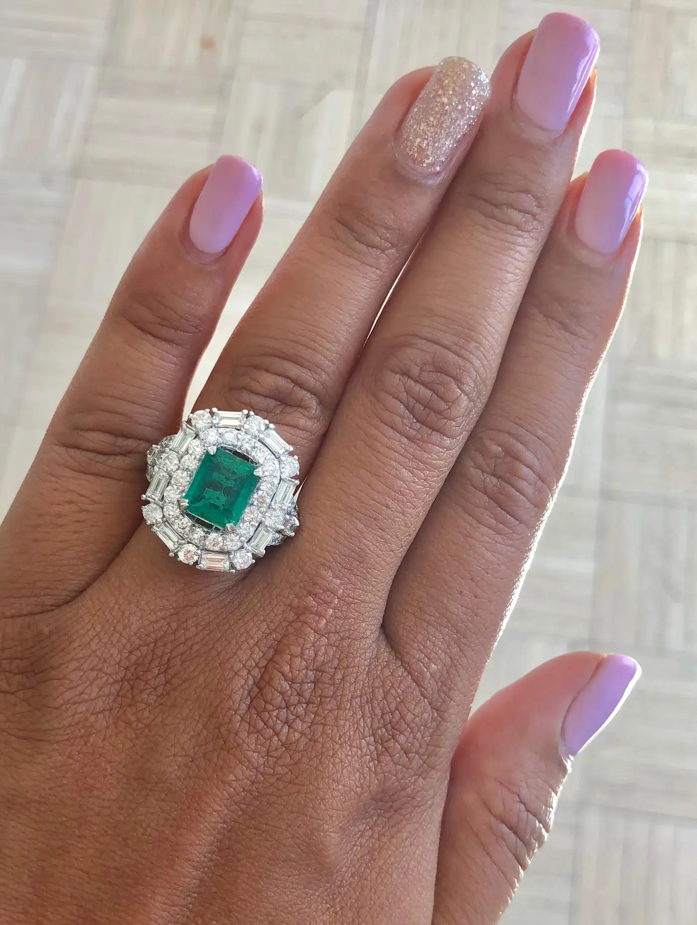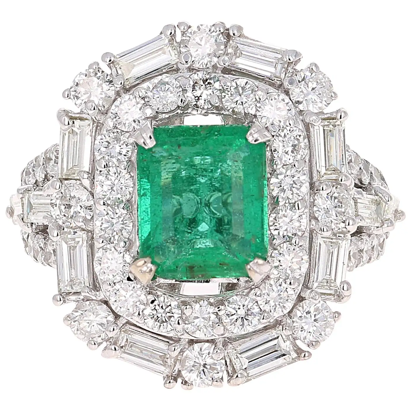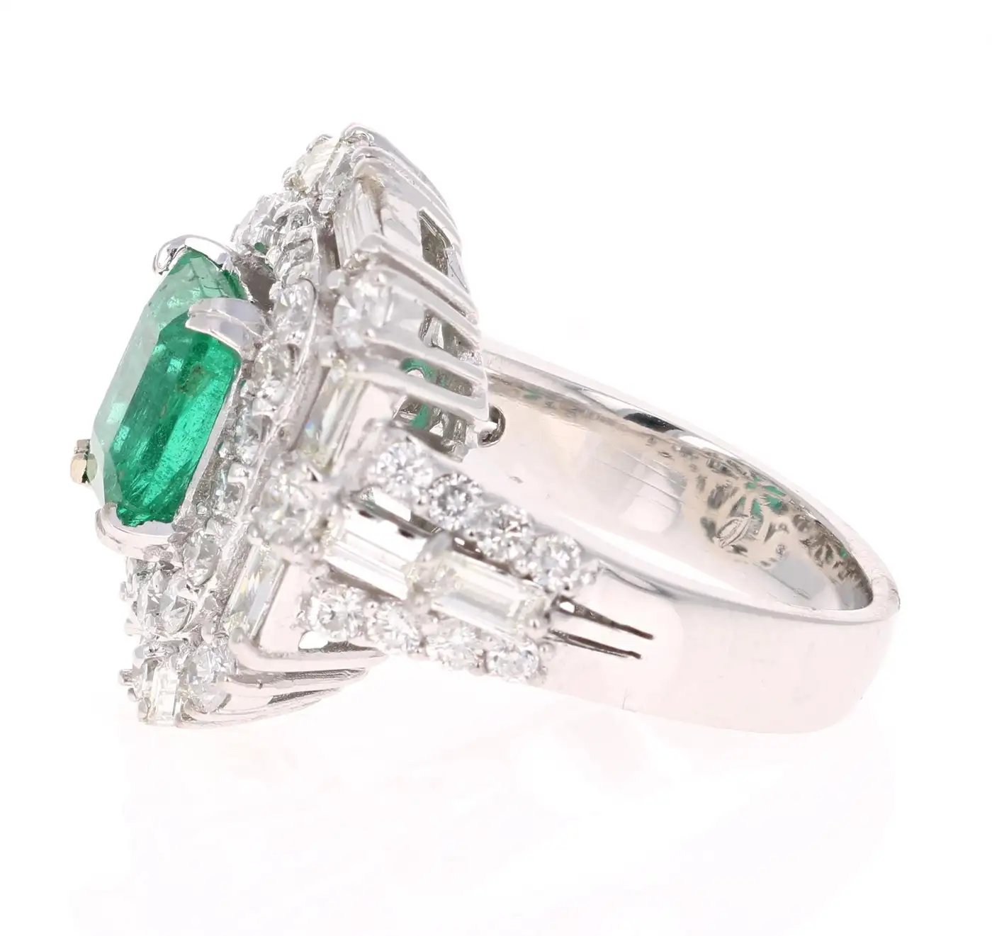 The Emerald is surrounded by 42 Round Cut Diamonds that weigh 1.75 carats and 12 Straight Cut Baguette Diamonds that weigh 0.86 carats. The Clarity is a SI2 and the Colour is an I. The total carat weight of the ring is 5.06 carats. The ring is casted in 18K White Gold and weighs approximately 12.8 grammes The ring is a size 7 and complimentary ring size is available upon request.