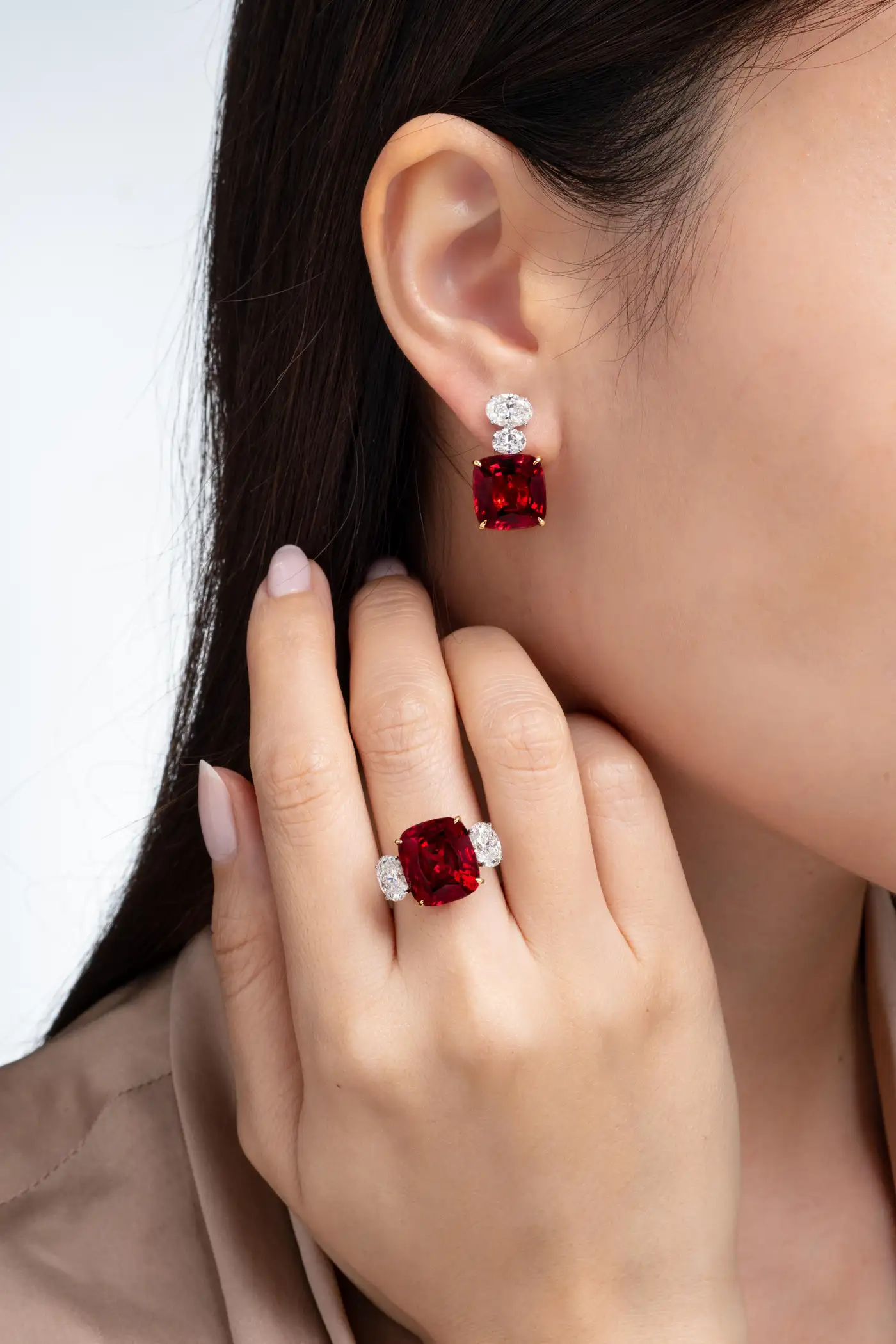 Both Burmese Spinels are certified by GRS as being natural “vivid reds,” each cushion is 8.27 carats (GRS Report 2019-011496) and 9.31 carats (GRS Report 2019-011497). The spinels have also been certified by Gubelin as no heat with Burma origins (Gubelin #19011228). The earrings also feature 4 oval diamonds, all certified by the GIA. The oval shaped diamonds are 1.03 carats E colour, VVS2 clarity (GIA Certificate #6173891269), 1.0 carats E colour, VVS2 clarity (GIA Certificate #1176849473), 0.5 carat D colour, VS2 clarity (GIA Certificate #2146713135) and 0.5 carat D colour, VS2 clarity (GIA Certificate #2166252585). The earrings have a total carat weight of 21.50 carats.