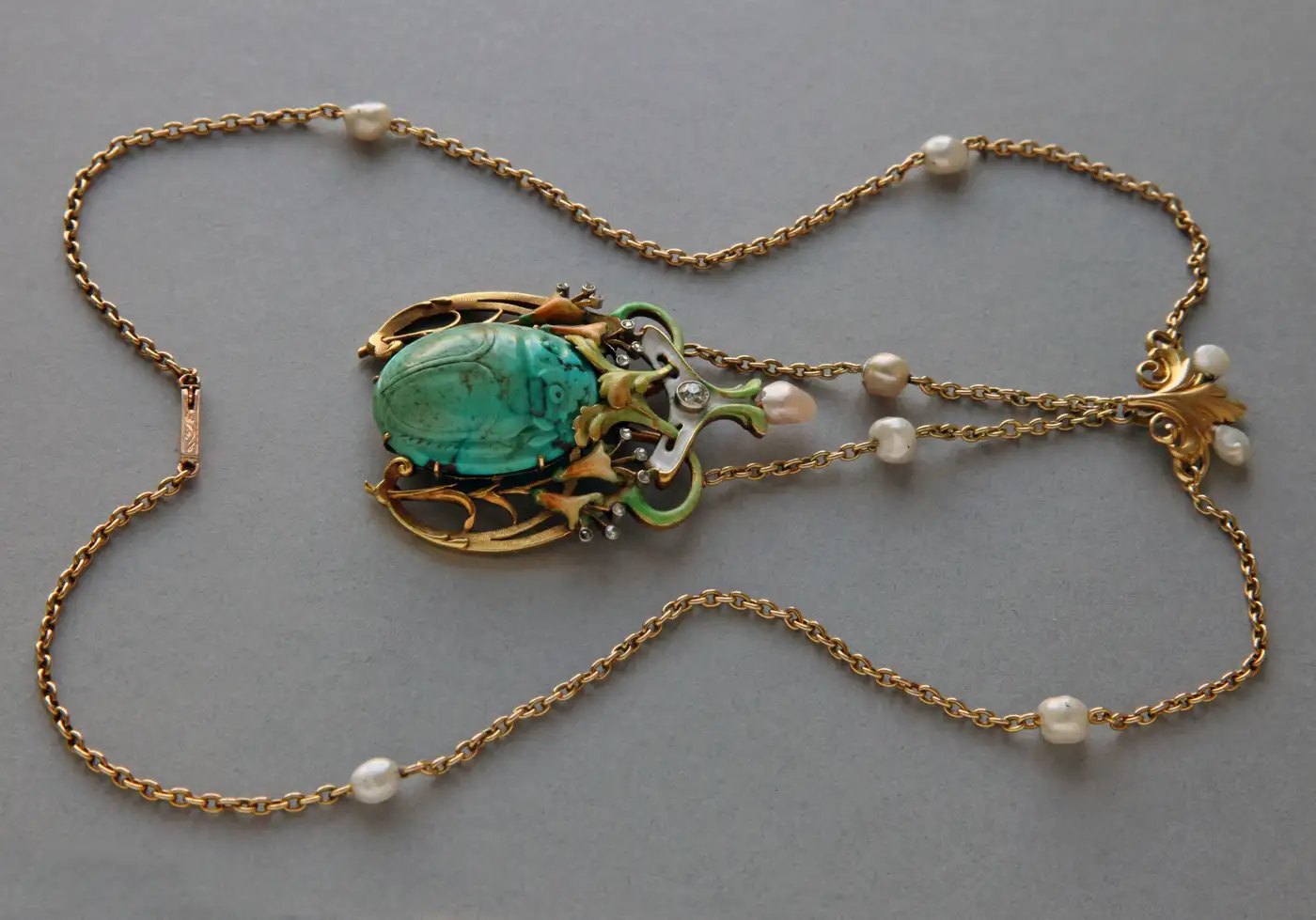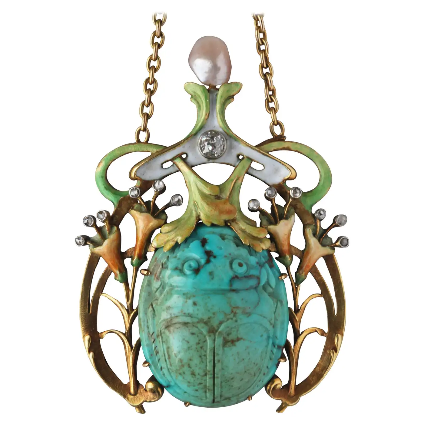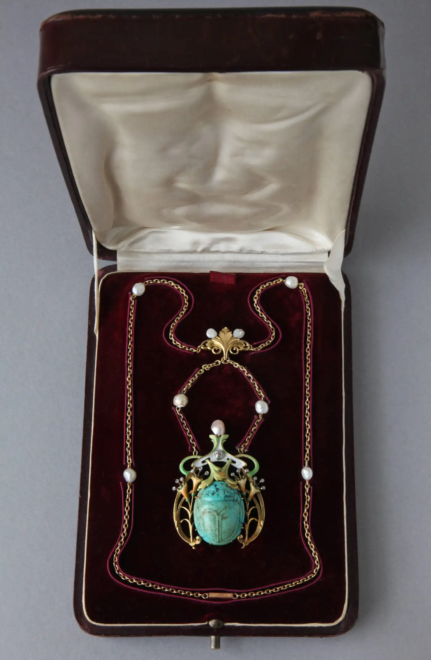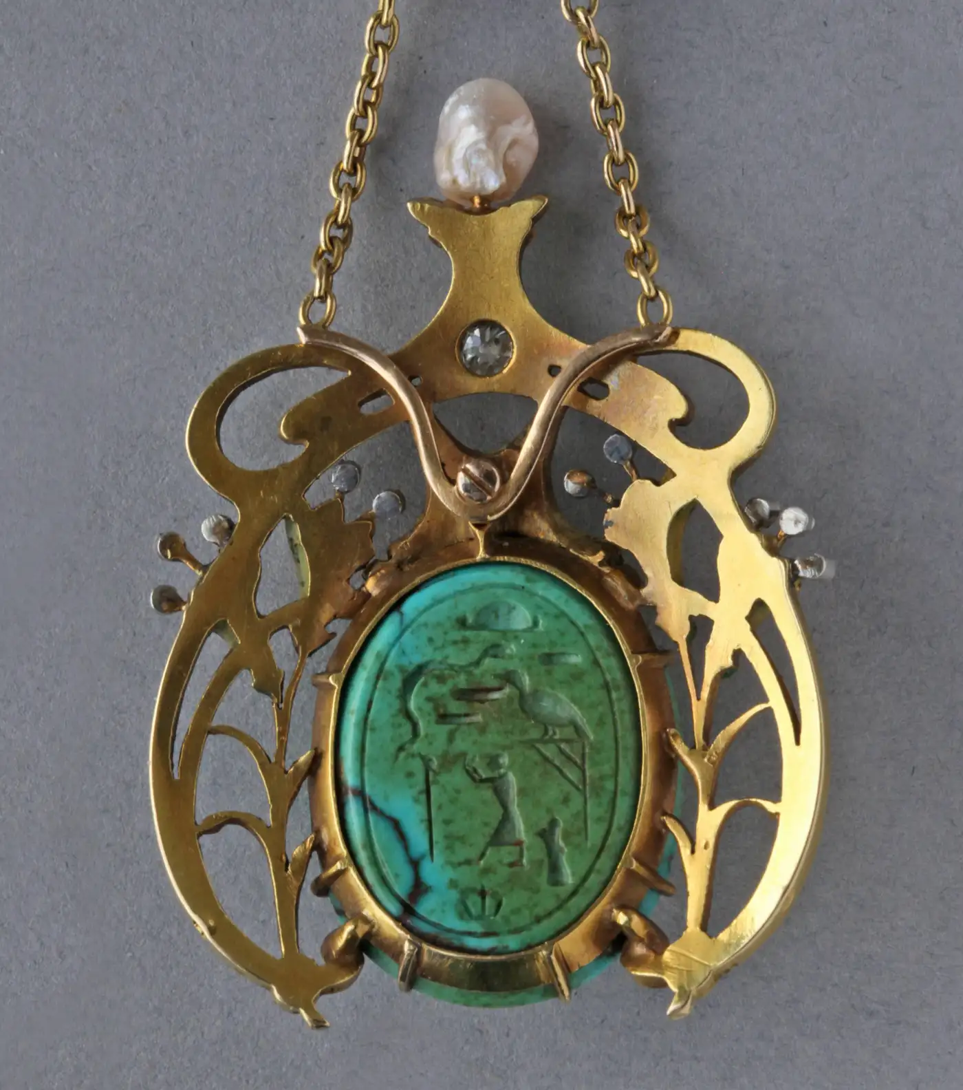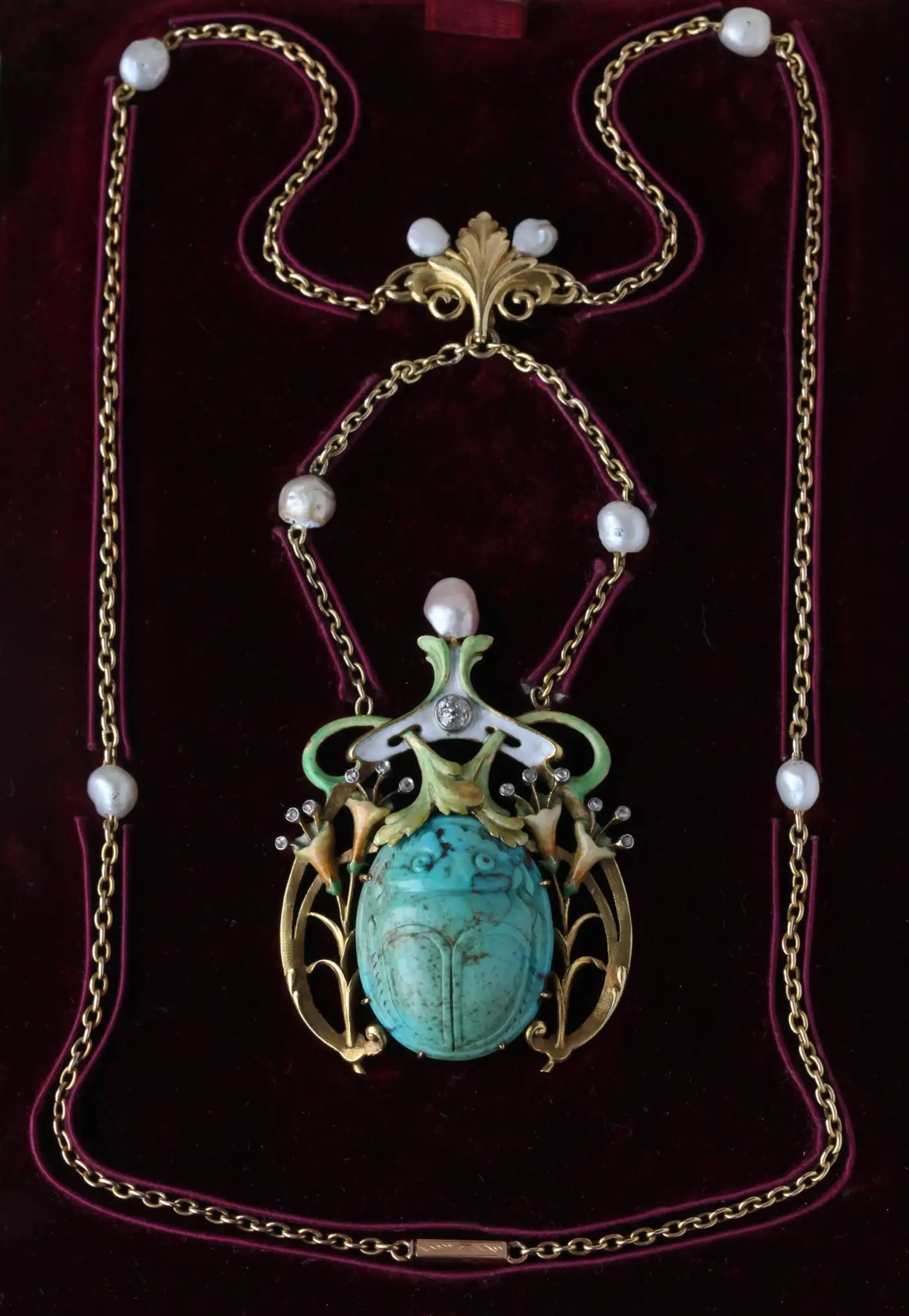 Illustrated in our book: Beatriz Chadour-Sampson & Sonya Newell-Smith, Tadema Gallery London Jewellery from the 1860s to 1960s, Arnoldsche Art Publishers, Stuttgart 2021, cat. no. 449 An exceptional & rare example of a fin de siècle necklace. Guillemin Frères created a marvellous jewel embracing the fusion of Art Nouveau and Egyptian Revival. Literature: cf. Henri Vever”s La Bijouterie Française au XIXe Siècle, translated by Katherine Purcell, p. 661, 662, 663 & 665.