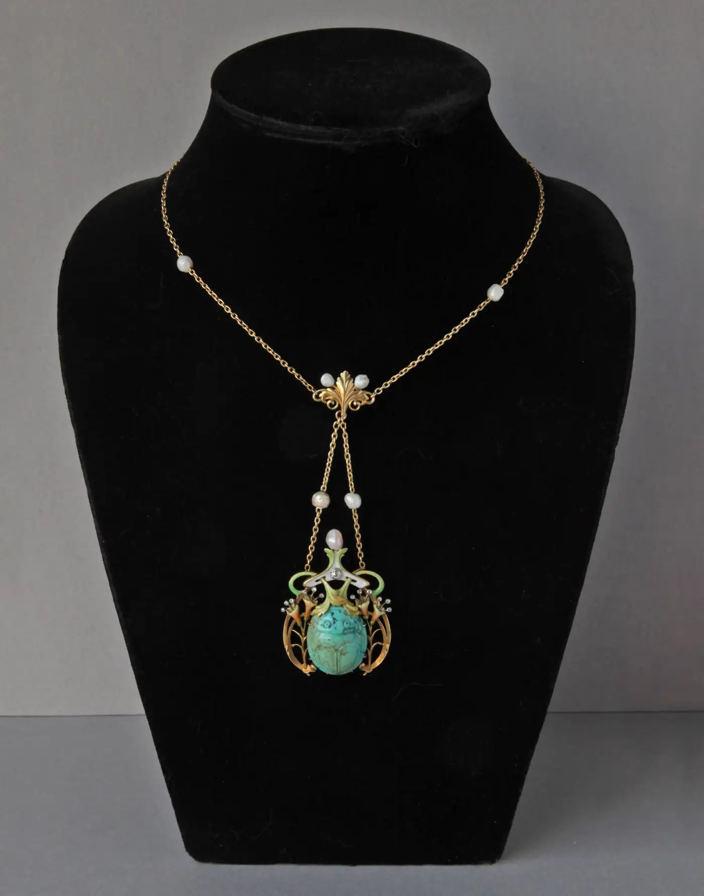 Guillemin Frères Fin de Siècle Enamel Turquoise Pearl Diamond Gold Necklace