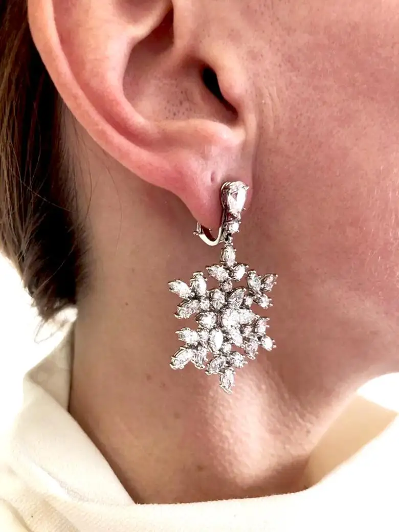 Diamond weight approx. 6.00 carats total. Measures approx. 1.80″ in overall length. Top measures approx. 0.20″ in width, with suspending snowflake measuring approx. 1.20″ in diameter, 0.20″ in height of the ear. Ear clips are currently for non-pierced ears, however, posts can be added for pierced ears. Removable silicon padding has been added to the clips for comfort.