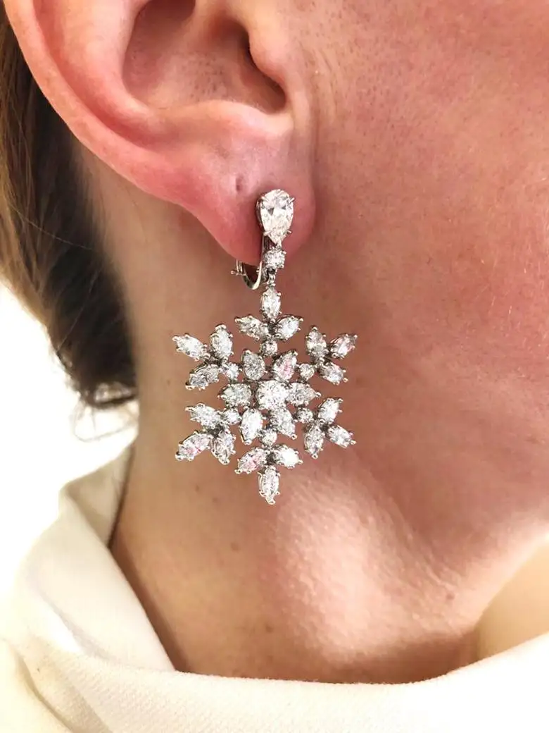 The recognisable Harry Winston Snowflake geometric clusters, with icy needles of marquise and round brilliant diamonds set in a slightly tiered form, suspended from pear-shaped droplets.