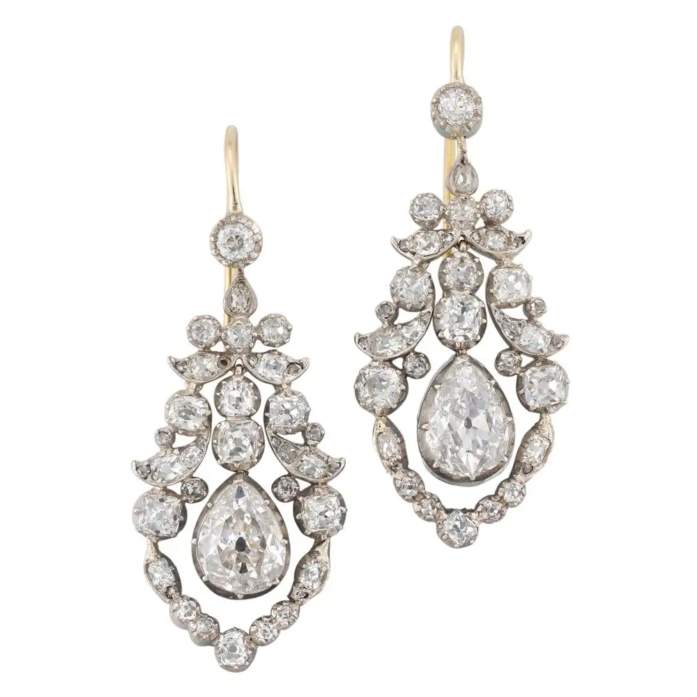 Unmarked tested as 18ct Gold and Silver. Late Georgian earrings in very good condition. A pair of exquisite antique diamond earrings from the collection of Bentley & Skinner, the London jewellers by appointment to both Her Majesty the Queen and His Royal Highness, the Prince of Wales. These ornate, yet refined earrings from the late-Georgian period are wonderfully designed around a remarkable three and a half carat pair of old-cut pear-shaped diamonds. Should you choose to make this purchase we will delighted to send it to you in a Bentley & Skinner handmade leather case packed in a gift-wrapped Bentley & Skinner black and gold presentation box. Shortly afterwards we will send you on a valuation for insurance purposes for your reference and safekeeping.