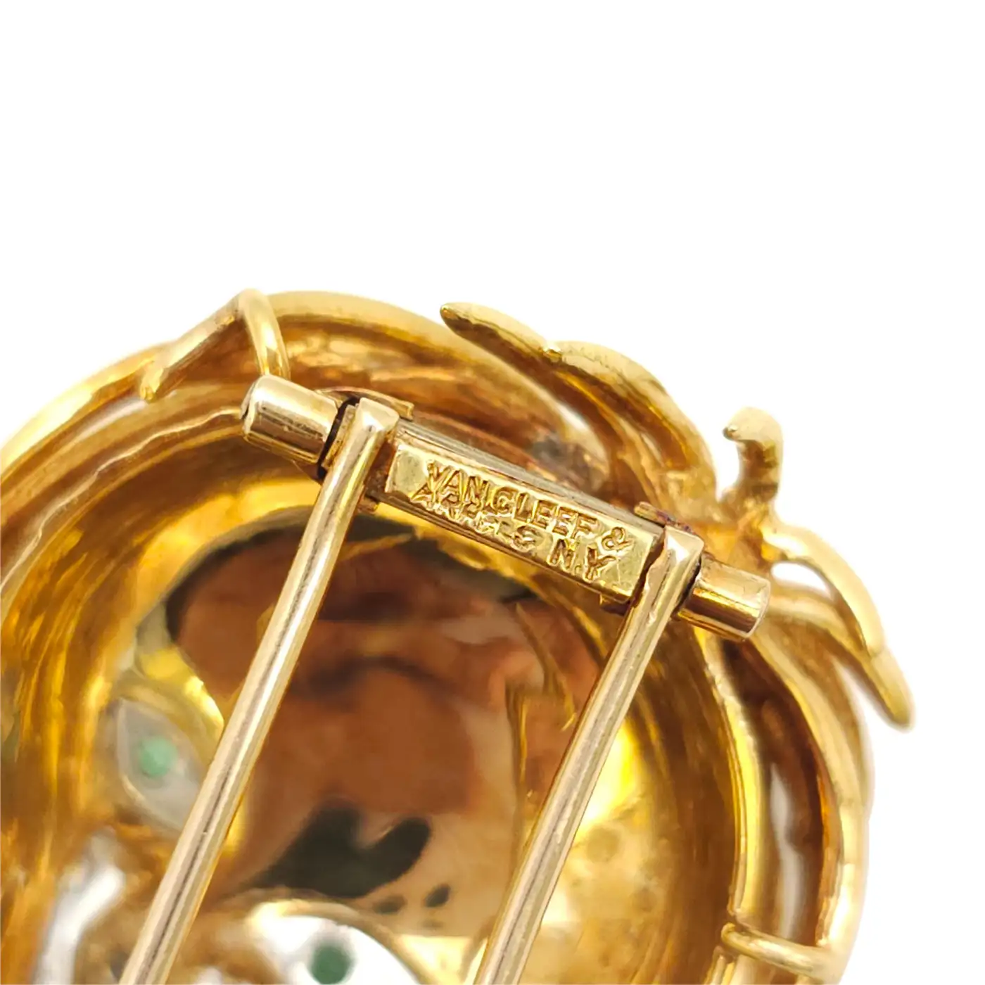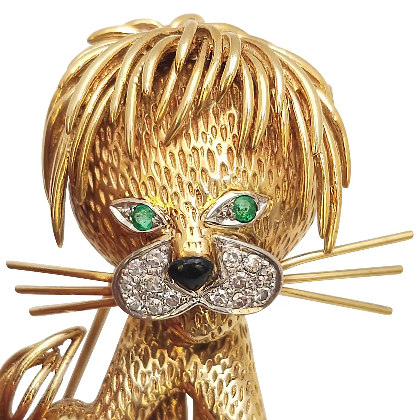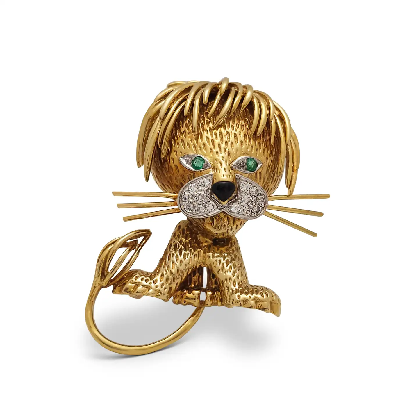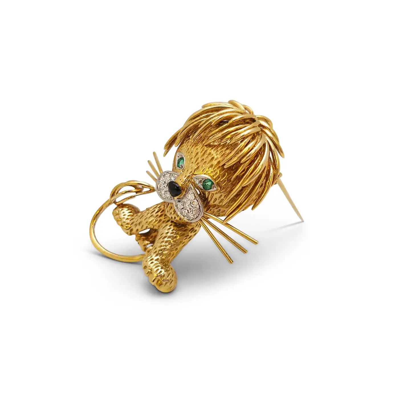 Authentic Van Cleef & Arpels ‘Lion Ebouriffé’ brooch crafted in 18 karat yellow gold. The iconic design depicts a lion with a playfully tousled mane, lively emerald eyes, onyx nose, and diamond muzzle of approximately .14 carats total. The brooch measures 1.80 inches in length and 1.23 inches in width. Signed Van Cleef & Arpels N.Y, 18k with serial number and hallmarks.
