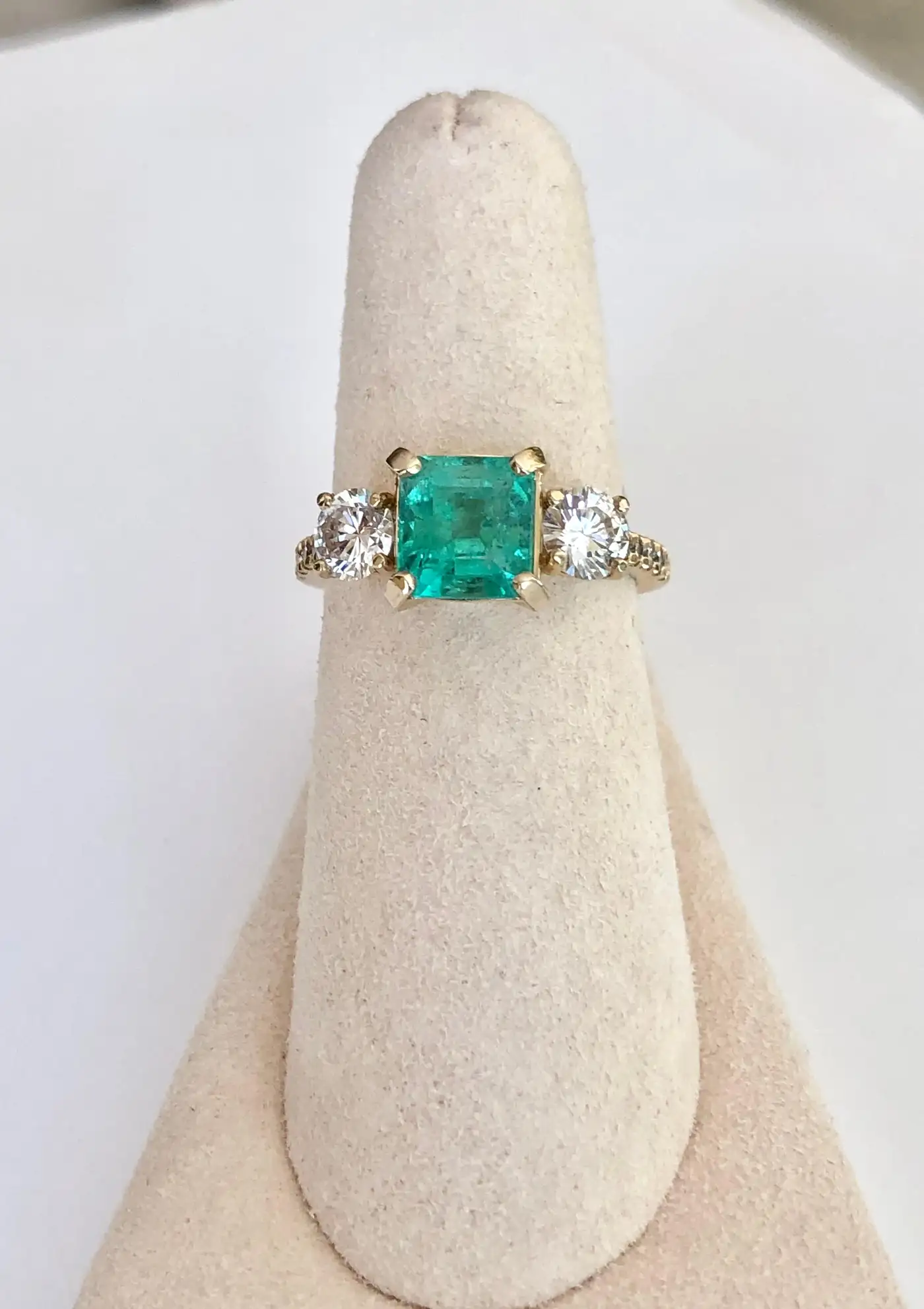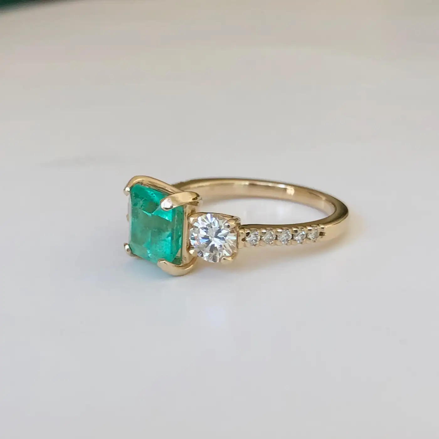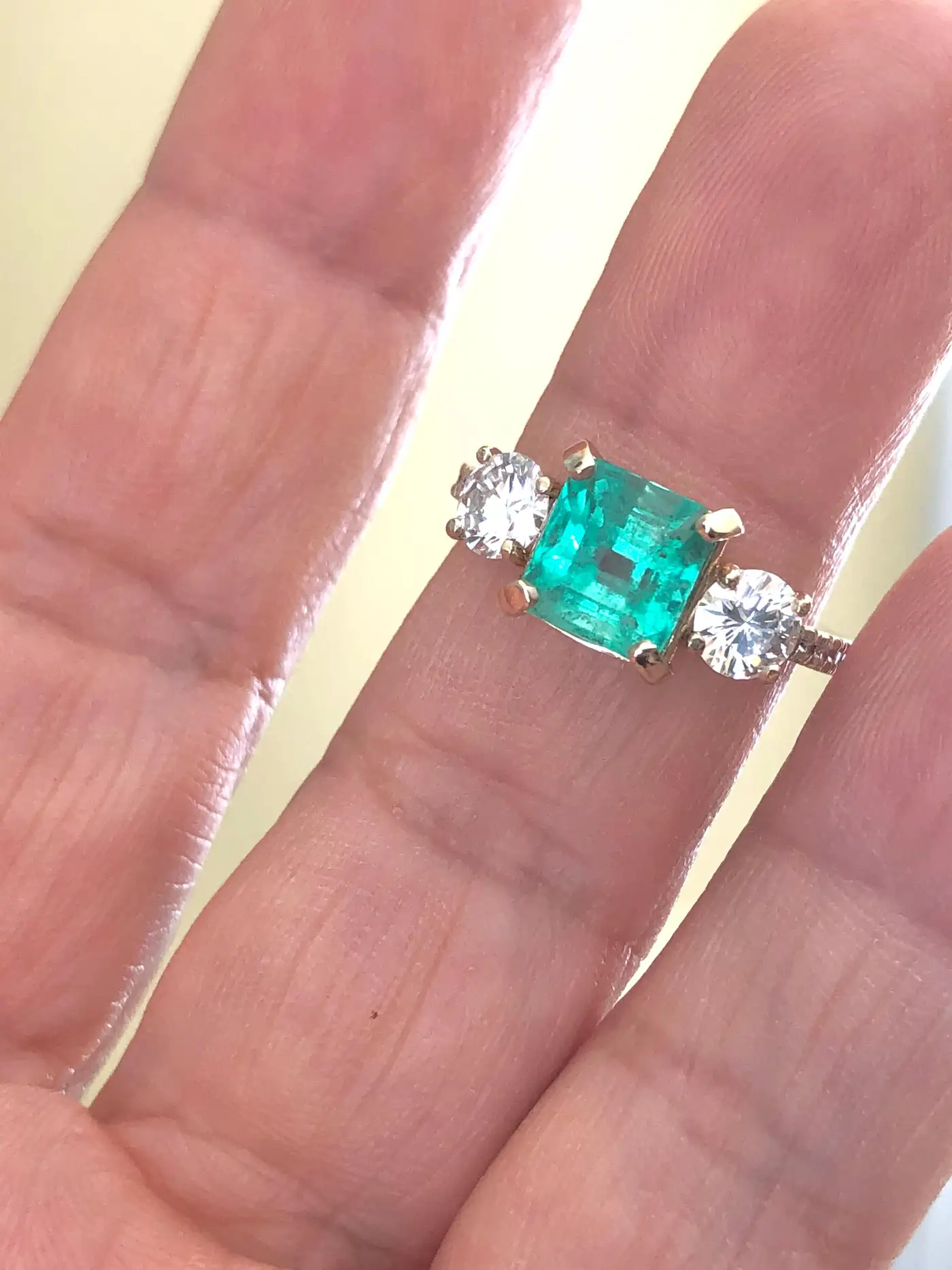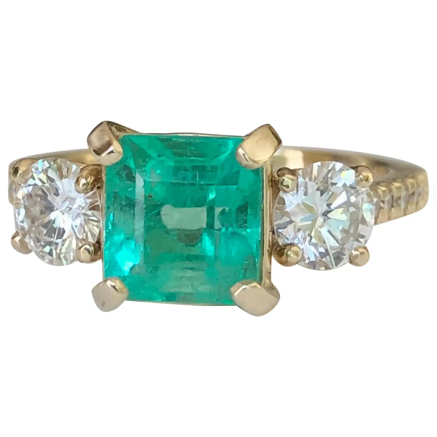Natural Colombian Emerald & Round Brilliant Cut Diamond Engagement Ring Yellow Gold Natural Colombian Emerald, Emerald Cut, Colour/Clarity: Medium Light Green/ Clarity VS. Total Emerald Weight: 1.84 carats (7.38mmx7.15mm). Second Stone: Two Diamonds Round Brilliant Cut, 0.83ct G/VS2 and 10 small round brilliant cut diamonds G/VS2 on the sides adding 0.15ct. Totaling Diamond Weight: 0.98 Carat Total Gemstone Weight: 2.82 Carats Ring Measurement: 16.50mm x 7.80mm, rising 6.20mm above the finger Composition: 14k Yellow Gold Total Ring Weight: 4.3g Ring Size: 7 Classic Style Condition: New-Excellent Condition Comments: 100% NATURAL.